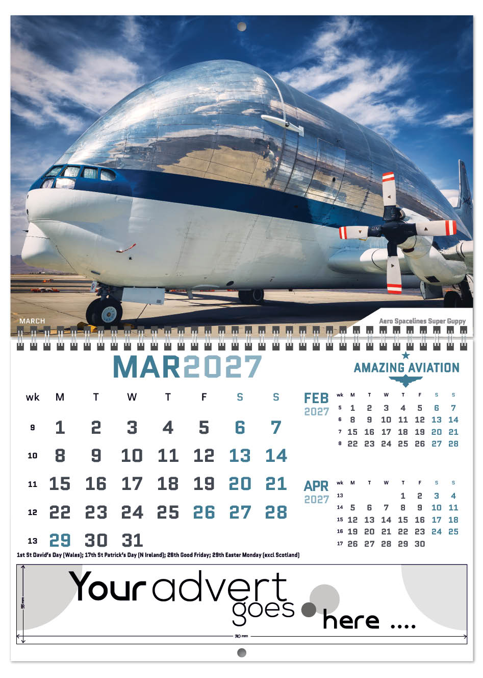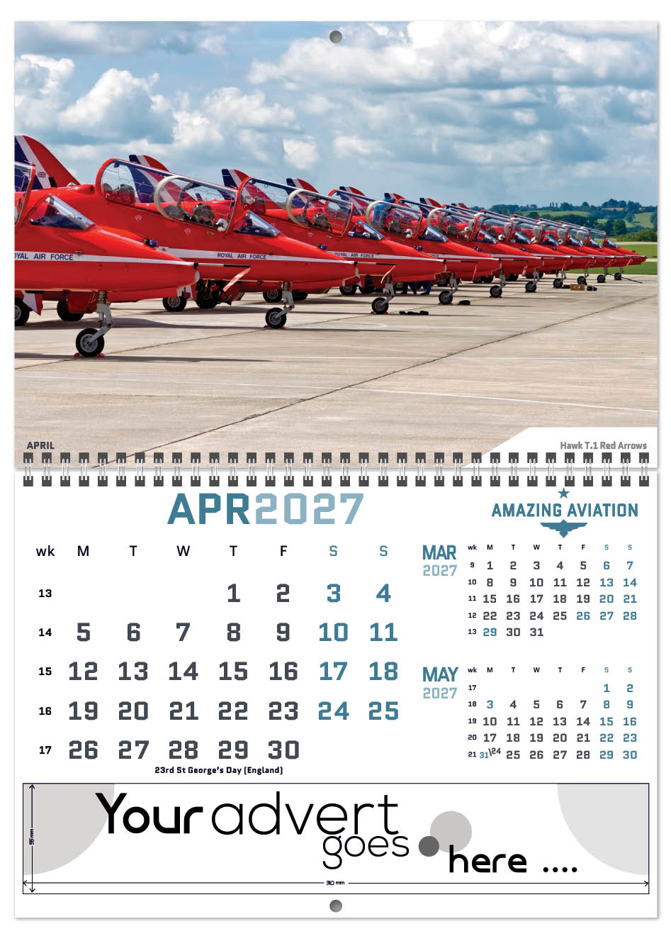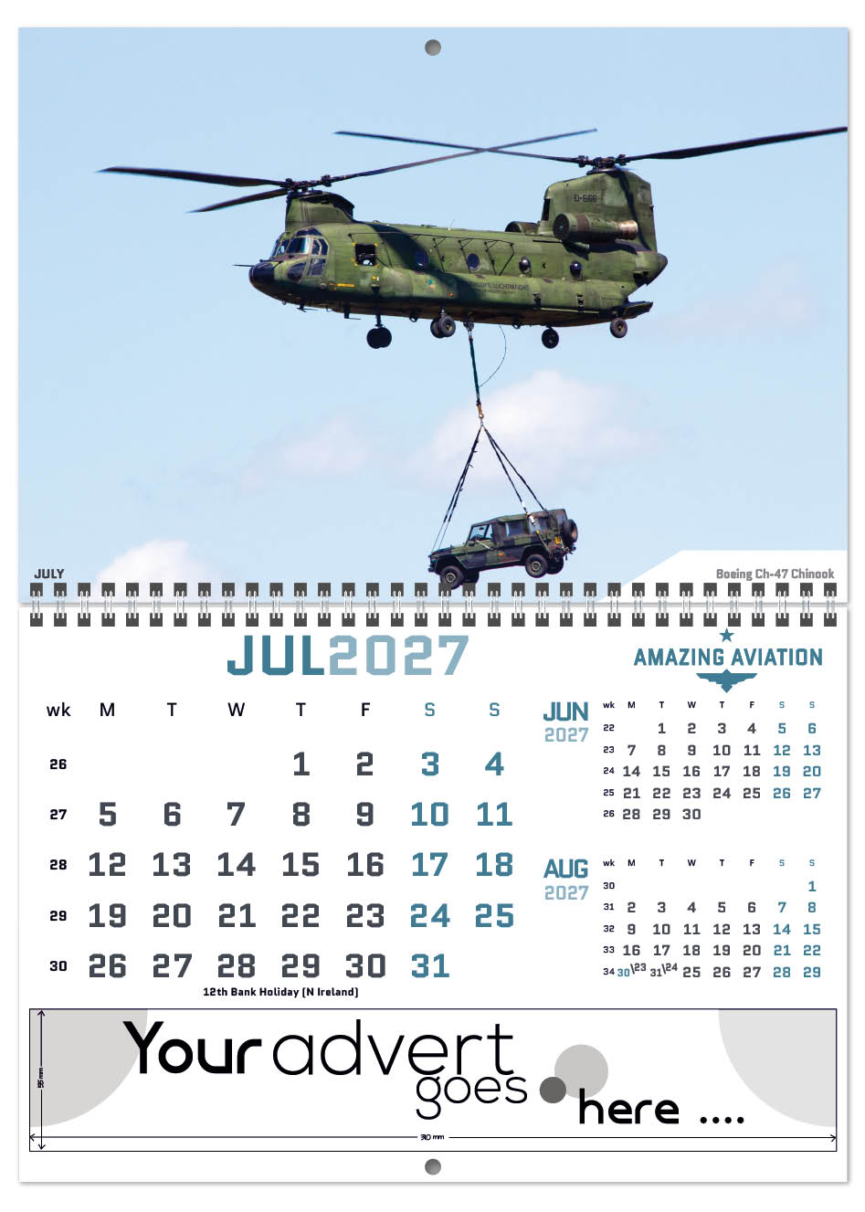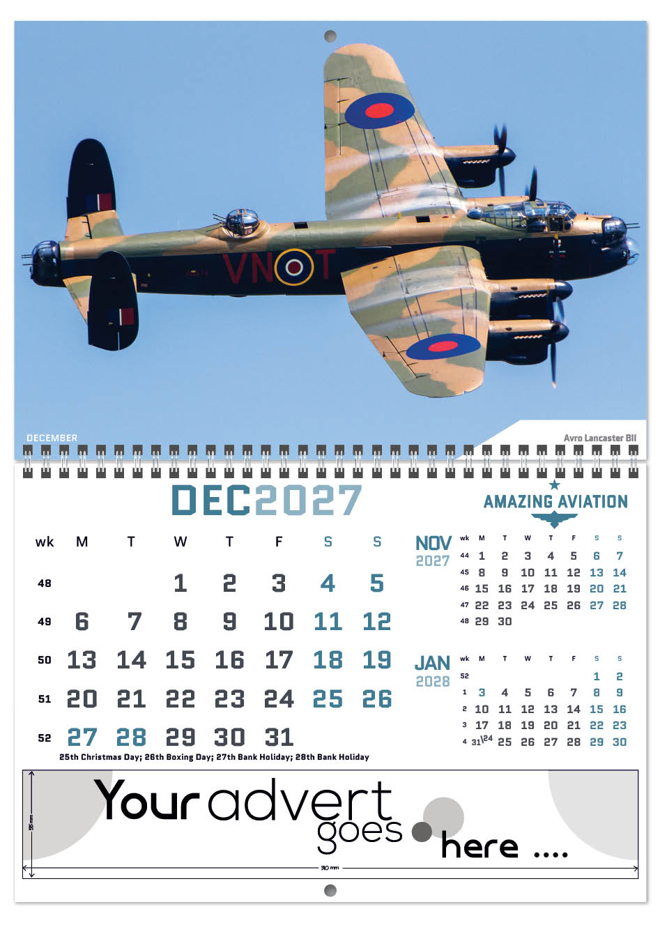 Each calendar comes with an advert section. It is this section that we replace with your personalised company advert that either we design for you, or you supply to us. This section can be seen on our range’s images titled “Your advert goes here”.