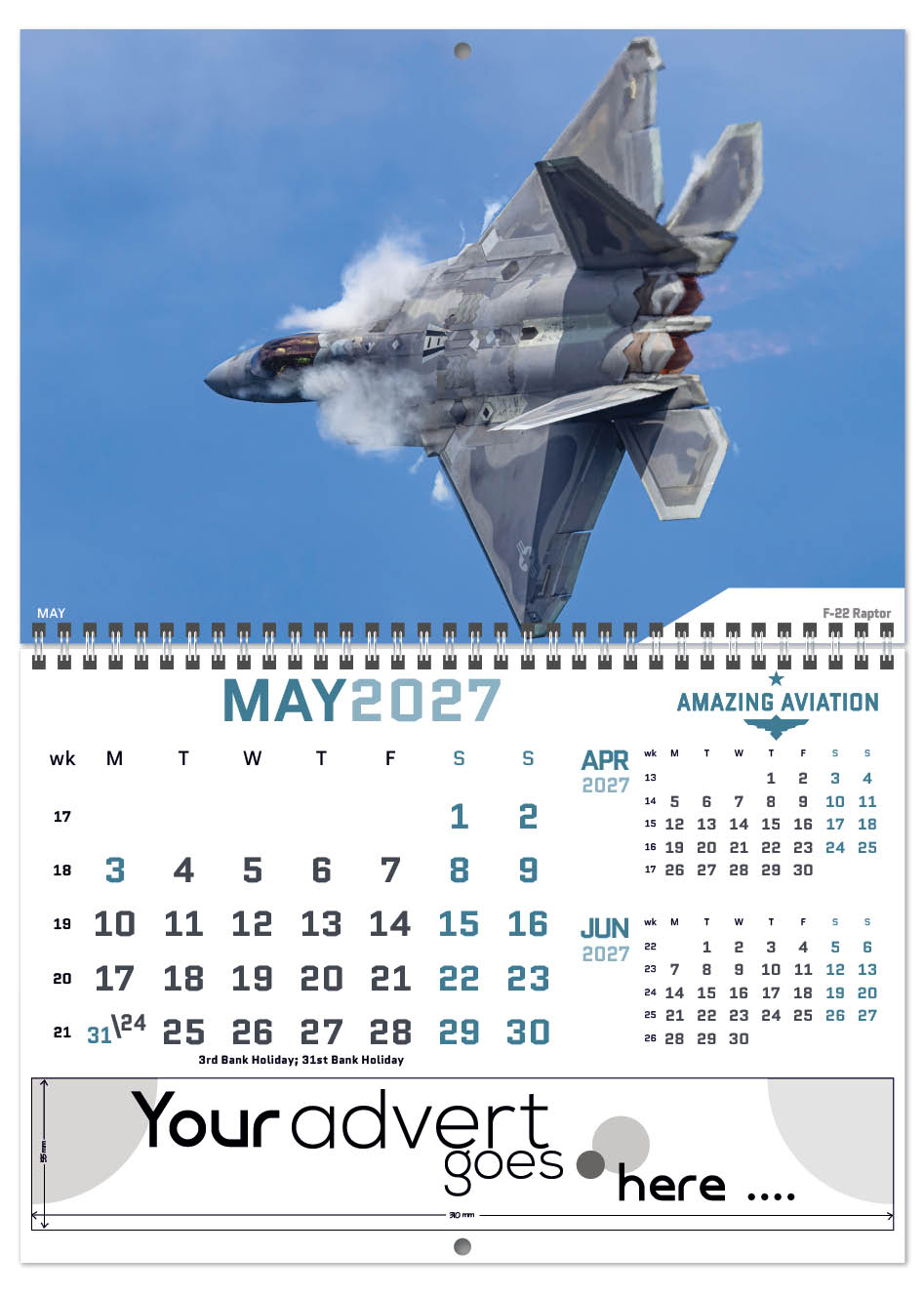 Our Deluxe Central Wiro range of calendars is designed to save you postage whilst still having a premium varnished calendar. When folded they fit into a Royal Mail ‘Large letter’ sized envelope so the saving on postage is substantial. Aviation fans and enthusiasts will find this calendar just the ticket. It has a modern contemporary feel with the aviation images a bit different from the normal aviation images. From helicopters to fighter jets and commercial aircraft, the range of aircraft is extensive.
