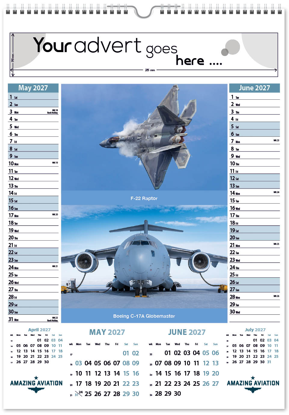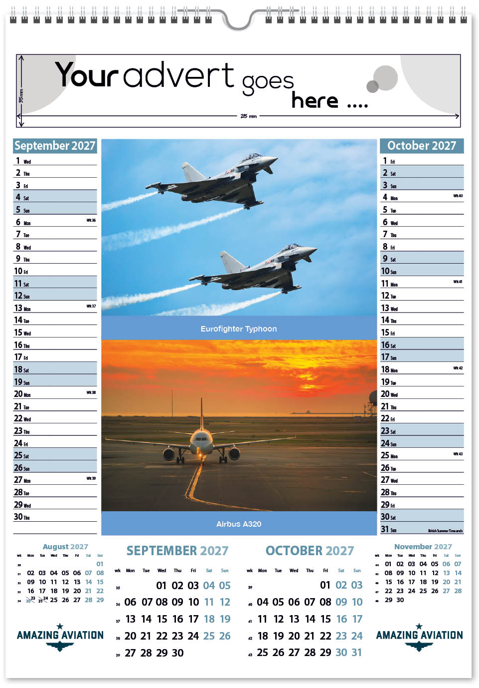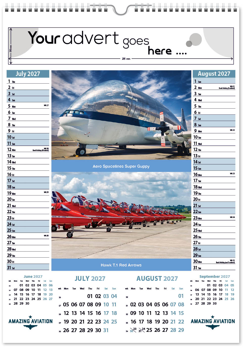 Each calendar comes with an advert section. It is this section that we replace with your personalised company advert that either we design for you, or you supply to us. This section can be seen on our range’s images titled “Your advert goes here”.