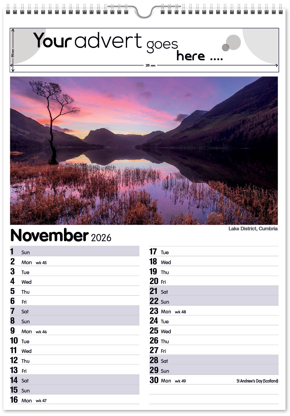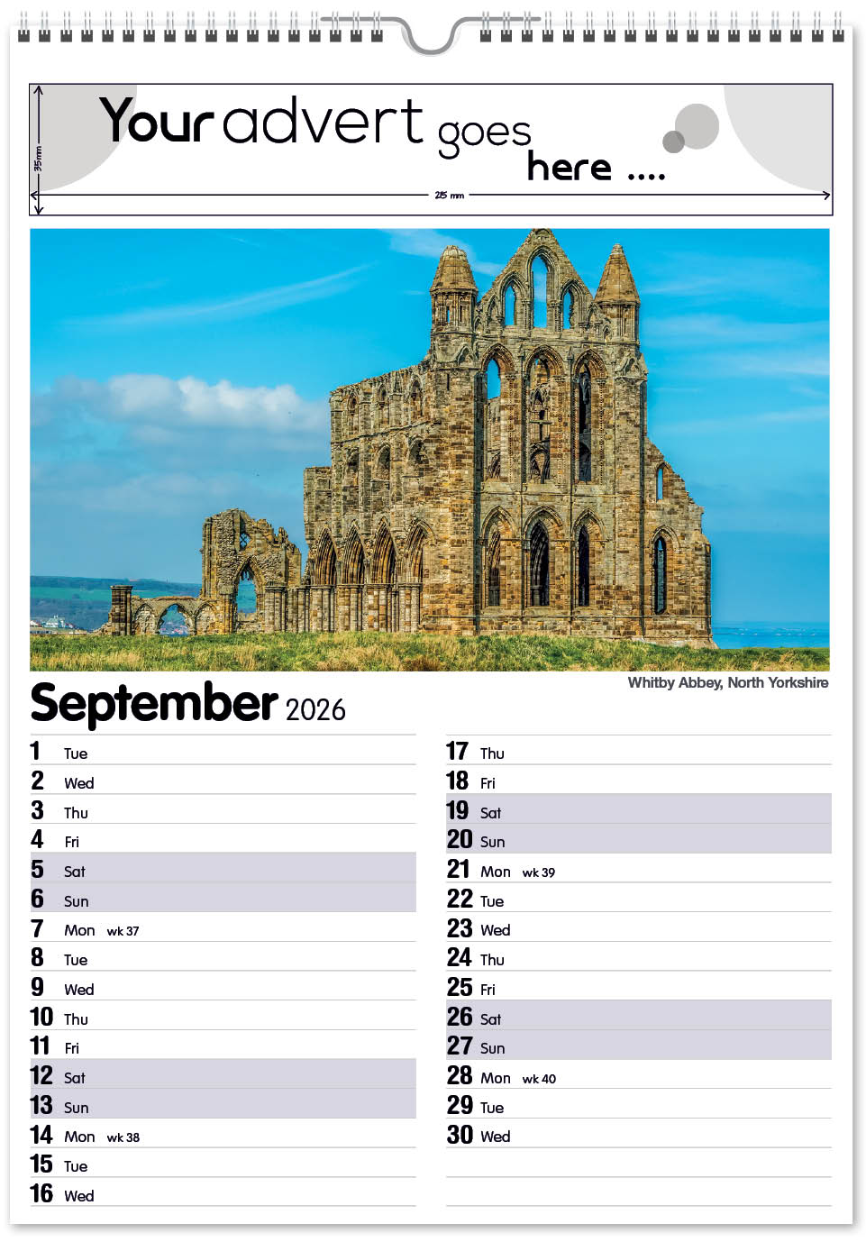 Each calendar comes with an advert section. It is this section that we replace with your personalised company advert that either we design for you, or you supply to us. This section can be seen on our range’s images titled “Your advert goes here”.