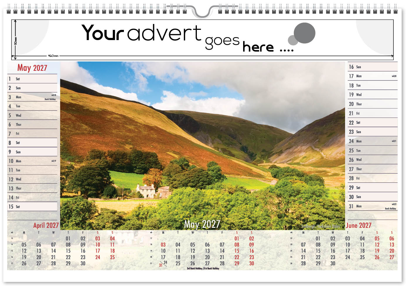 Each calendar comes with an advert section. It is this section that we replace with your personalised company advert that either we design for you, or you supply to us. This section can be seen on our range’s images titled “Your advert goes here”.