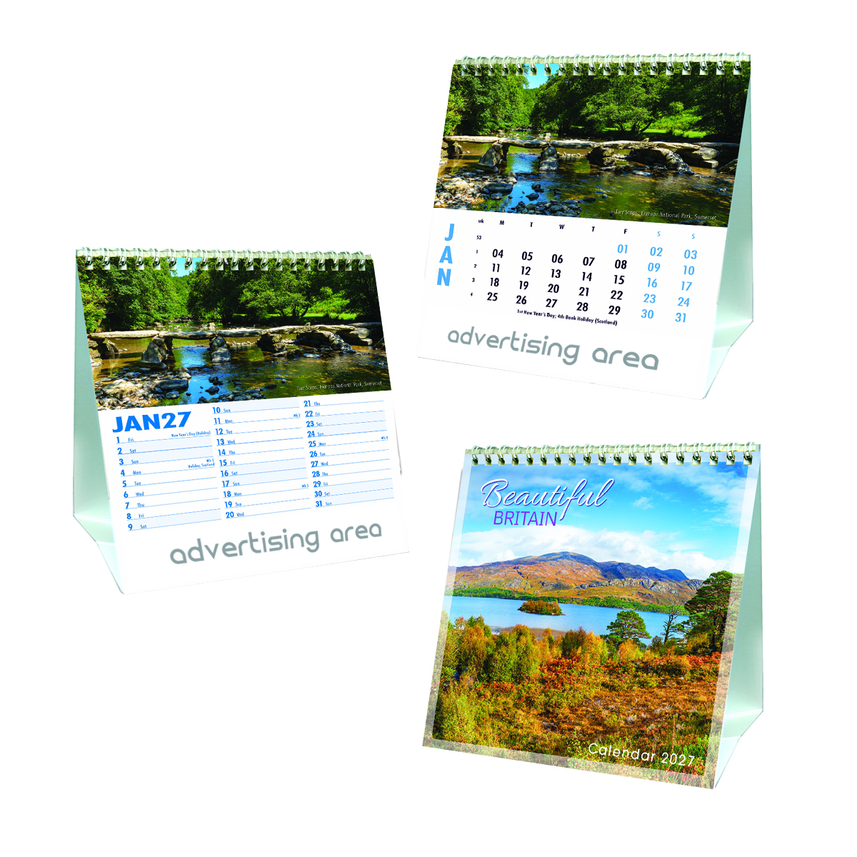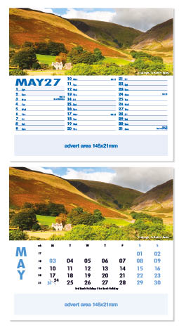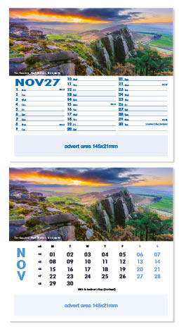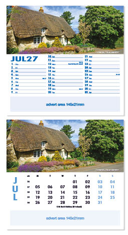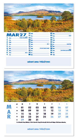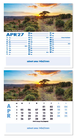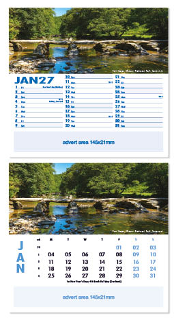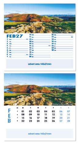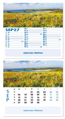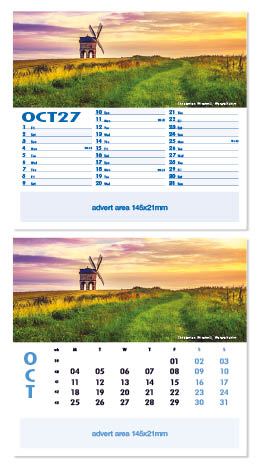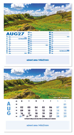 Each calendar comes with an advert section. It is this section that we replace with your personalised company advert that either we design for you, or you supply to us. This section can be seen on our range’s images titled “Your advert goes here”.