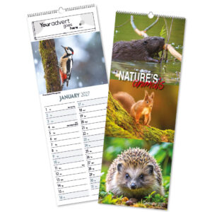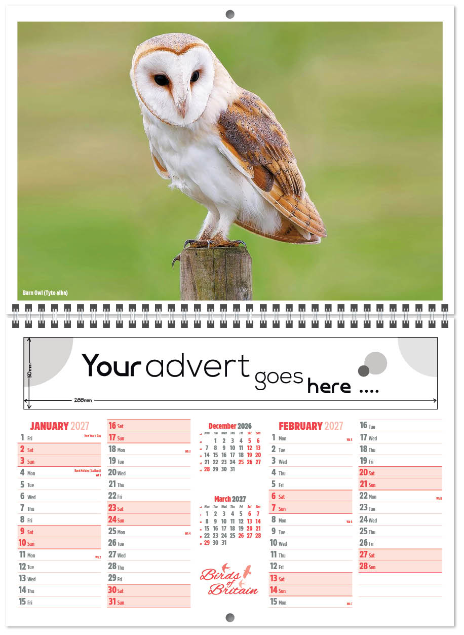 The Birds of Britain Central Wiro calendar features a selection of our native birds in their natural environment. All in an economical Royal Mail ‘Large Letter’ size to save on postage, but opens to a full size calendar.
