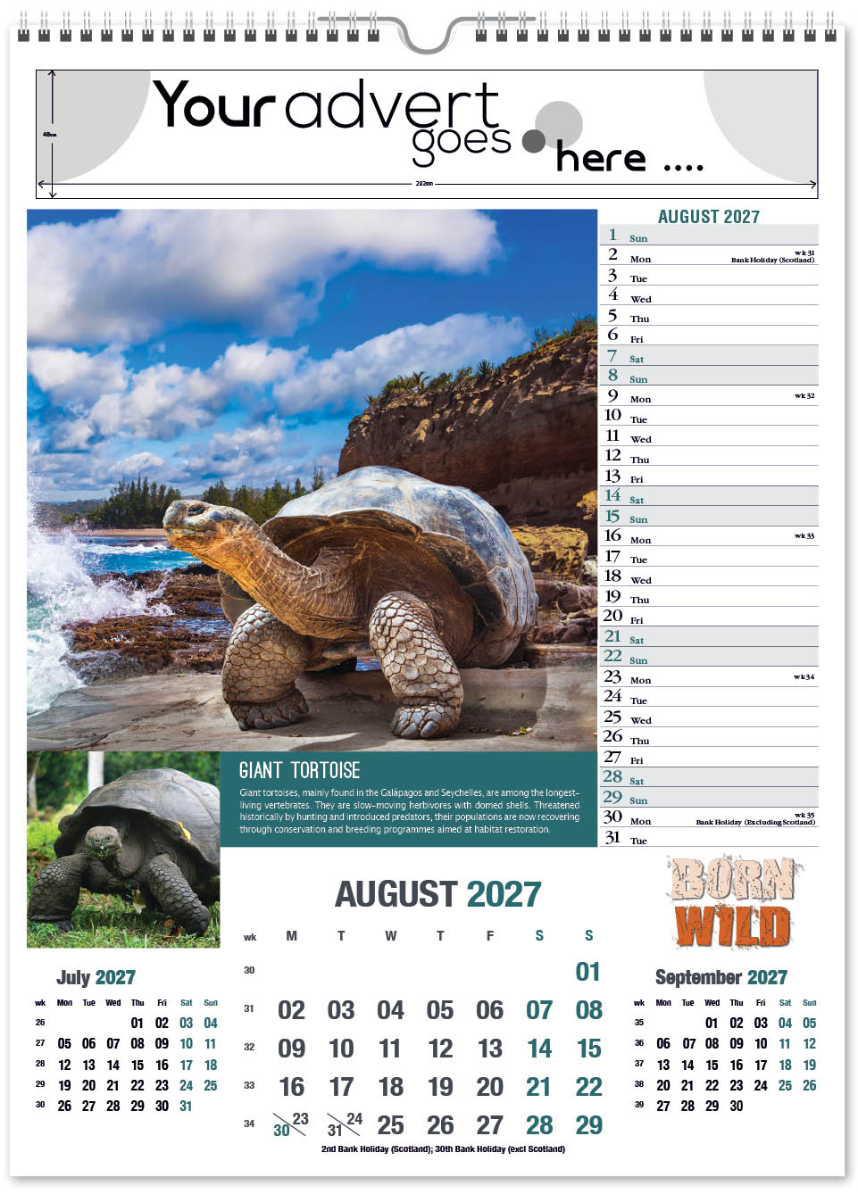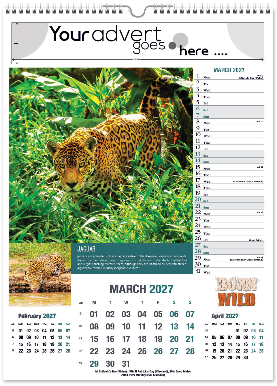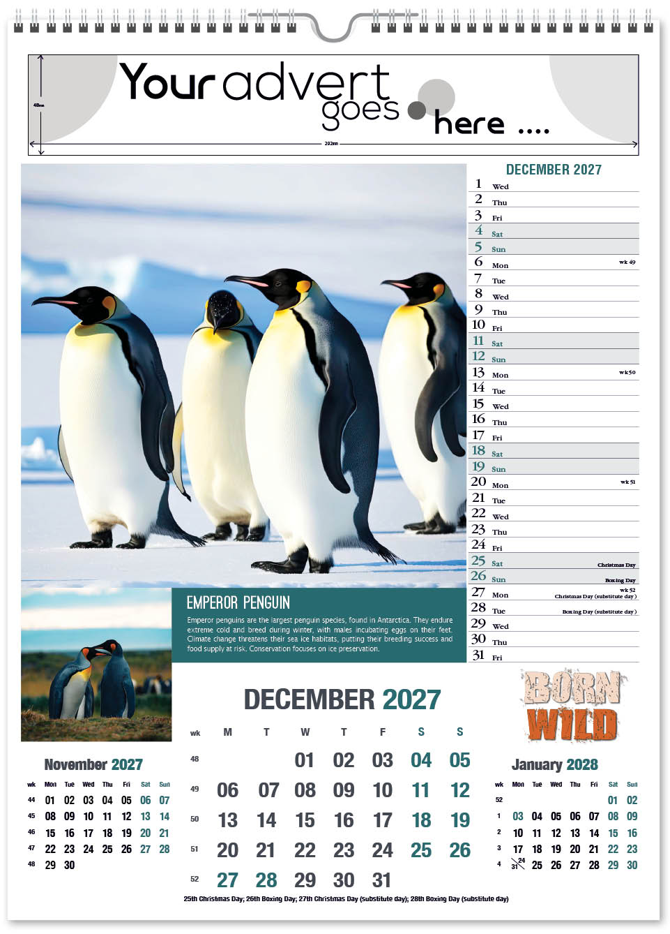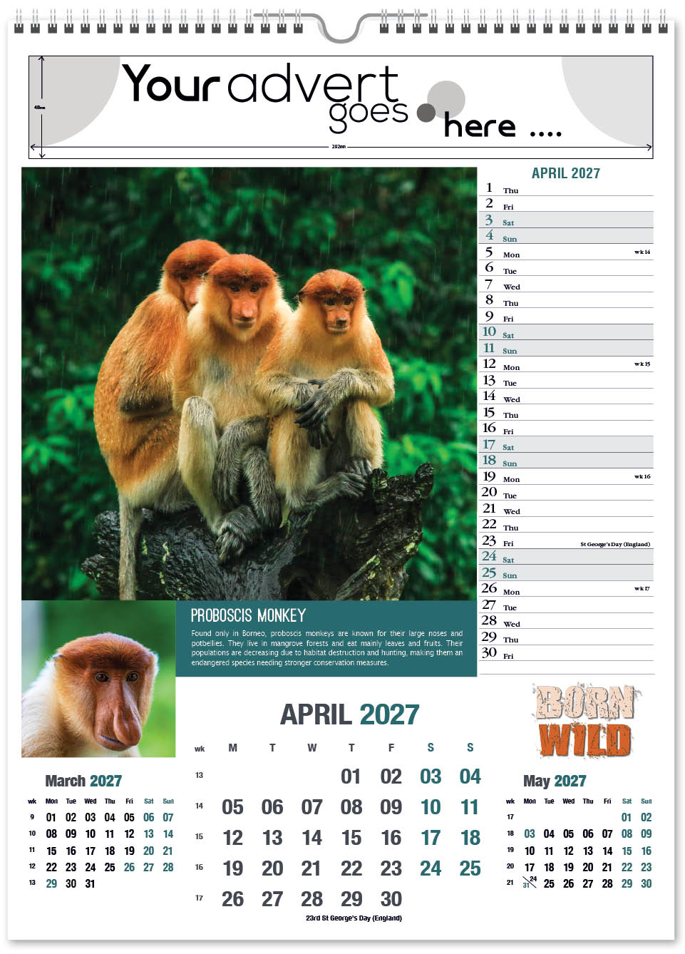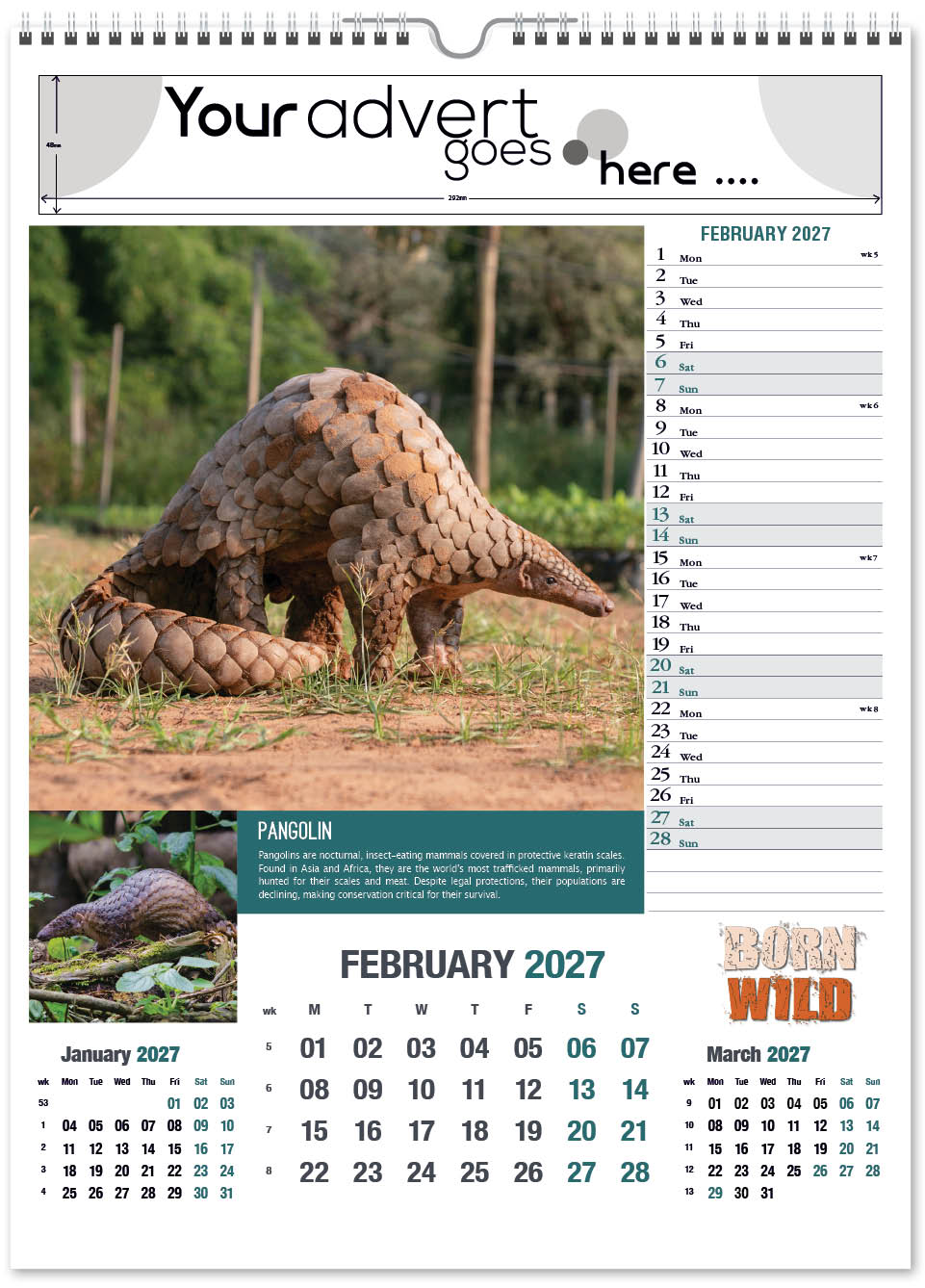 The Born Wild portrait calendar features cute and interesting animals from around the world. It contains a complementary inset image and an informative paragraph about their behaviour and habitat. The image area is large, capturing the animal in detail, and drawing eyes towards your company advert. It also has a varnished cover.