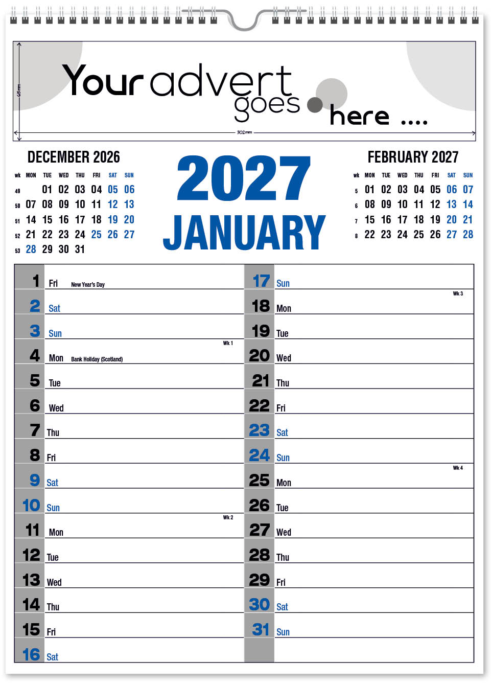 Each calendar comes with an advert section. It is this section that we replace with your personalised company advert that either we design for you, or you supply to us. This section can be seen on our range’s images titled “Your advert goes here”.