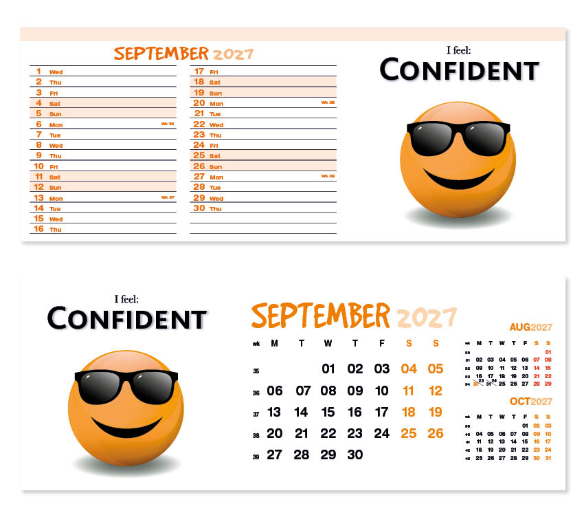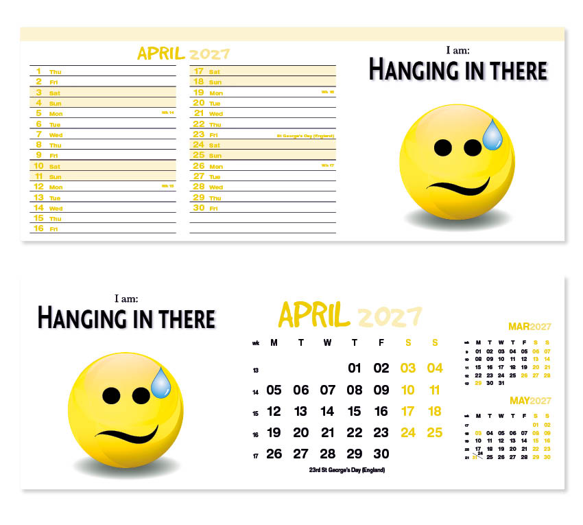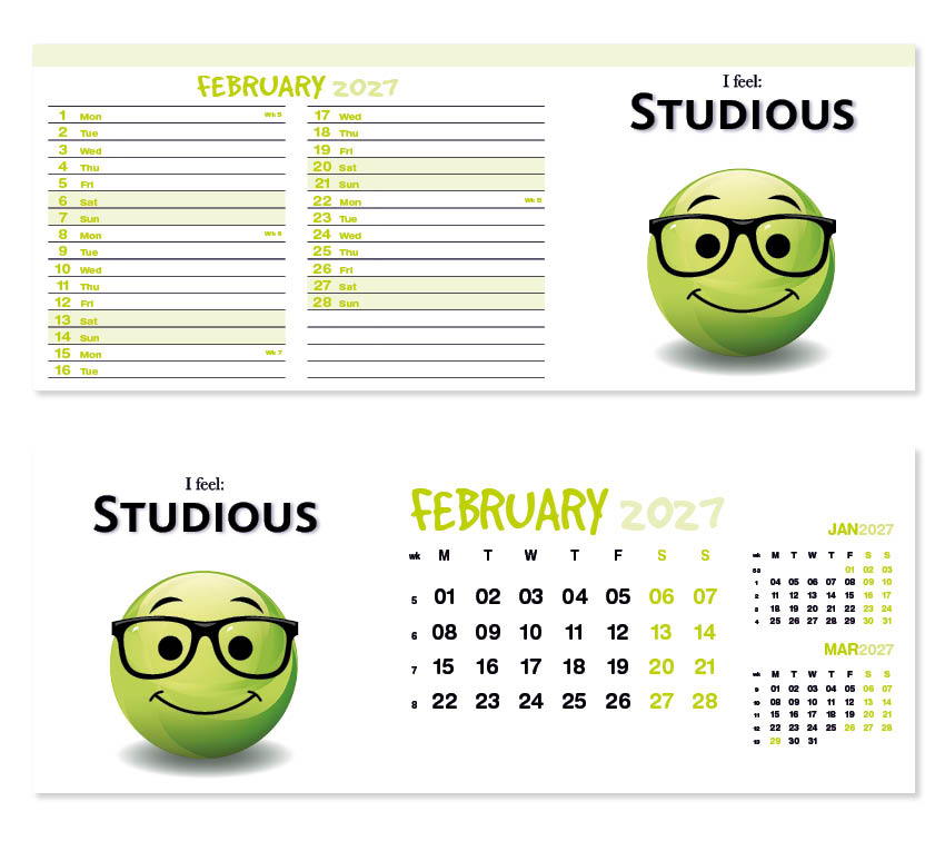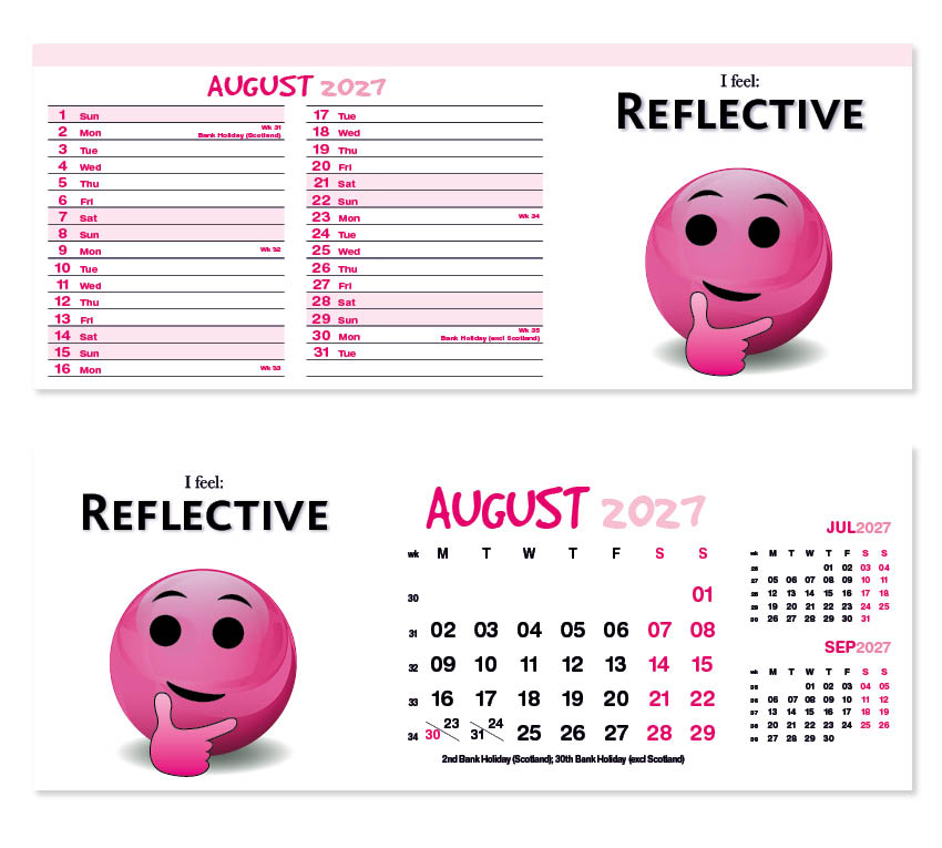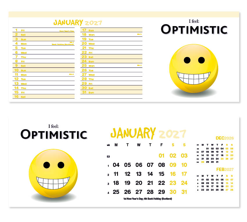 What is your mood today? This fun desk calendar will raise a smile or two. The left side Emoji image turns independently from the right side date section so you can change your mood or status as often as you please. Are you ‘In a meeting’ or ‘On Holiday’; are you ‘Productive’ or ‘Unamused’ – let the office know what you’re feeling or doing! Your customers’ will love this fun calendar, and it fits into a Royal Mail ‘Large Letter’ size envelope so you are saving on postage as well. All desk calendars are printed on both sides, each side in a different format – either a simple date pad or a space for notes and appointments.