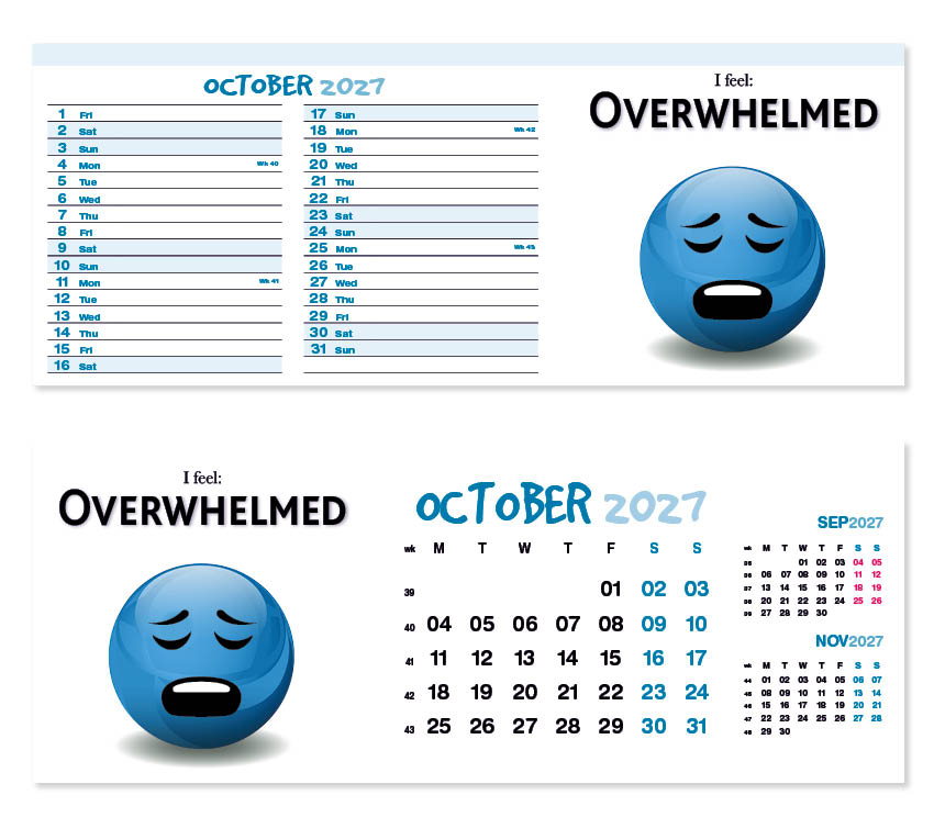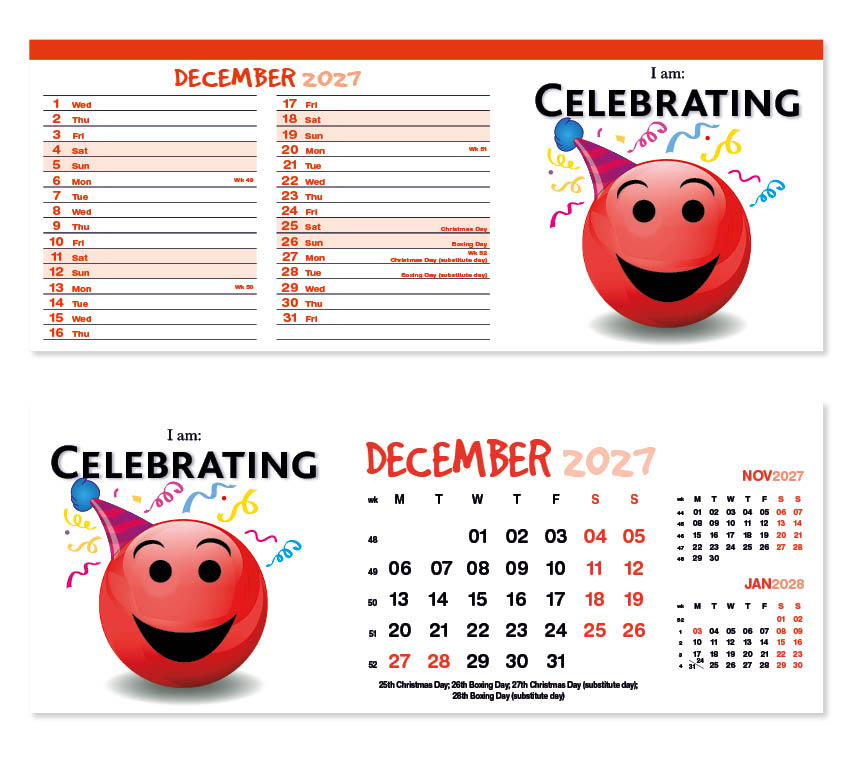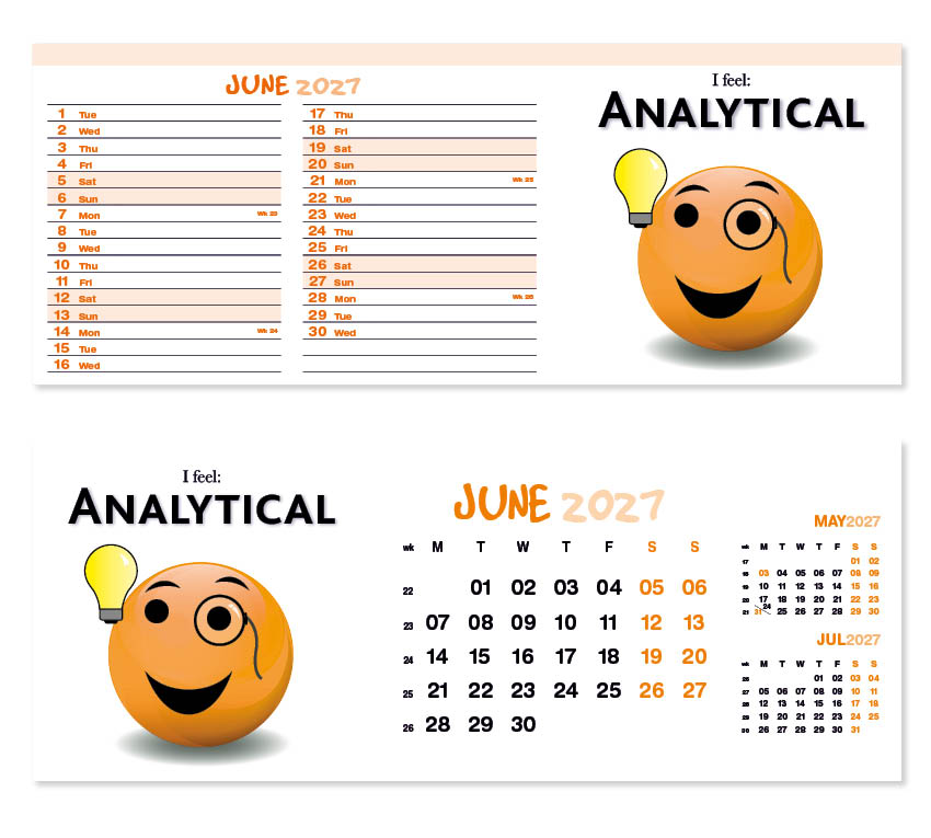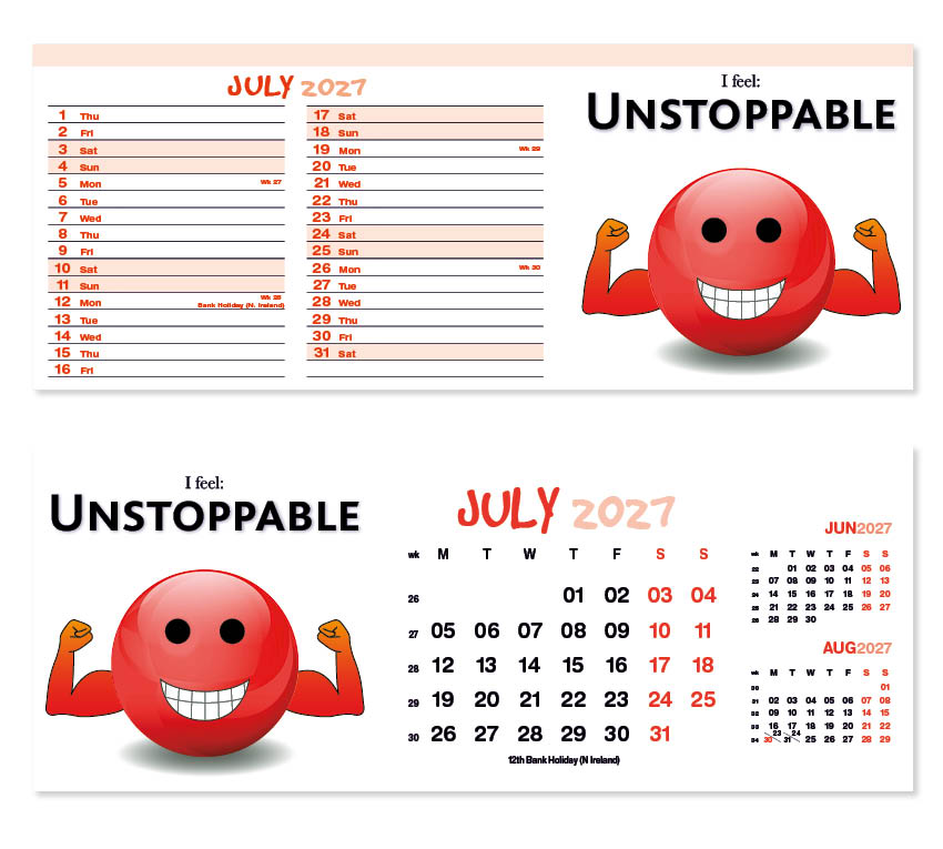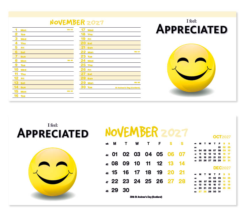 What is your mood today? This fun desk calendar will raise a smile or two. The left side Emoji image turns independently from the right side date section so you can change your mood or status as often as you please. Are you ‘In a meeting’ or ‘On Holiday’; are you ‘Productive’ or ‘Unamused’ – let the office know what you’re feeling or doing! Your customers’ will love this fun calendar, and it fits into a Royal Mail ‘Large Letter’ size envelope so you are saving on postage as well. All desk calendars are printed on both sides, each side in a different format – either a simple date pad or a space for notes and appointments.