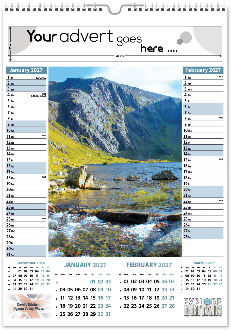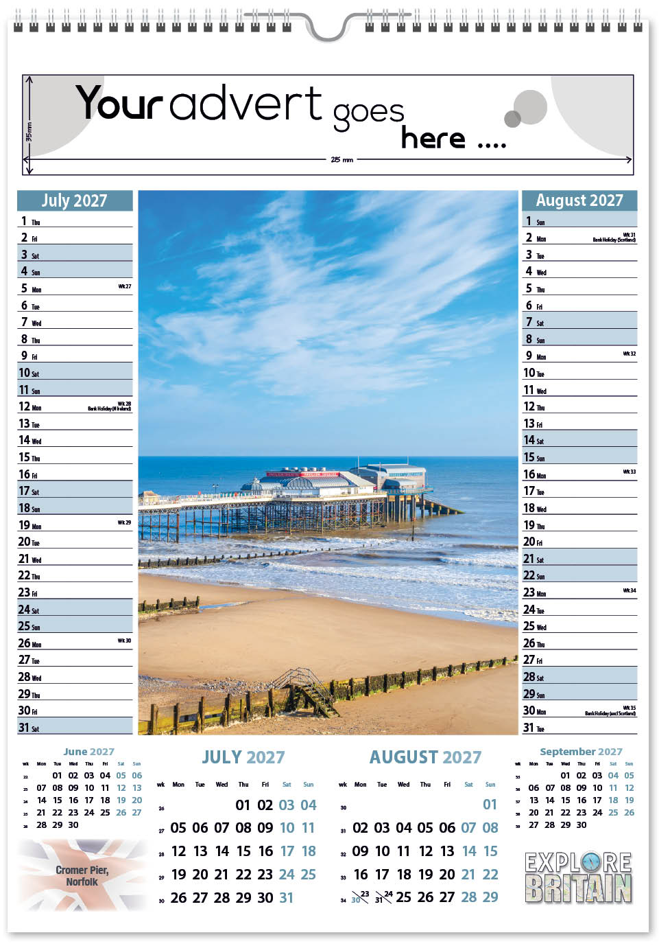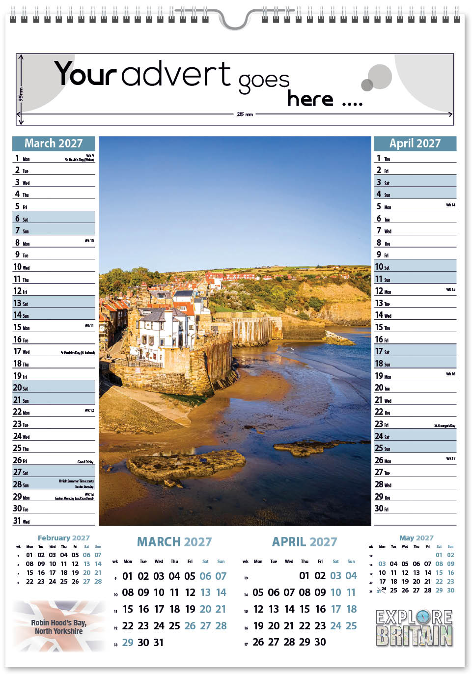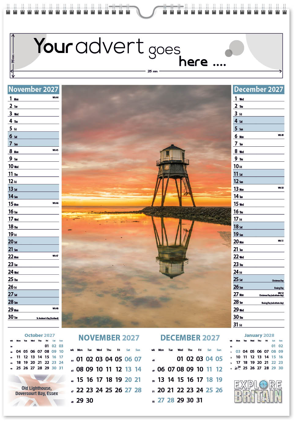Each calendar comes with an advert section. It is this section that we replace with your personalised company advert that either we design for you, or you supply to us. This section can be seen on our range’s images titled “Your advert goes here”.