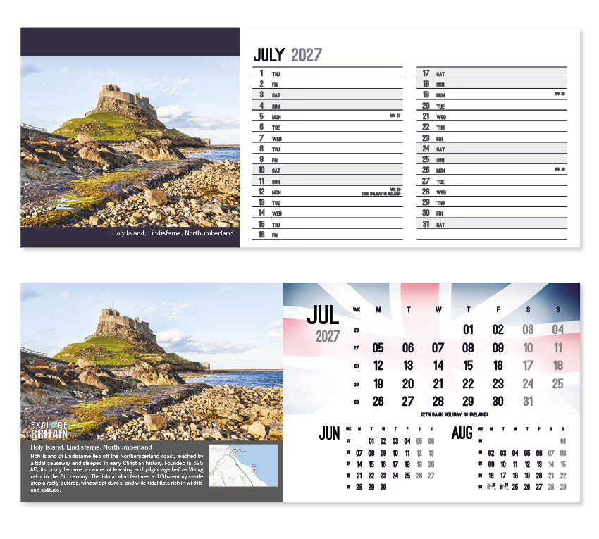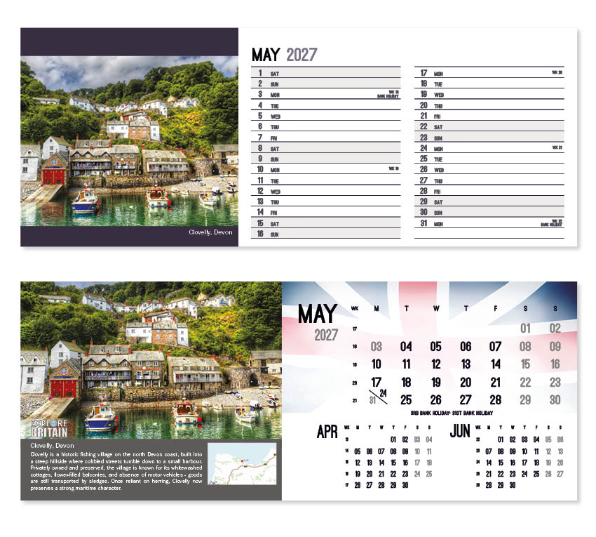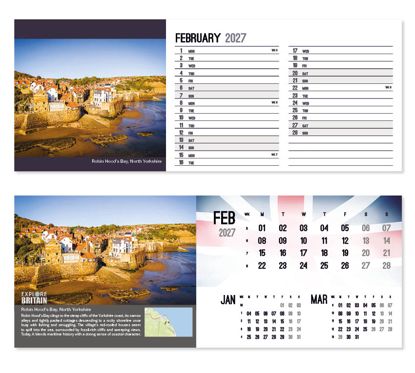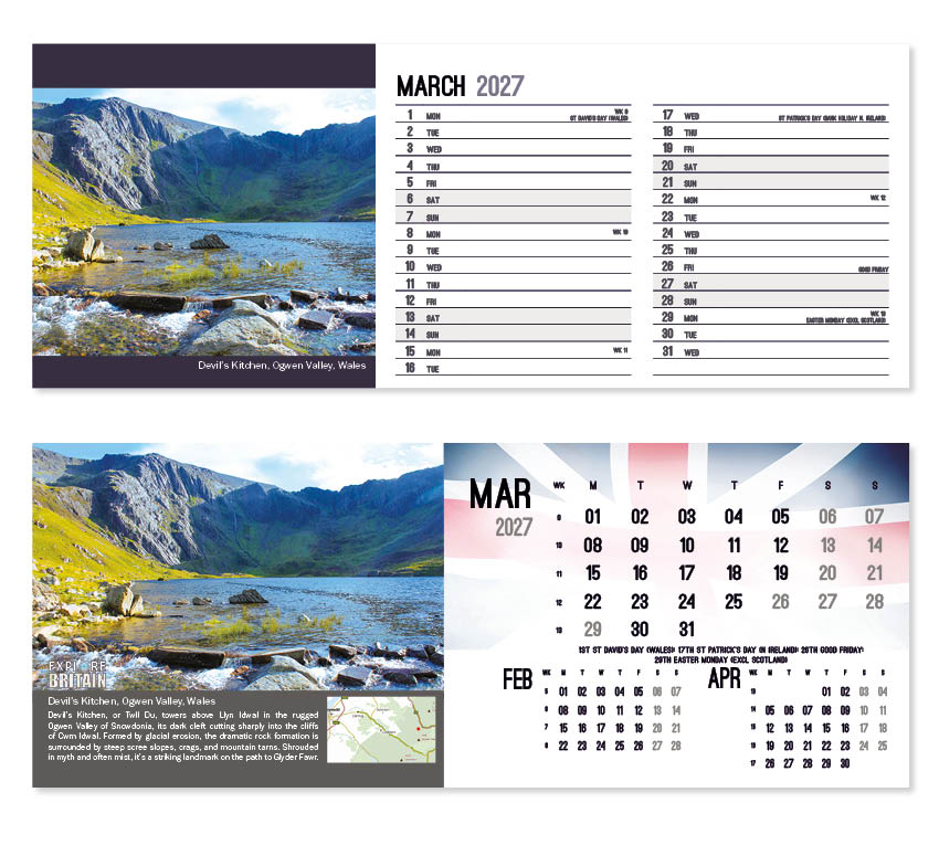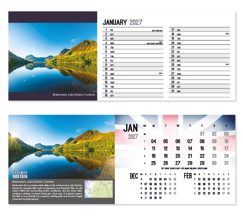 This popular calendar in our ‘Explore’ range highlights places in Britain to explore together with a useful map pinpointing their location. A patriotic Union Jack flag is featured on the cover and ghosted into the background behind the date block. All our desk calendars are printed on both sides, each side in a different format – either a simple date pad with a larger image, or a space for notes and appointments with a slightly smaller image. Thicker premium 250gsm weight paper and varnished leaves and cover make desk calendars very appealing, and they save on postage – being Royal Mail ‘Large Letter’ size.