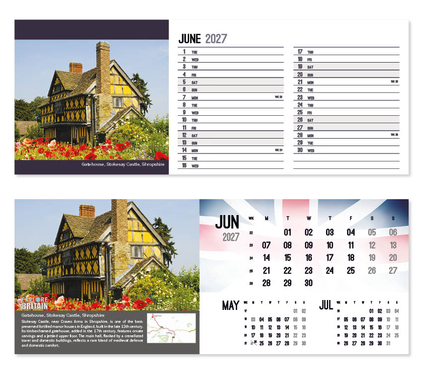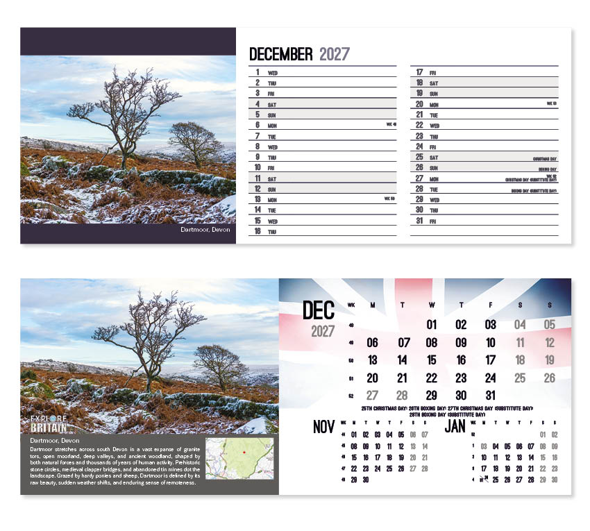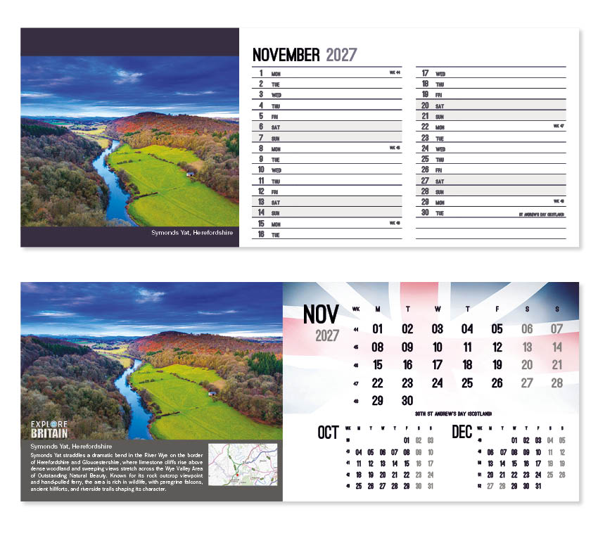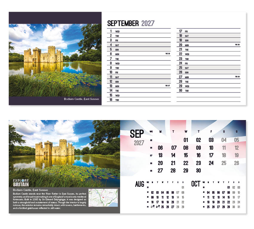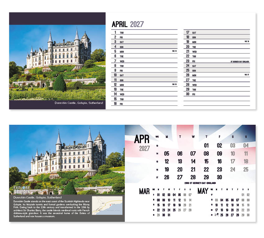 This popular calendar in our ‘Explore’ range highlights places in Britain to explore together with a useful map pinpointing their location. A patriotic Union Jack flag is featured on the cover and ghosted into the background behind the date block. All our desk calendars are printed on both sides, each side in a different format – either a simple date pad with a larger image, or a space for notes and appointments with a slightly smaller image. Thicker premium 250gsm weight paper and varnished leaves and cover make desk calendars very appealing, and they save on postage – being Royal Mail ‘Large Letter’ size.