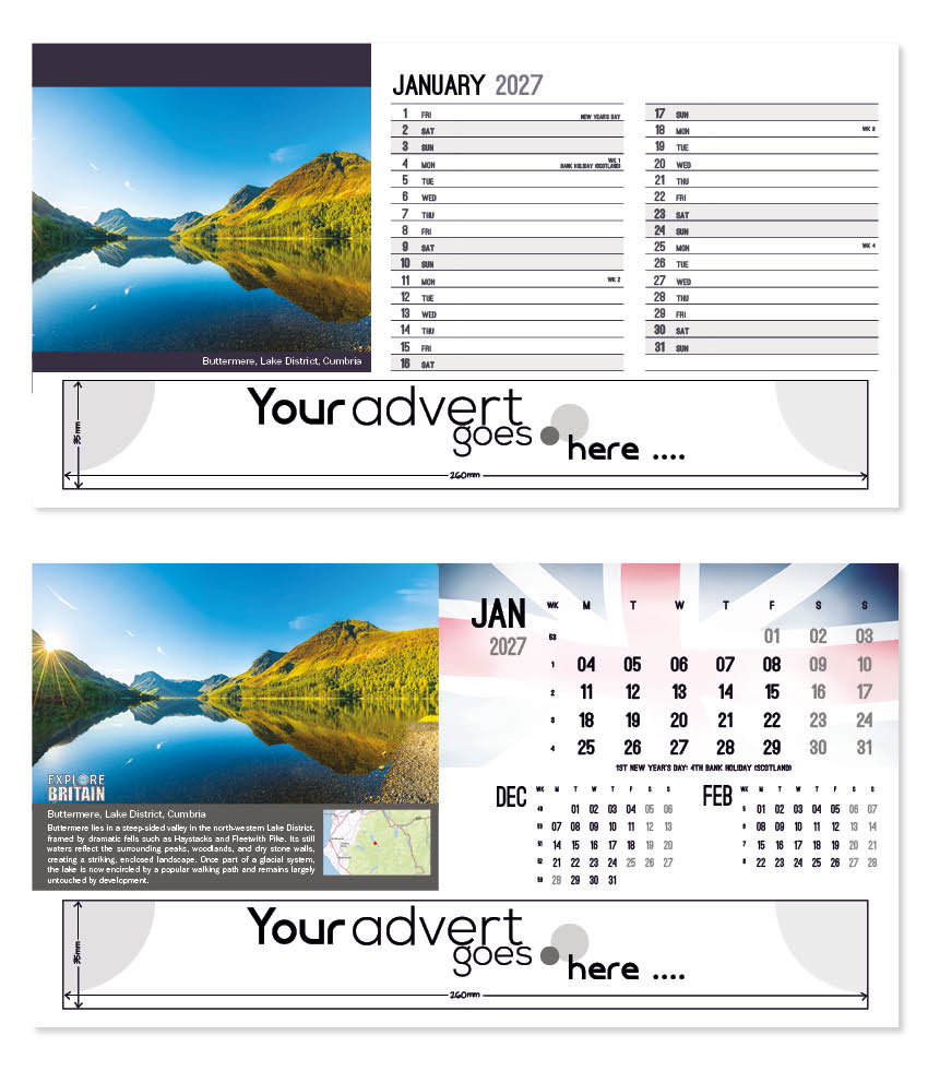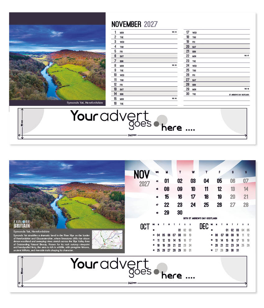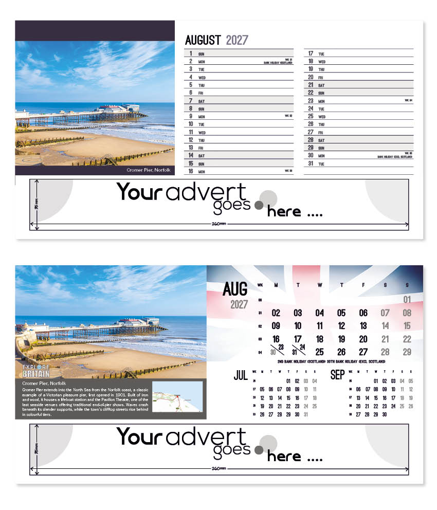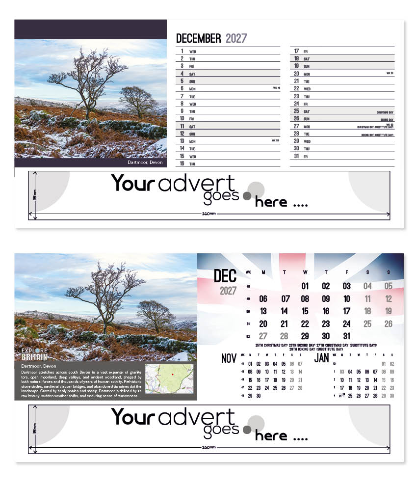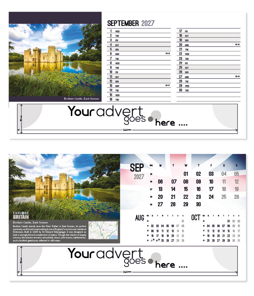 Each calendar comes with an advert section. It is this section that we replace with your personalised company advert that either we design for you, or you supply to us. This section can be seen on our range’s images titled “Your advert goes here”.