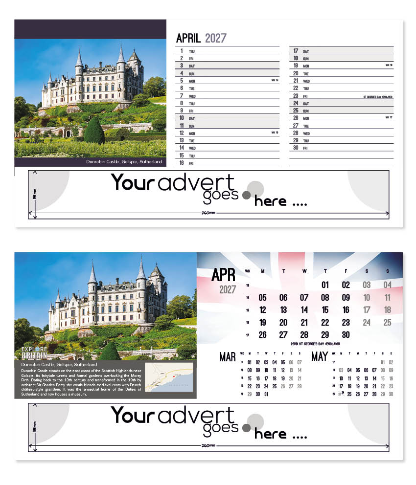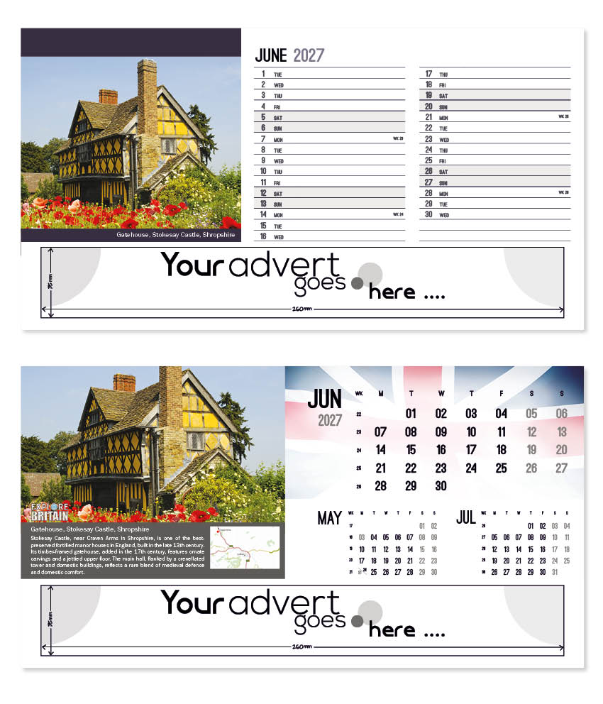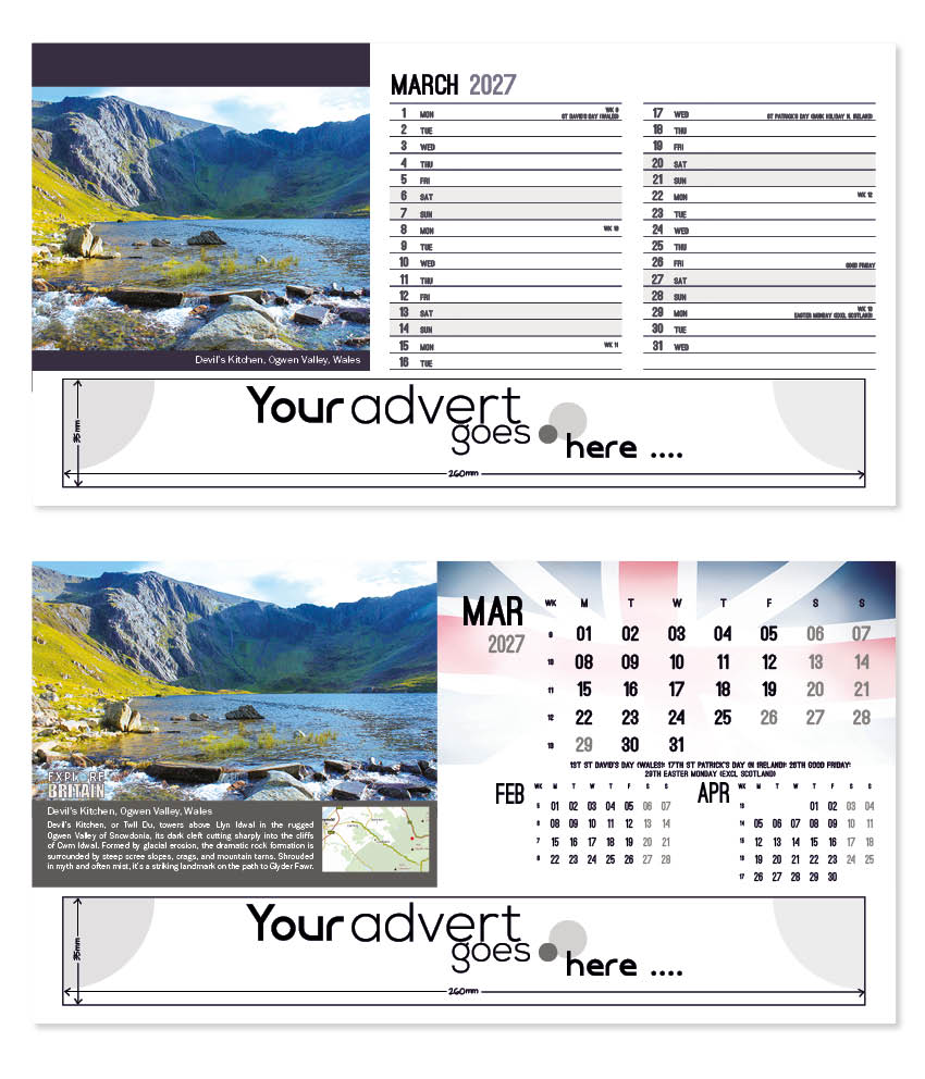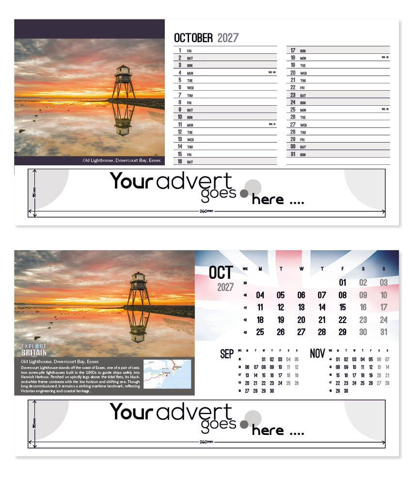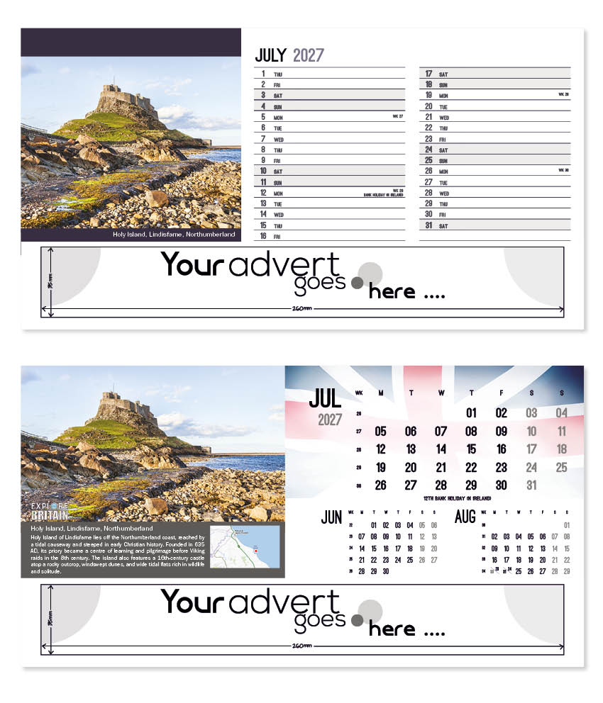 Each calendar comes with an advert section. It is this section that we replace with your personalised company advert that either we design for you, or you supply to us. This section can be seen on our range’s images titled “Your advert goes here”.