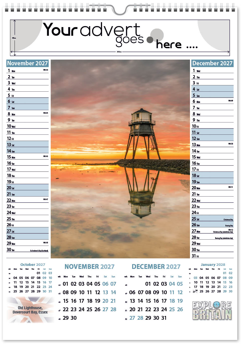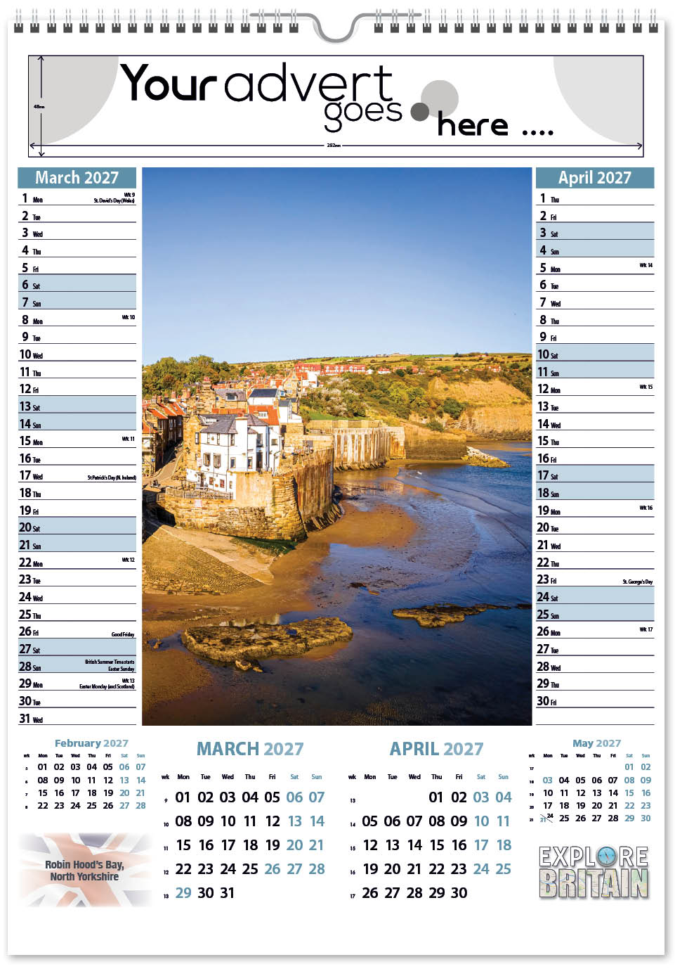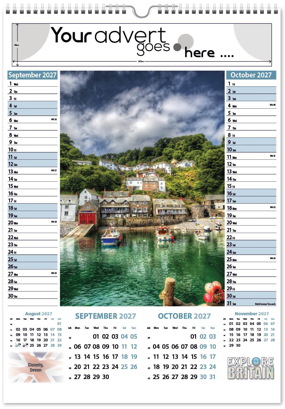 Each calendar comes with an advert section. It is this section that we replace with your personalised company advert that either we design for you, or you supply to us. This section can be seen on our range’s images titled “Your advert goes here”.