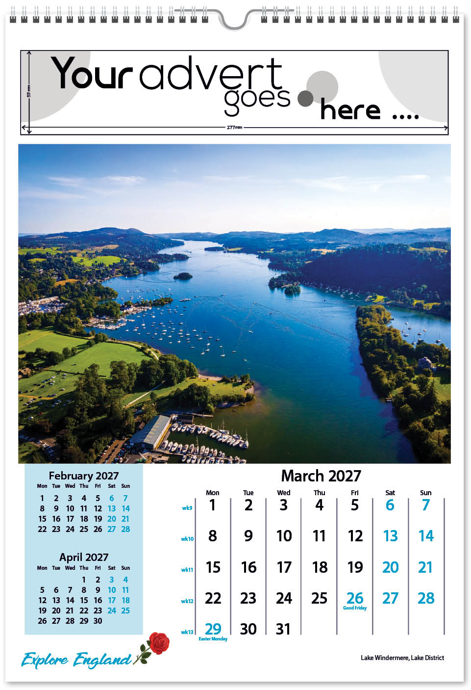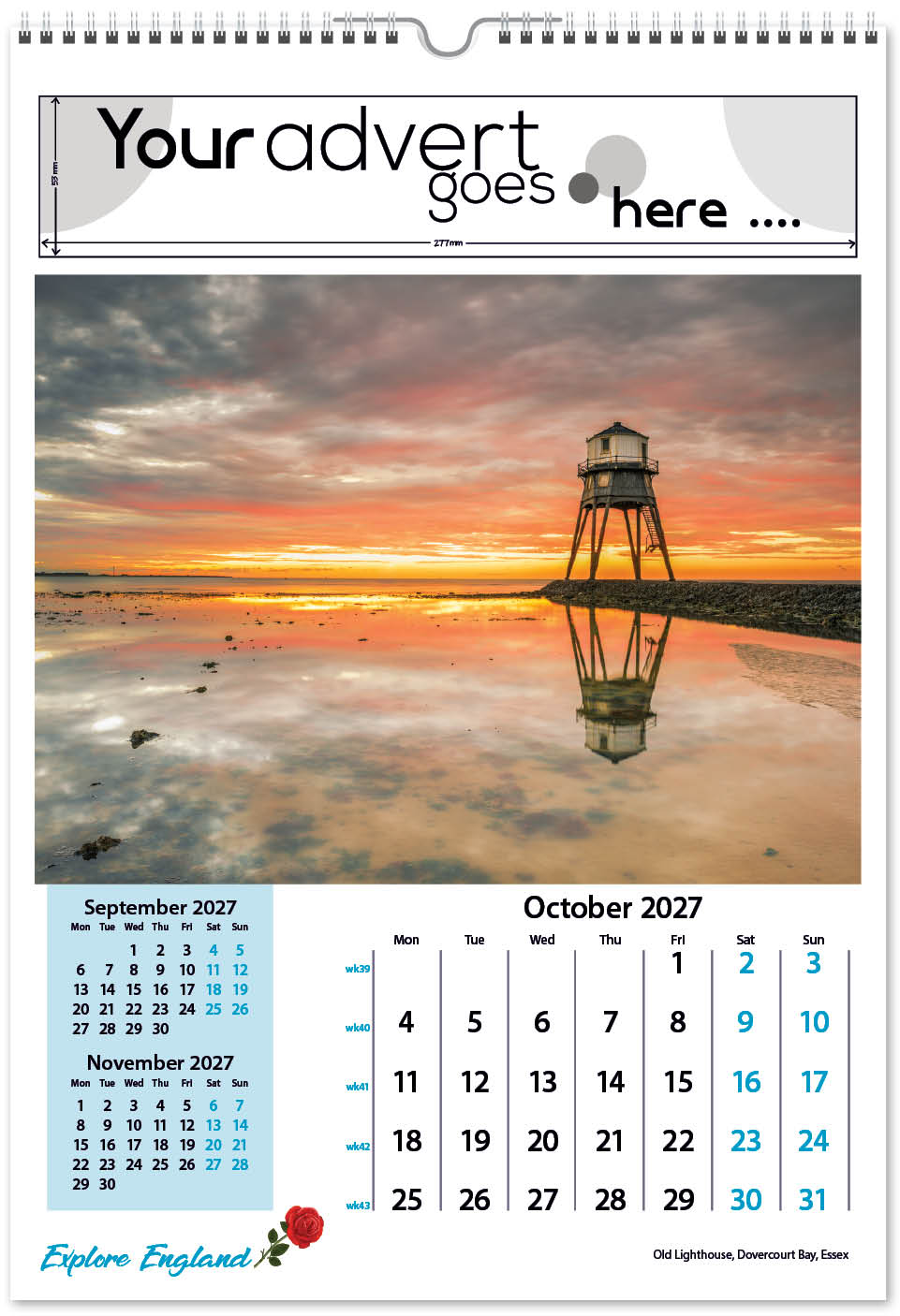 Each calendar comes with an advert section. It is this section that we replace with your personalised company advert that either we design for you, or you supply to us. This section can be seen on our range’s images titled “Your advert goes here”.