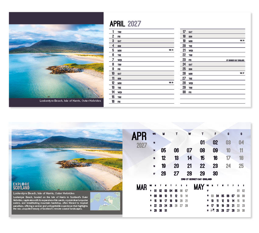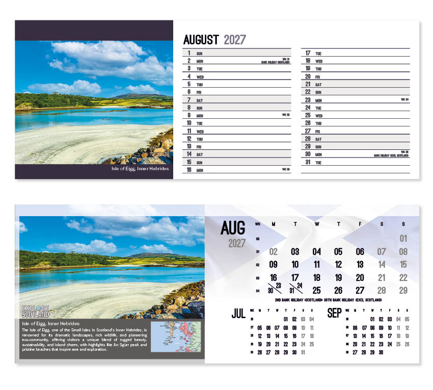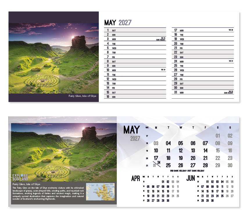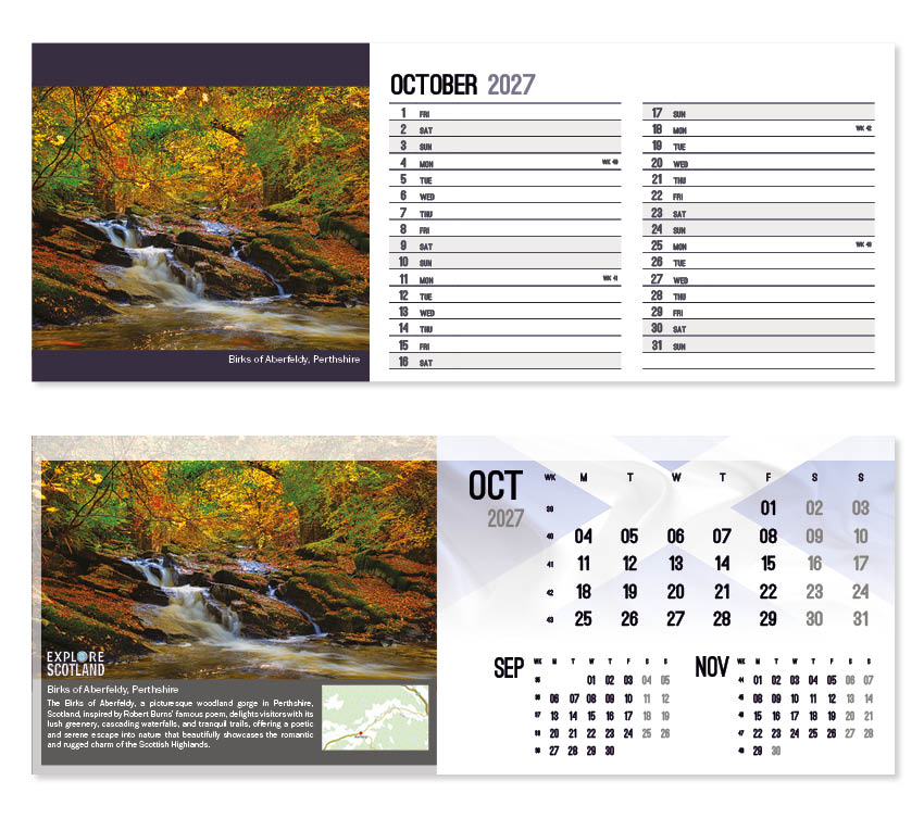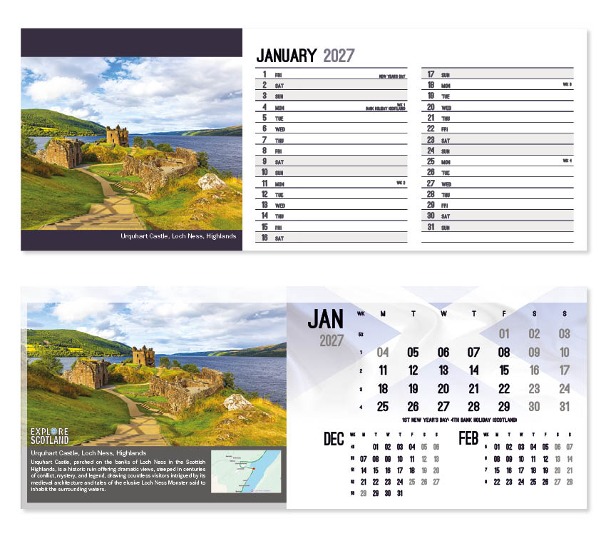 This popular calendar in our ‘Explore’ range highlights places in Scotland to explore together with a useful map pinpointing their location. A patriotic Scottish flag is featured on the cover and ghosted into the background behind the date block. All our desk calendars are printed on both sides, each side in a different format – either a simple date pad with a larger image, or a space for notes and appointments with a slightly smaller image. Thicker premium 250gsm weight paper and varnished leaves and cover make desk calendars very appealing, and they save on postage – being Royal Mail ‘Large Letter’ size.