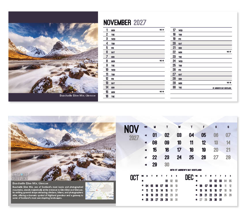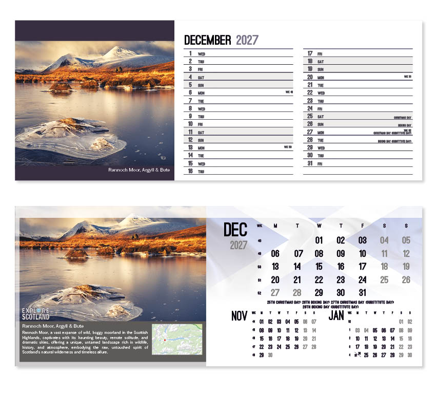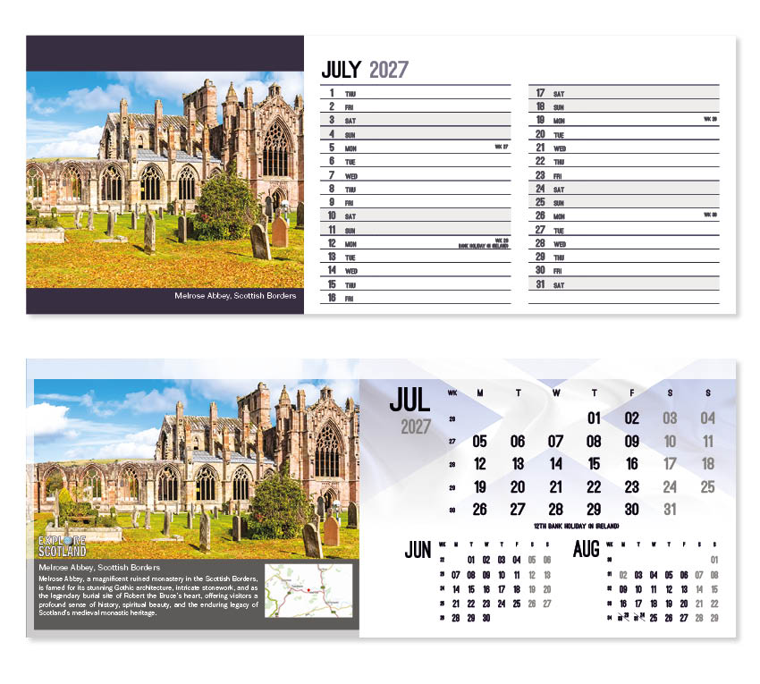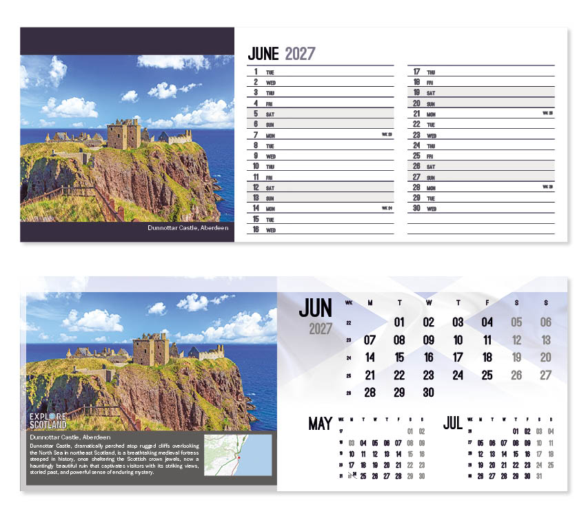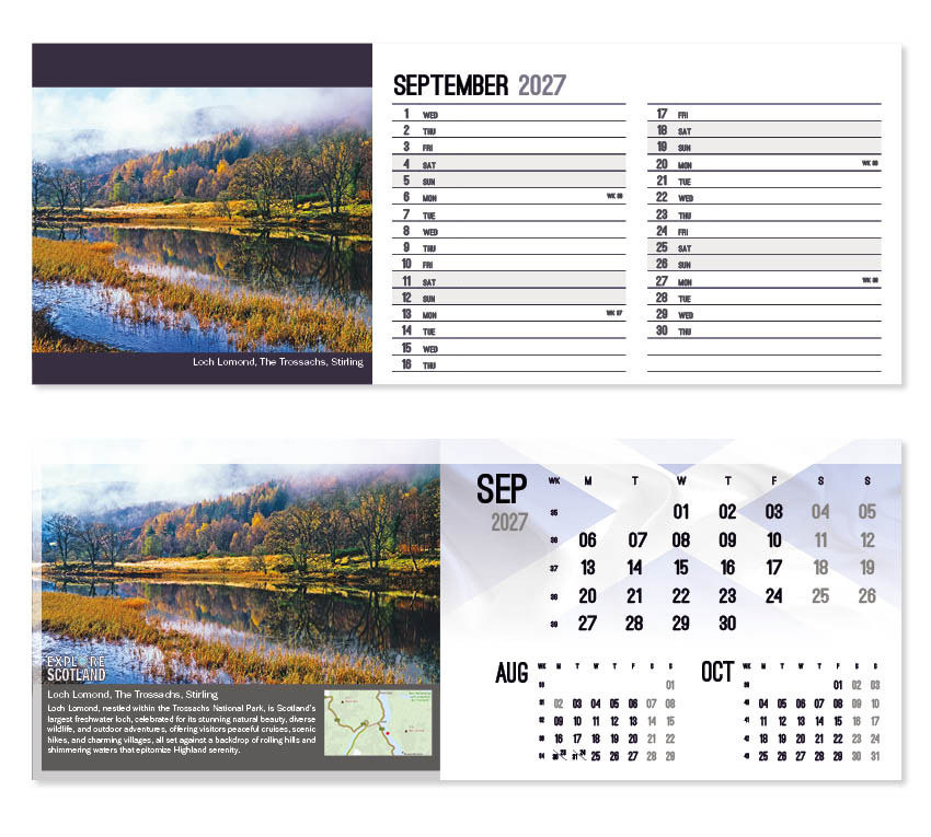 This popular calendar in our ‘Explore’ range highlights places in Scotland to explore together with a useful map pinpointing their location. A patriotic Scottish flag is featured on the cover and ghosted into the background behind the date block. All our desk calendars are printed on both sides, each side in a different format – either a simple date pad with a larger image, or a space for notes and appointments with a slightly smaller image. Thicker premium 250gsm weight paper and varnished leaves and cover make desk calendars very appealing, and they save on postage – being Royal Mail ‘Large Letter’ size.