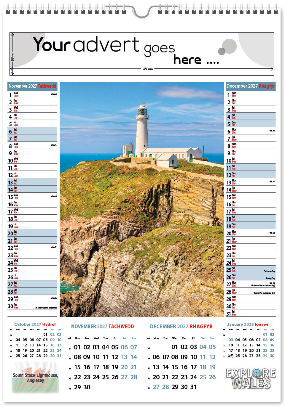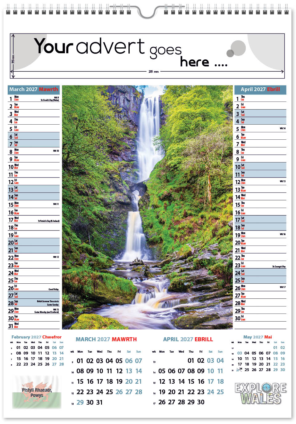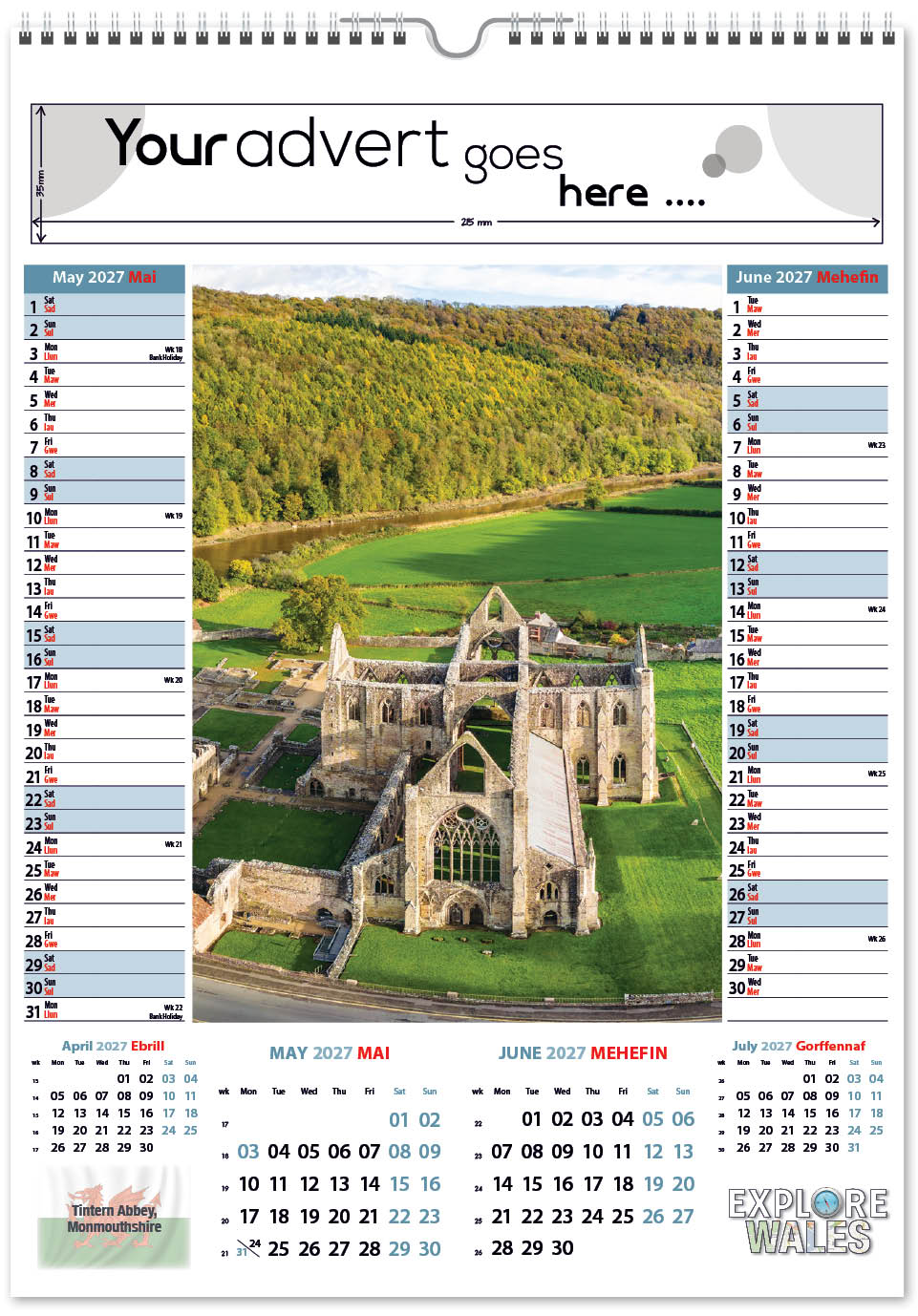 Each calendar comes with an advert section. It is this section that we replace with your personalised company advert that either we design for you, or you supply to us. This section can be seen on our range’s images titled “Your advert goes here”.