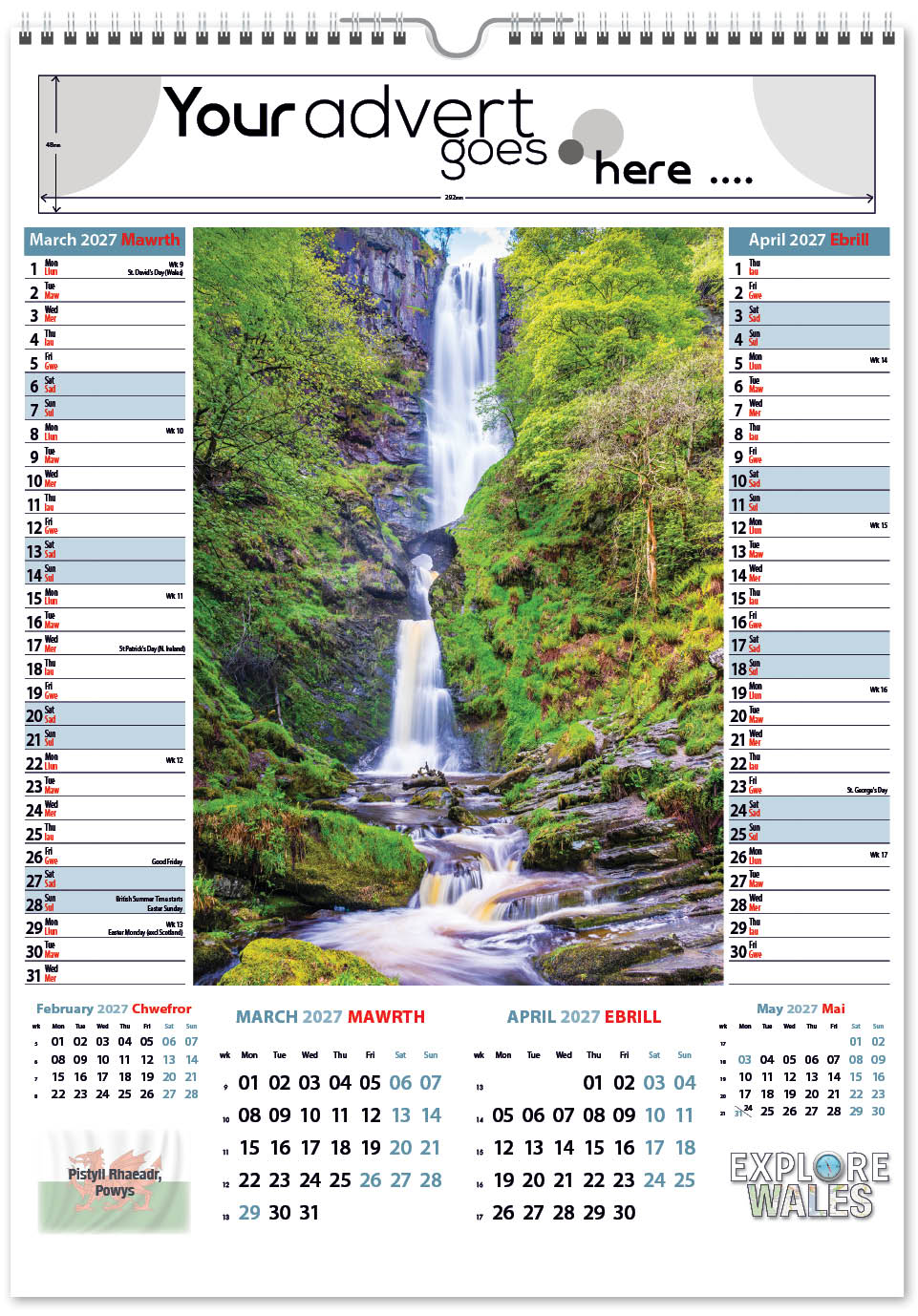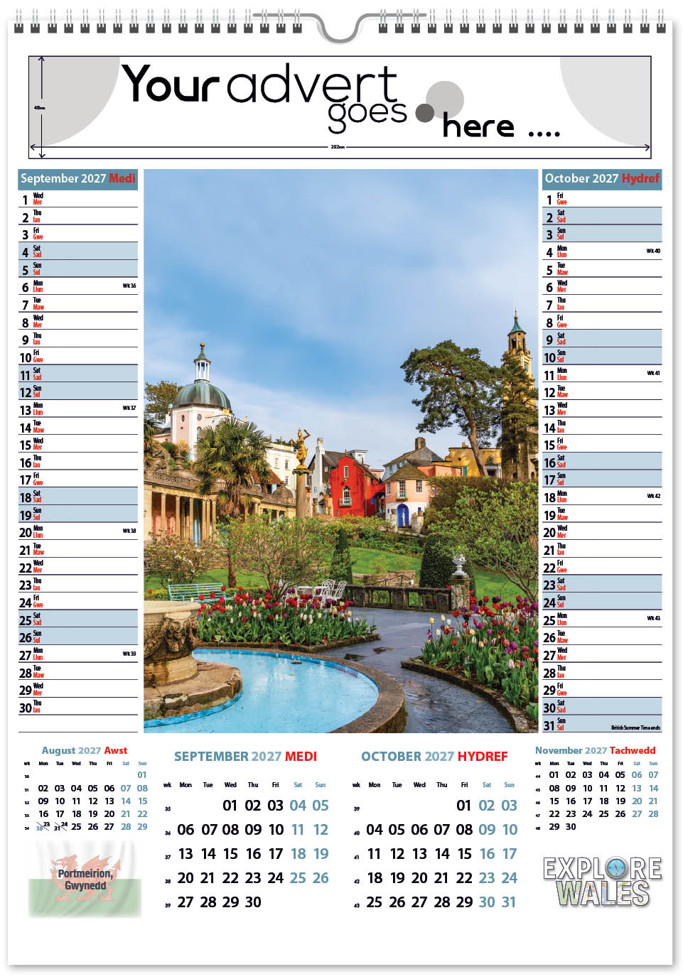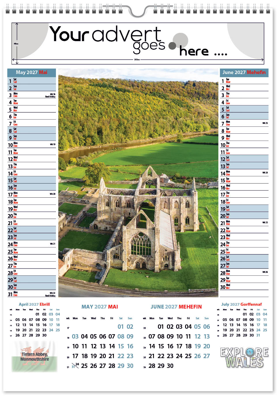 Each calendar comes with an advert section. It is this section that we replace with your personalised company advert that either we design for you, or you supply to us. This section can be seen on our range’s images titled “Your advert goes here”.
