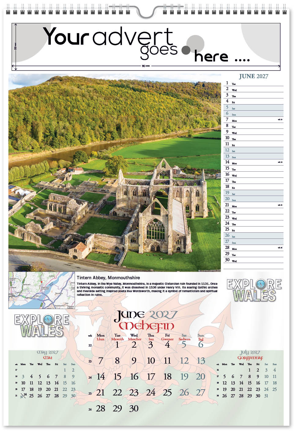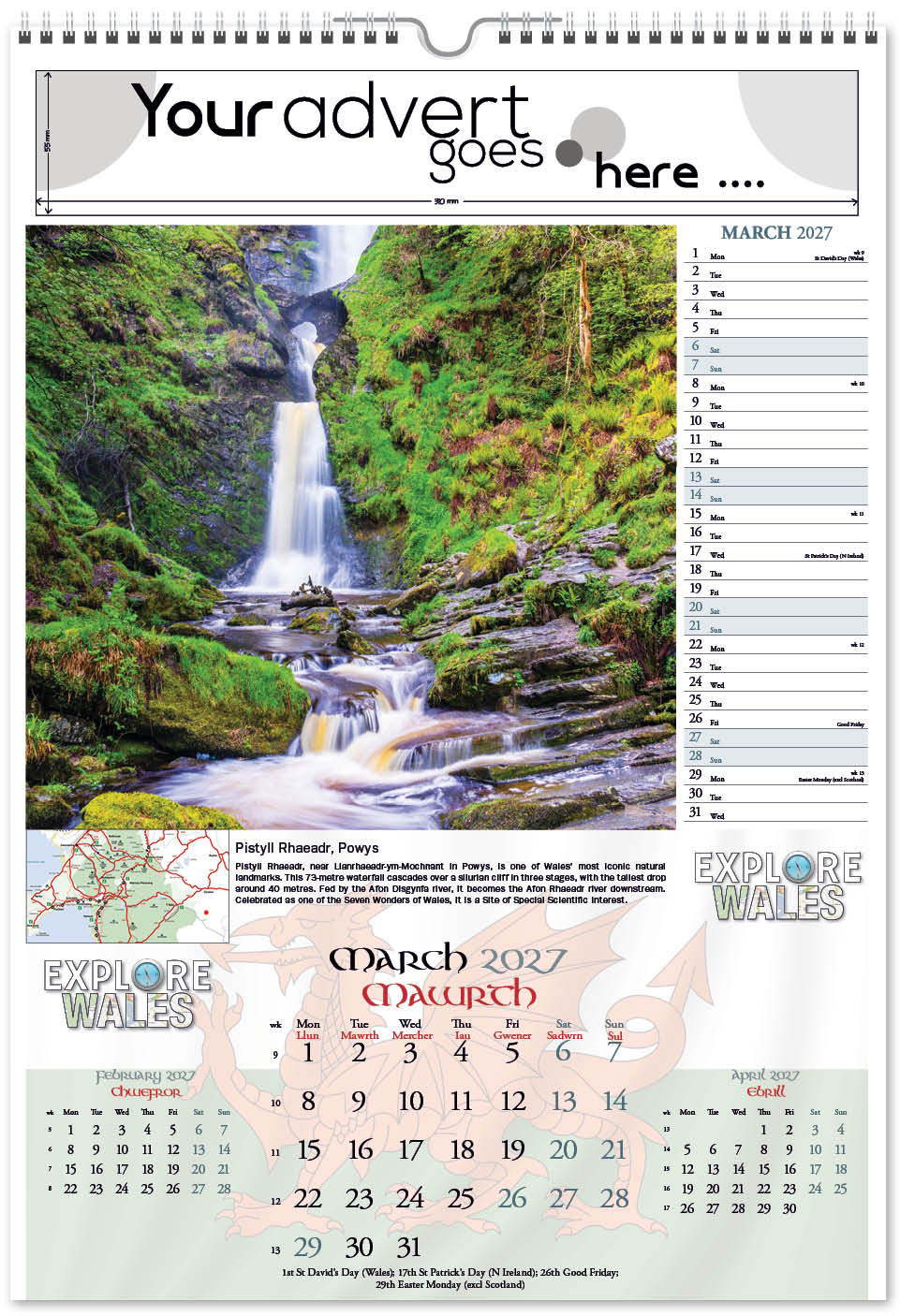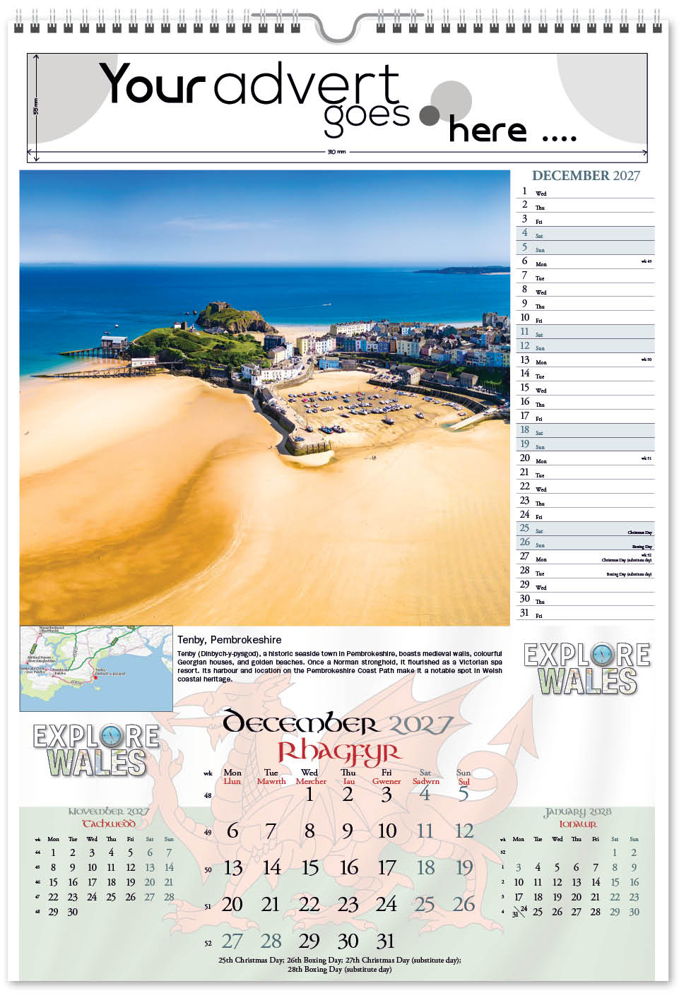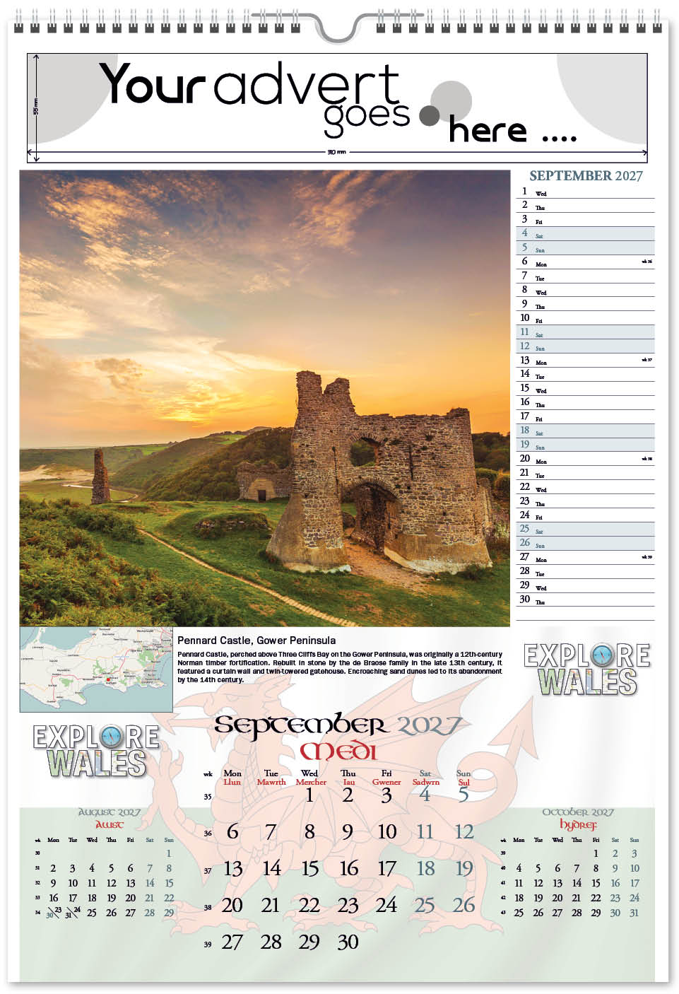Another of our ‘Explore’ range of calendars is Explore Wales, highlighting places in Wales to explore together with a useful map pinpointing their location. Picturesque locations all over Wales are featured in this bilingual calendar, with days, months and titles in both Welsh and English. A patriotic Welsh Dragon also features on the cover and is ghosted into the background behind the date block, and it has a useful memo section for appointments and notes, plus varnished leaves and cover.