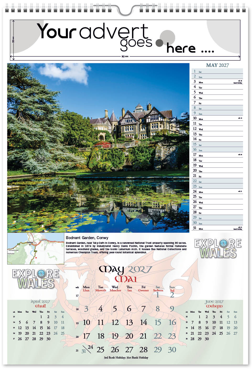 Each calendar comes with an advert section. It is this section that we replace with your personalised company advert that either we design for you, or you supply to us. This section can be seen on our range’s images titled “Your advert goes here”.
