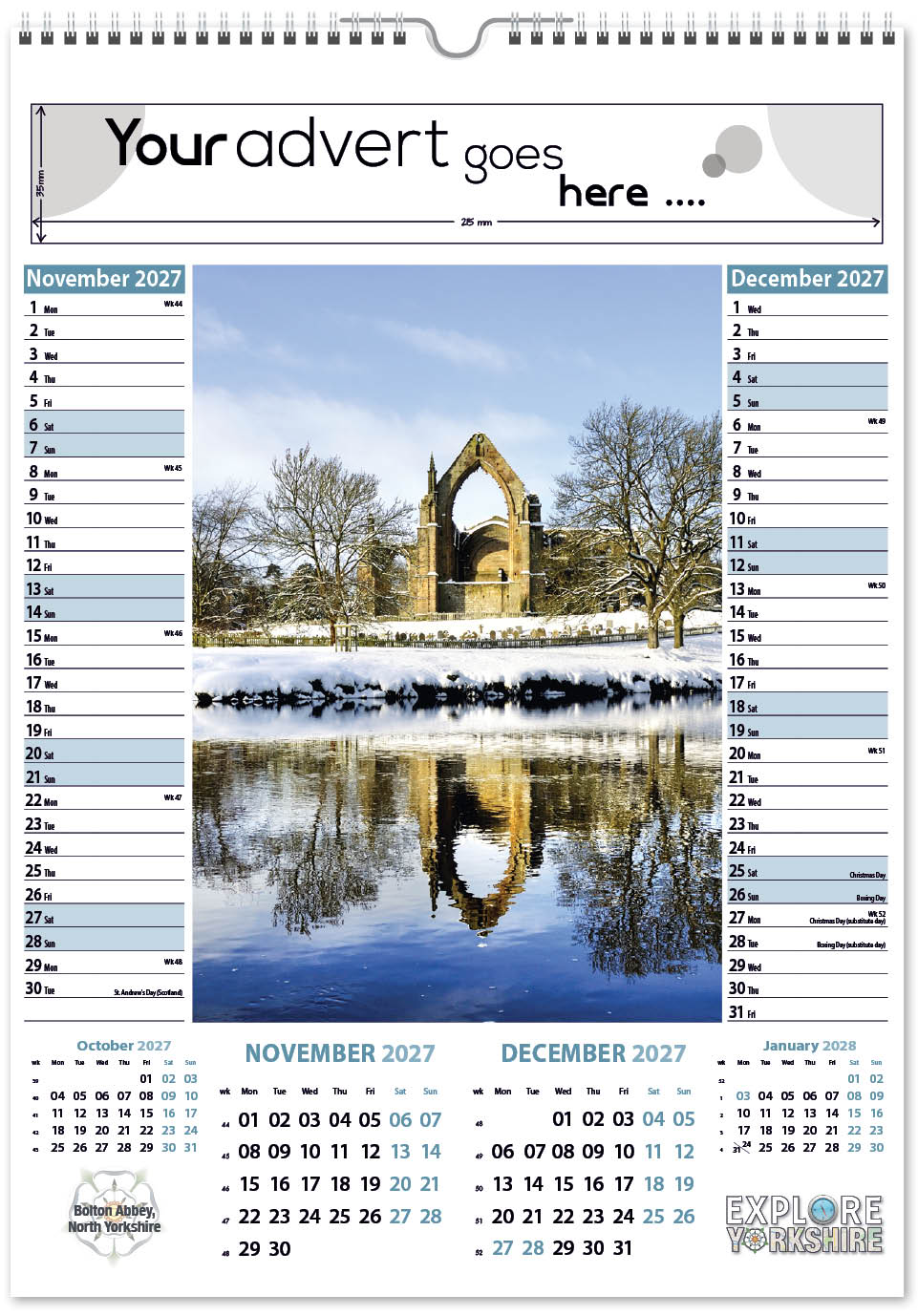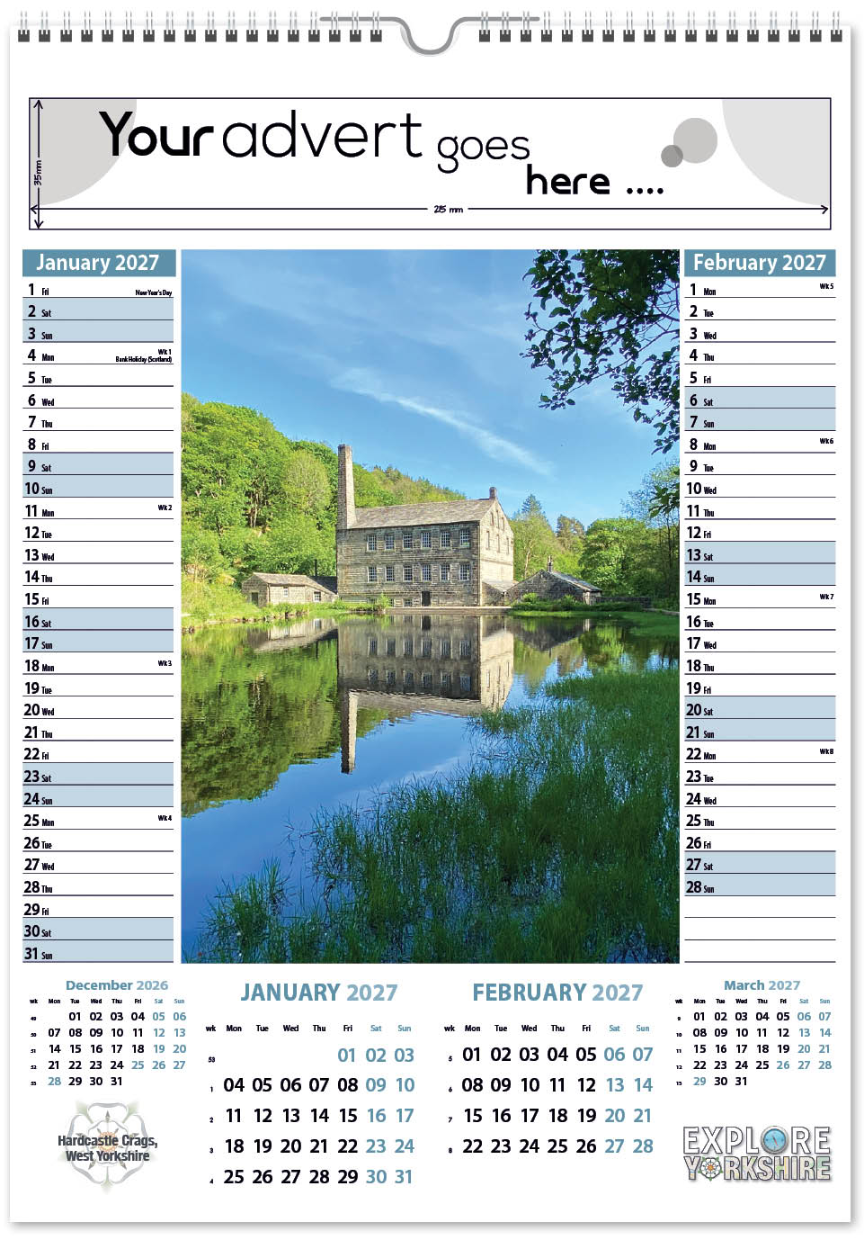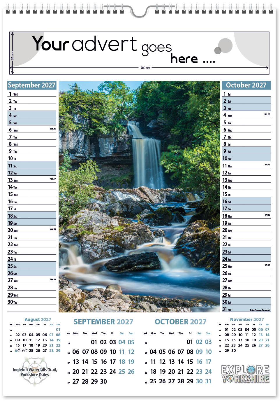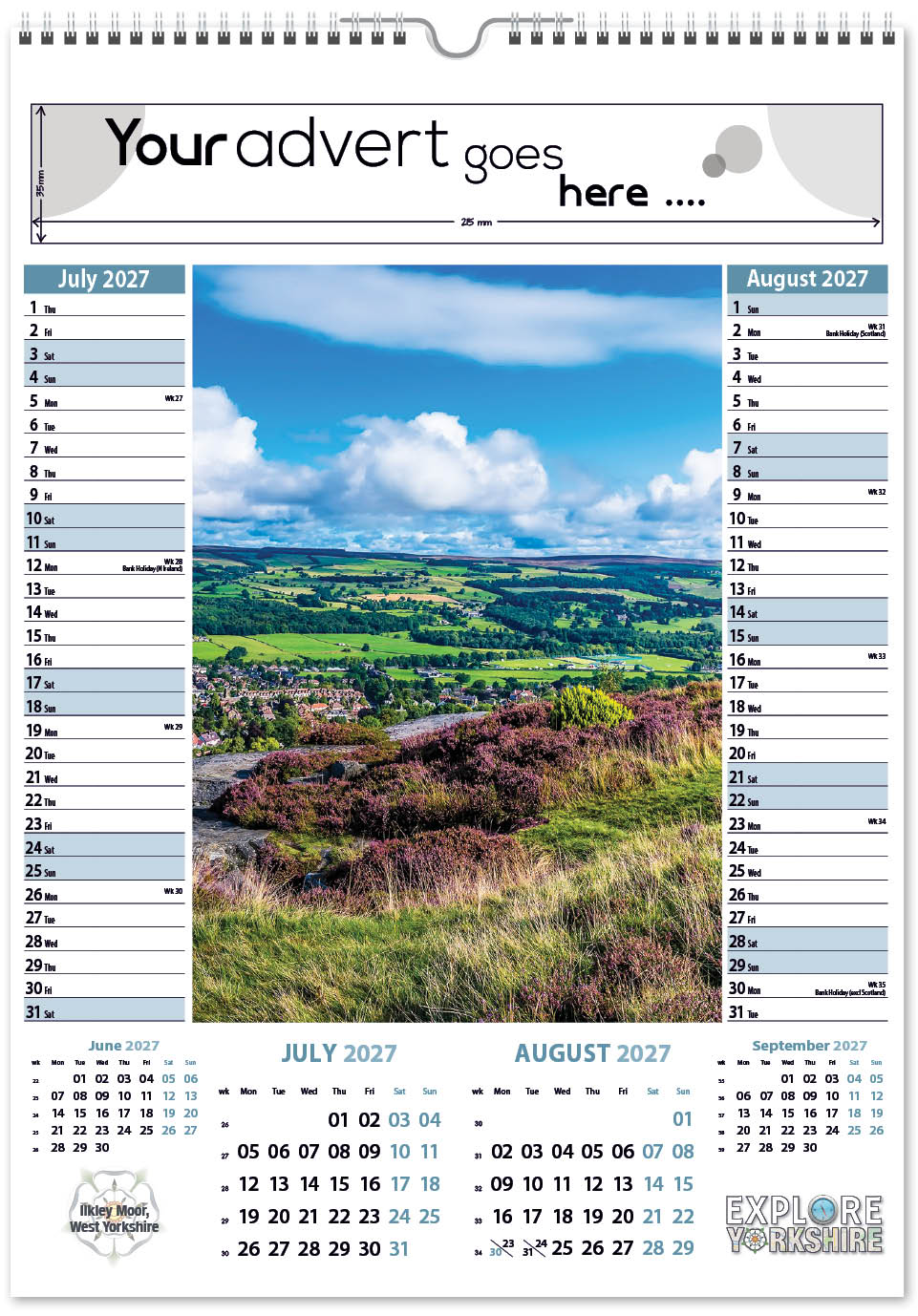 Each calendar comes with an advert section. It is this section that we replace with your personalised company advert that either we design for you, or you supply to us. This section can be seen on our range’s images titled “Your advert goes here”.