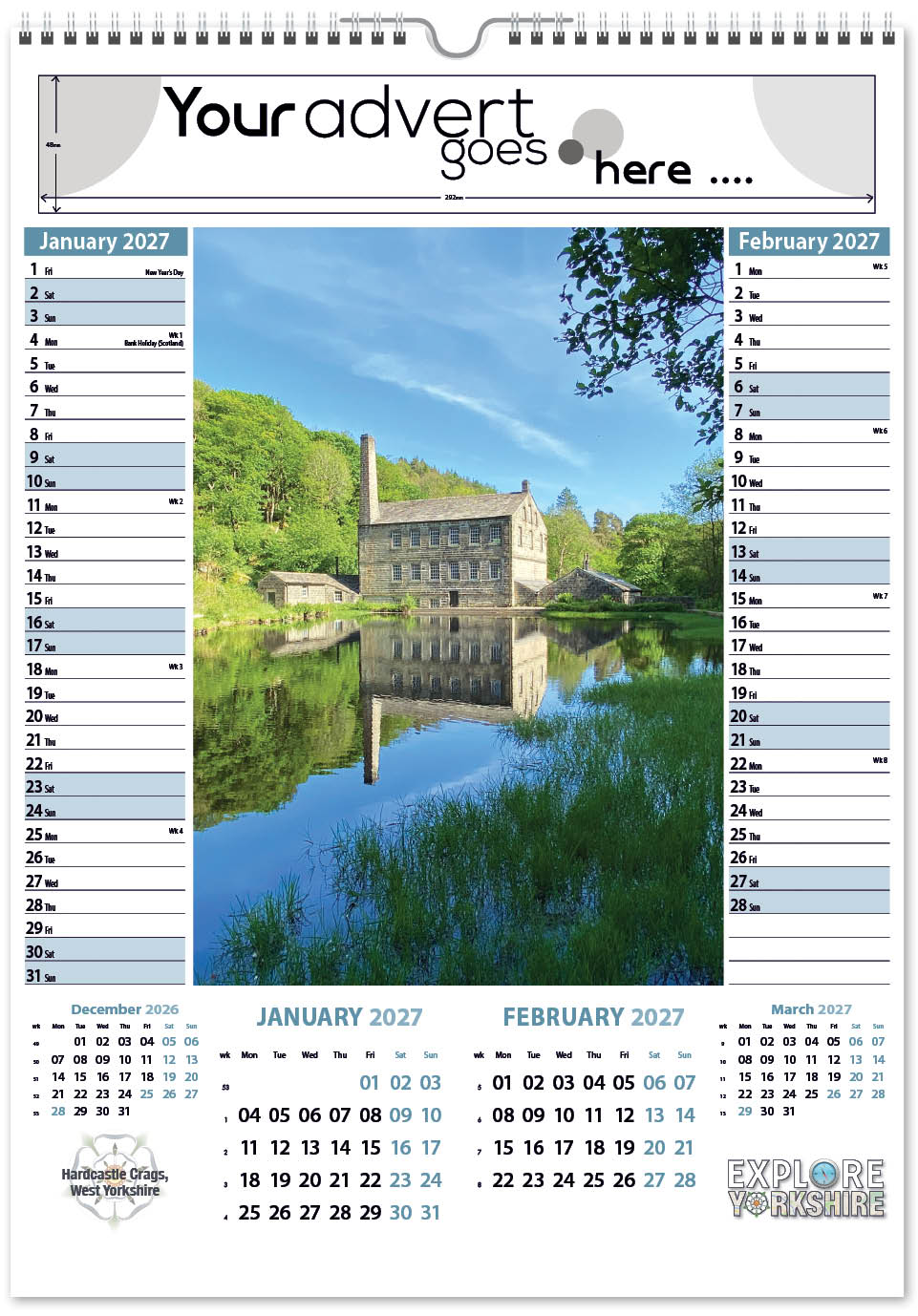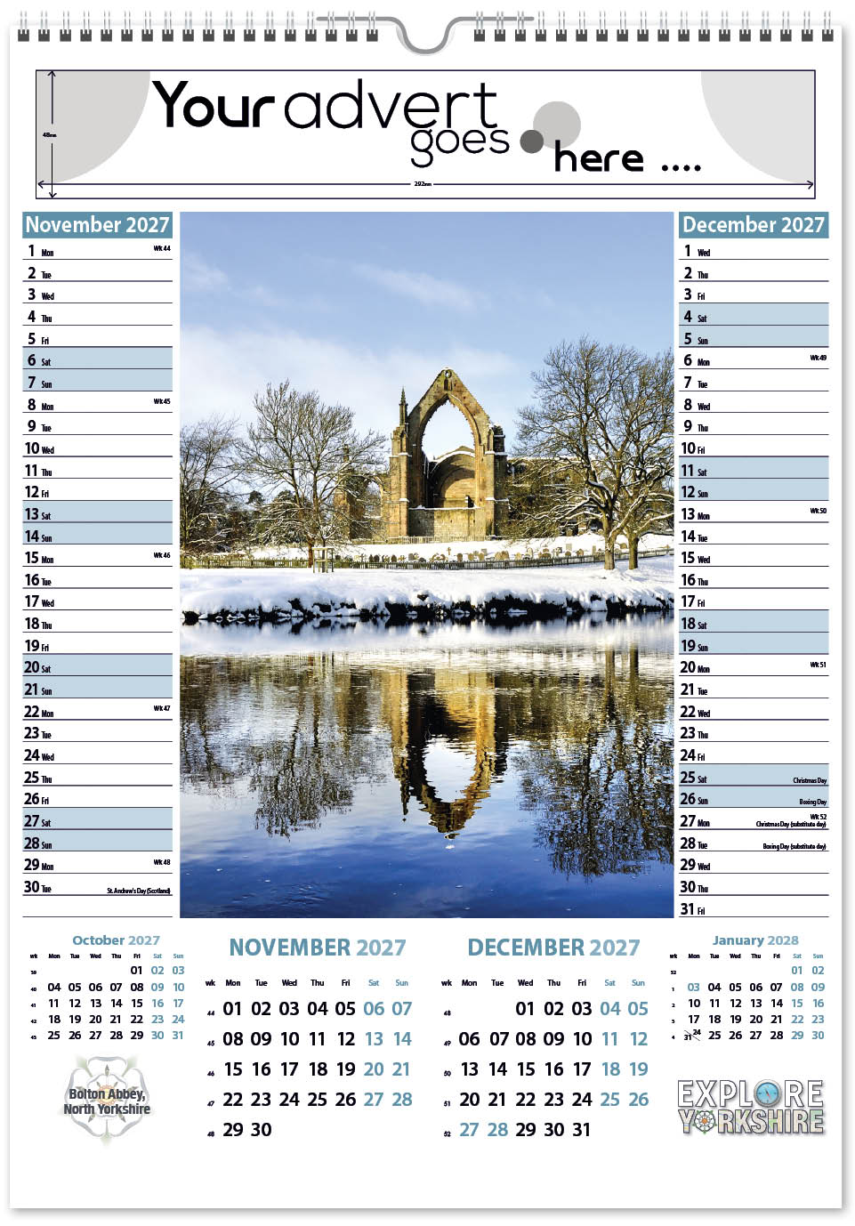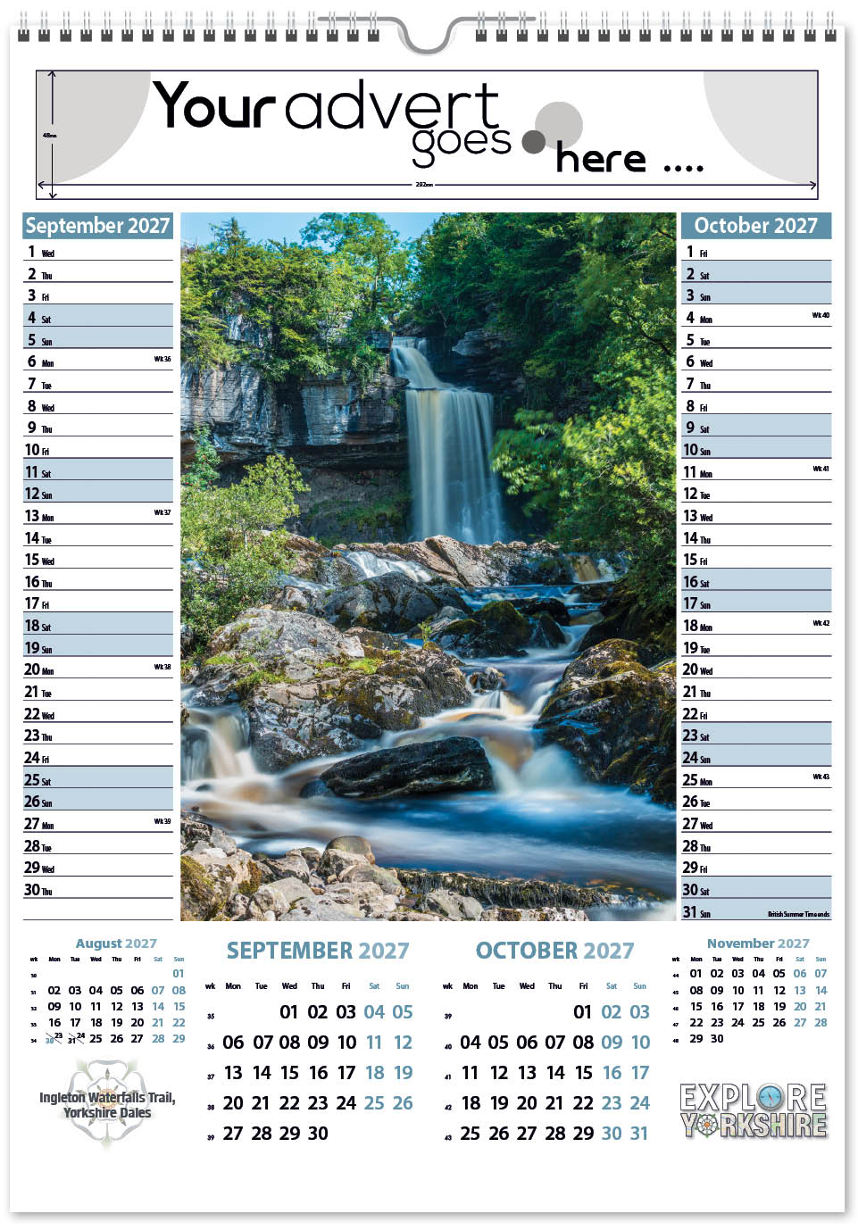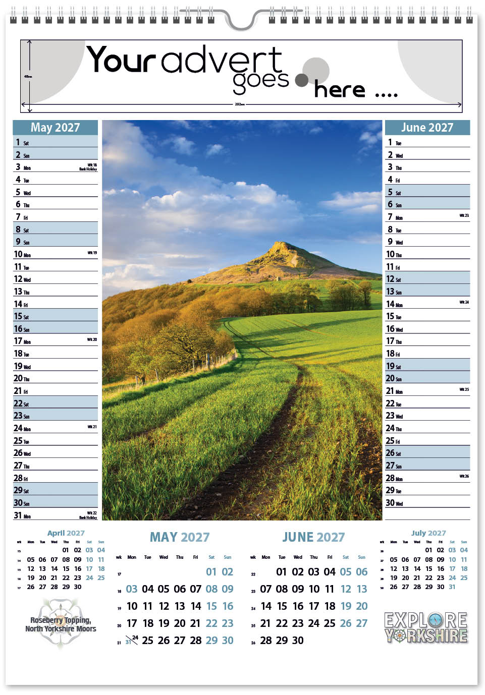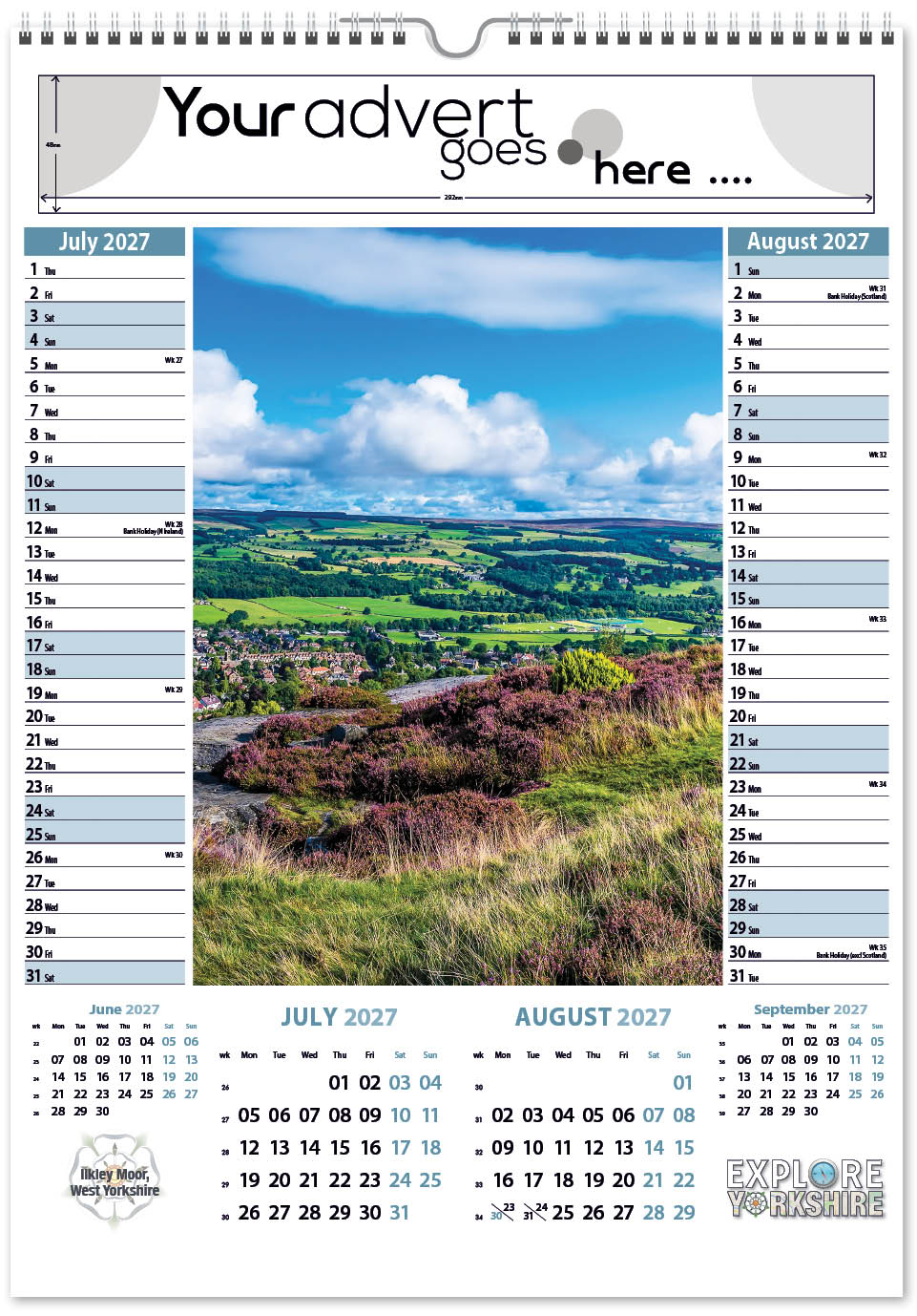 Each calendar comes with an advert section. It is this section that we replace with your personalised company advert that either we design for you, or you supply to us. This section can be seen on our range’s images titled “Your advert goes here”.