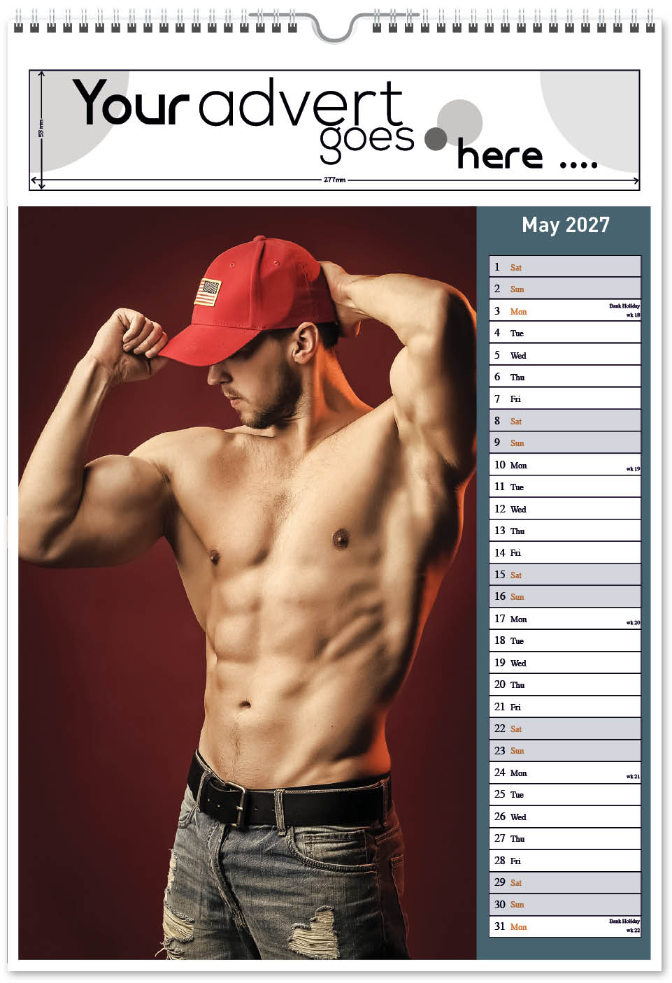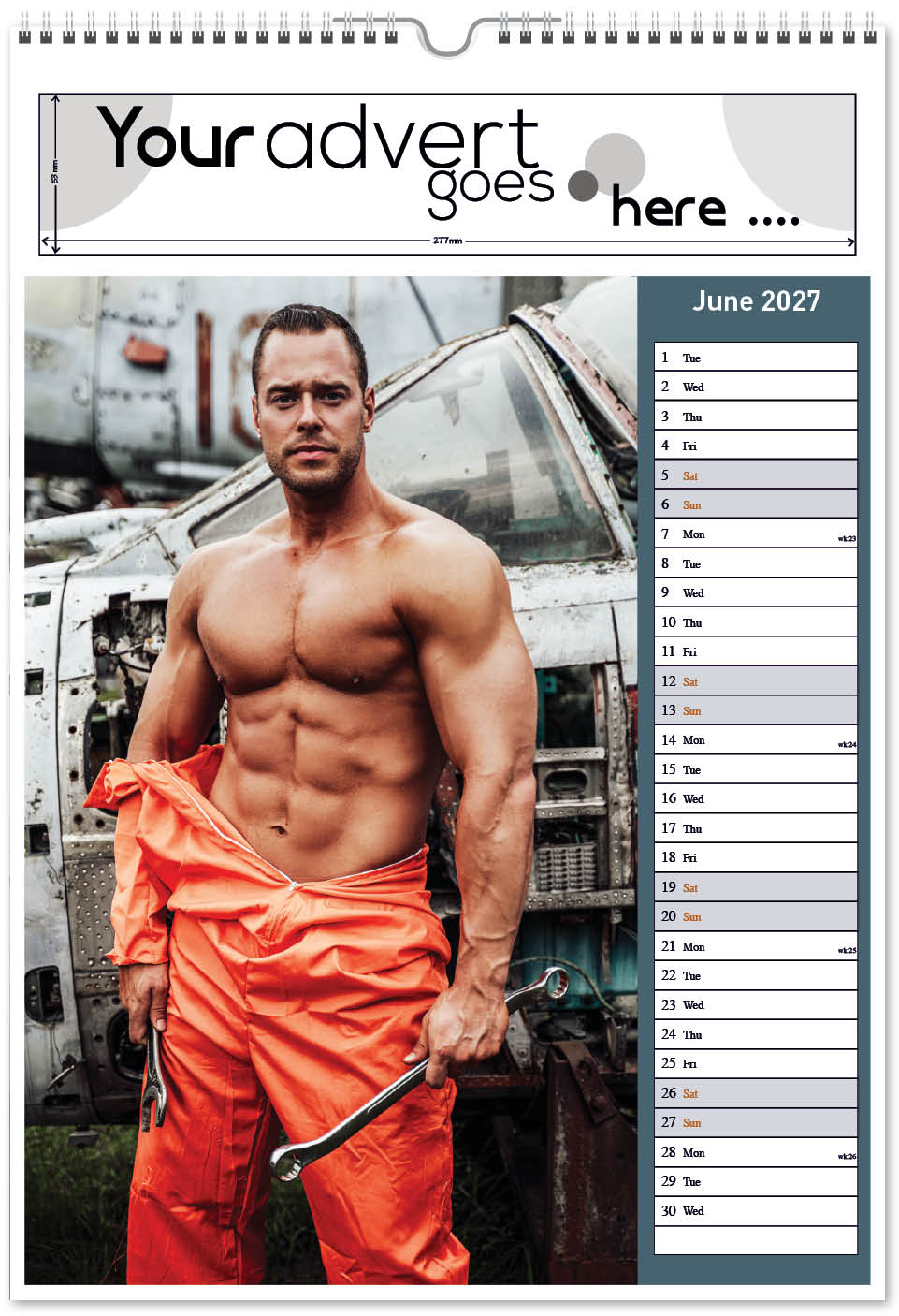 Each calendar comes with an advert section. It is this section that we replace with your personalised company advert that either we design for you, or you supply to us. This section can be seen on our range’s images titled “Your advert goes here”.