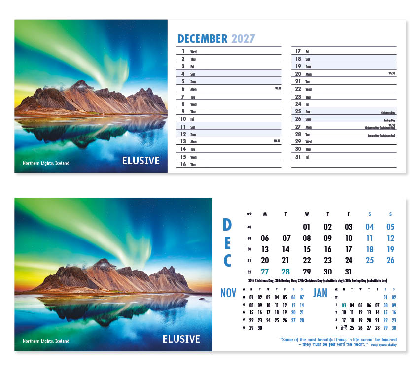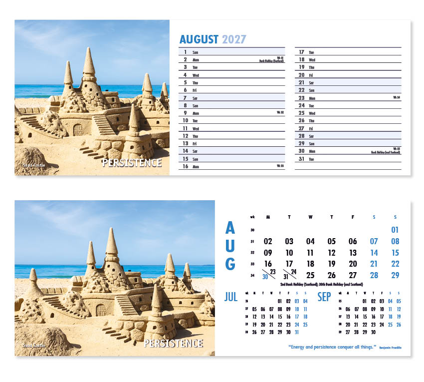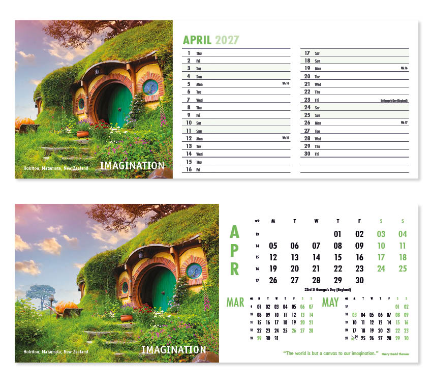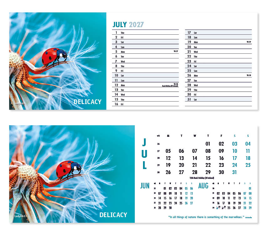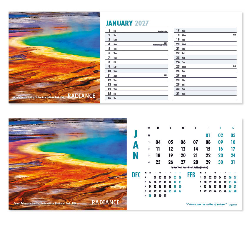 Our thought-provoking Inspire desk calendar features striking images together with motivational words, quotes and sayings. Each mesmerising image represents a different insightful mood – Discovery,  Vision, Beauty and Creativity to name just a few. All our desk calendars are printed on both sides, each side in a different format – either a simple date pad with a larger image, or a space for notes and appointments with a slightly smaller image. Thicker premium 250gsm weight paper and varnished leaves and cover make desk calendars very appealing, and they save on postage – being Royal Mail ‘Large Letter’ size.