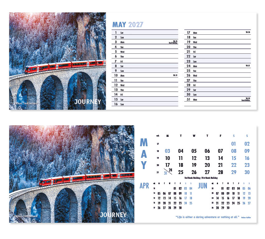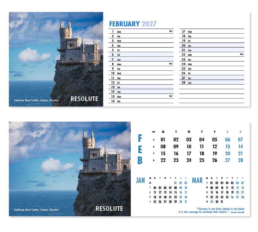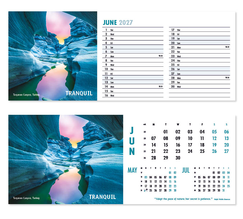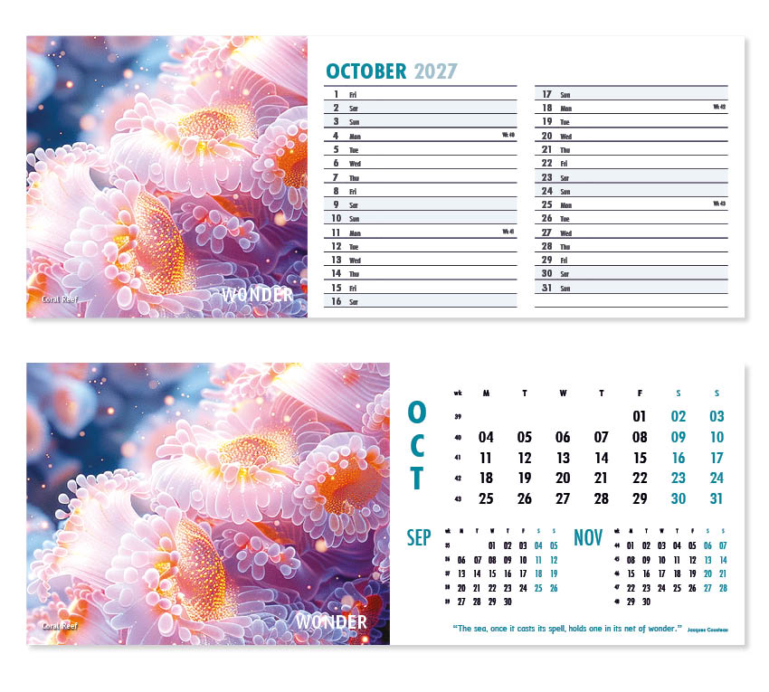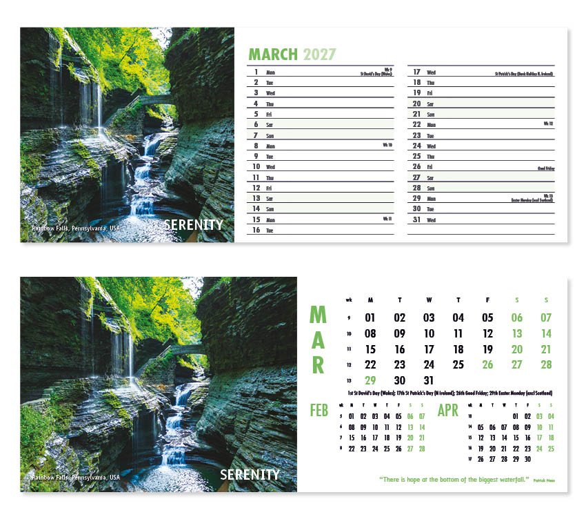 Our thought-provoking Inspire desk calendar features striking images together with motivational words, quotes and sayings. Each mesmerising image represents a different insightful mood – Discovery,  Vision, Beauty and Creativity to name just a few. All our desk calendars are printed on both sides, each side in a different format – either a simple date pad with a larger image, or a space for notes and appointments with a slightly smaller image. Thicker premium 250gsm weight paper and varnished leaves and cover make desk calendars very appealing, and they save on postage – being Royal Mail ‘Large Letter’ size.