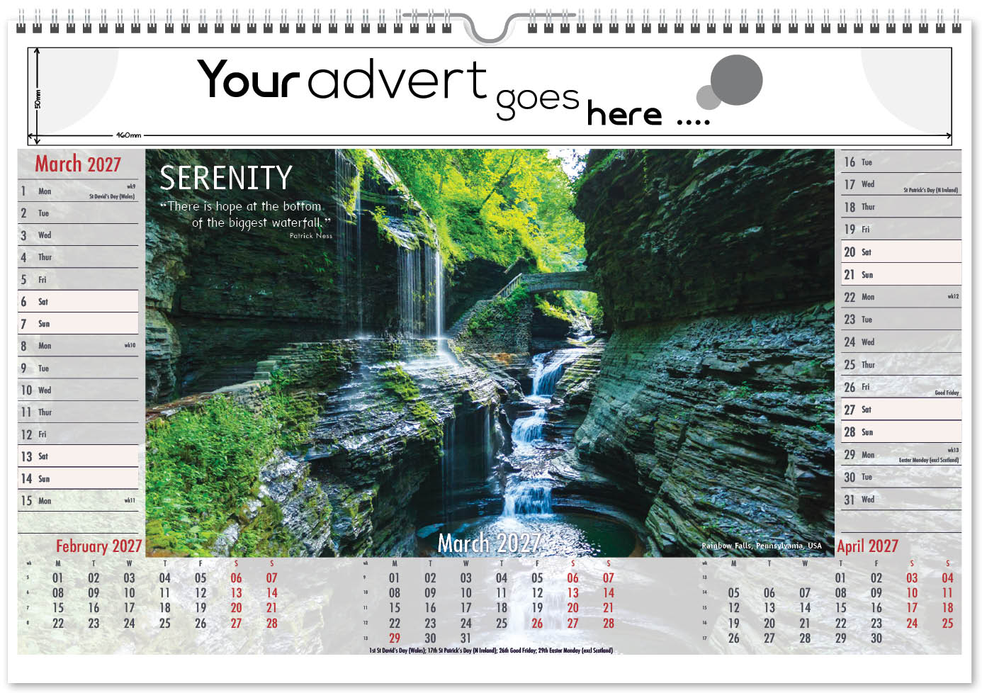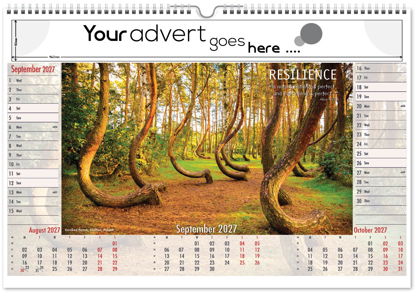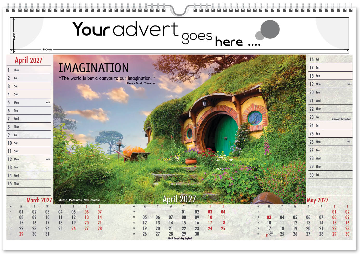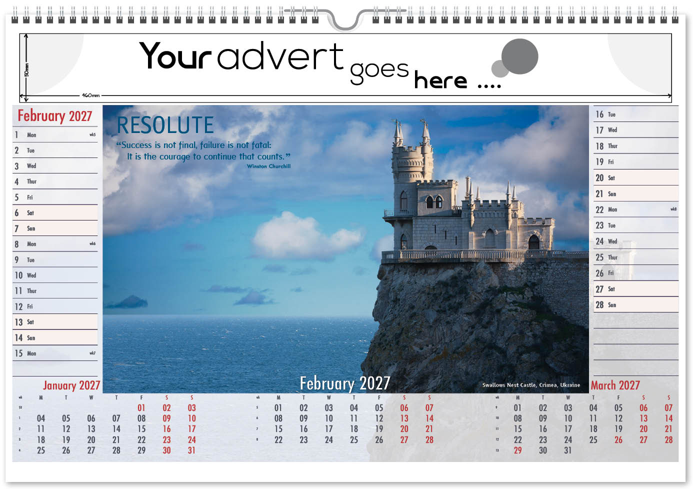 Each calendar comes with an advert section. It is this section that we replace with your personalised company advert that either we design for you, or you supply to us. This section can be seen on our range’s images titled “Your advert goes here”.