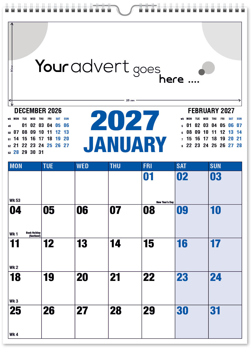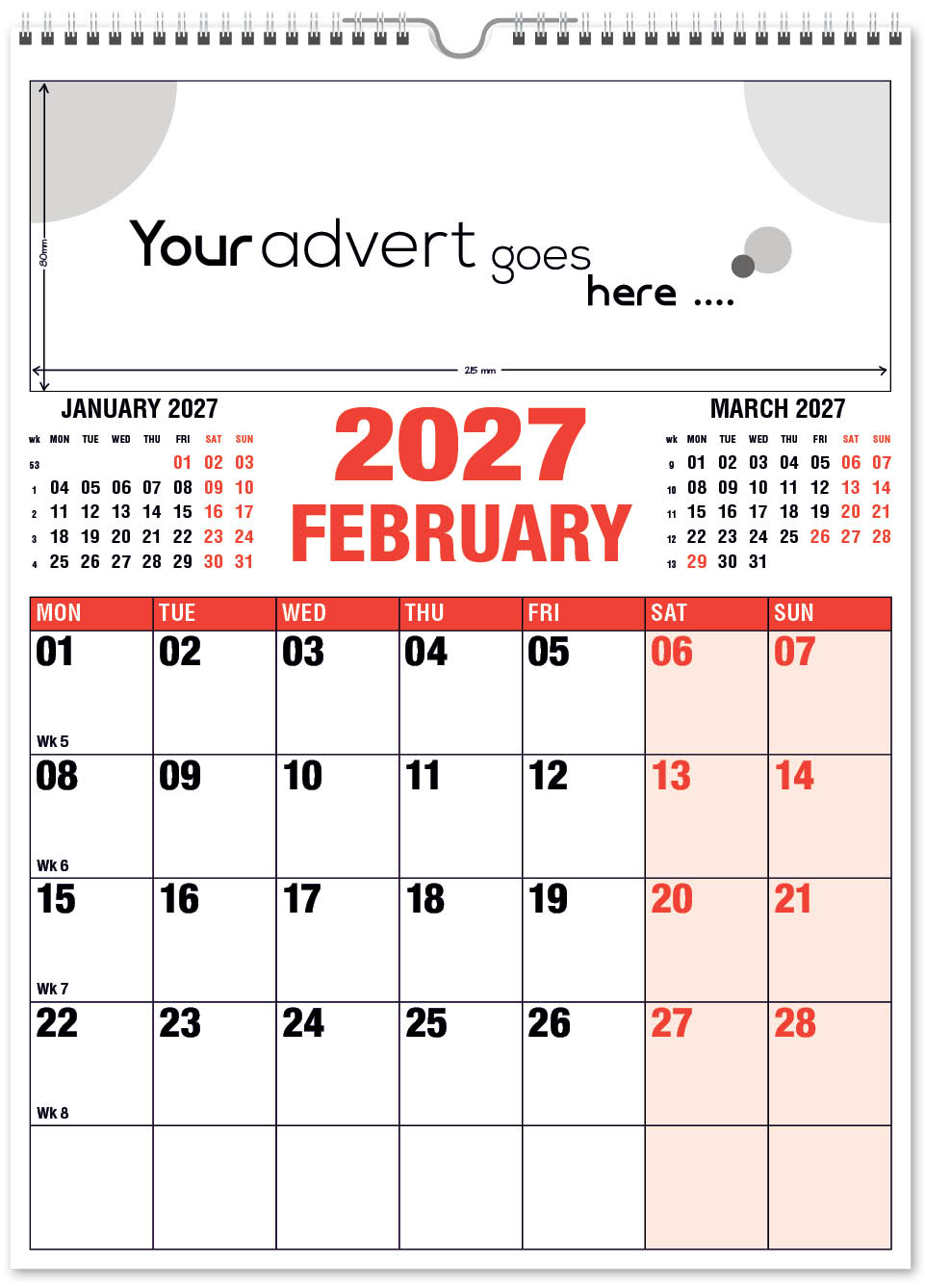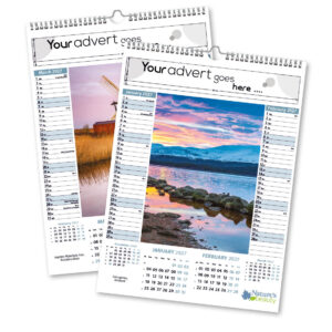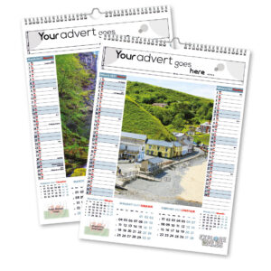 Each calendar comes with an advert section. It is this section that we replace with your personalised company advert that either we design for you, or you supply to us. This section can be seen on our range’s images titled “Your advert goes here”.