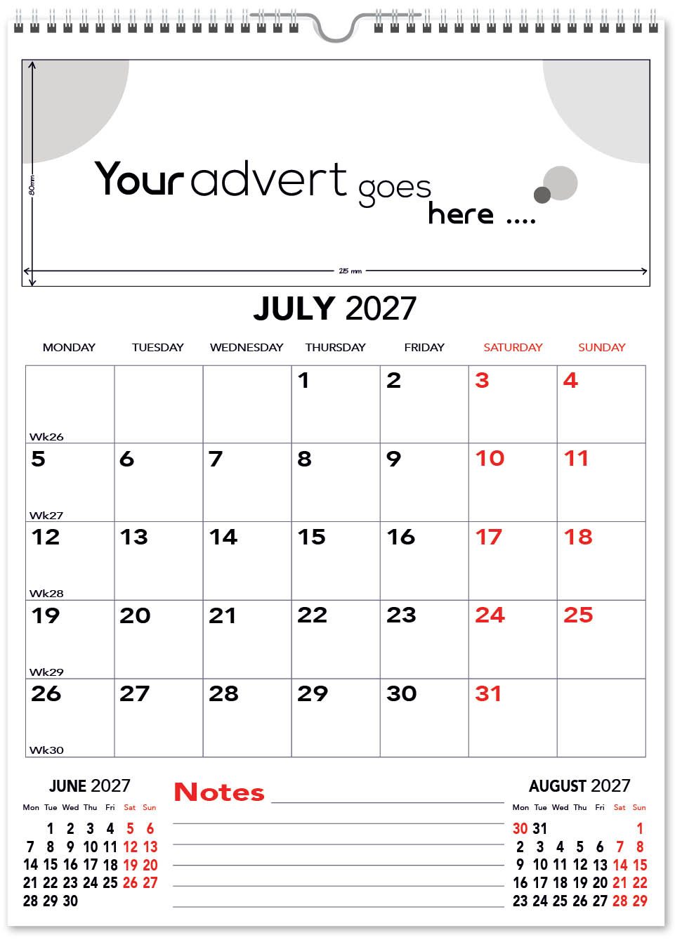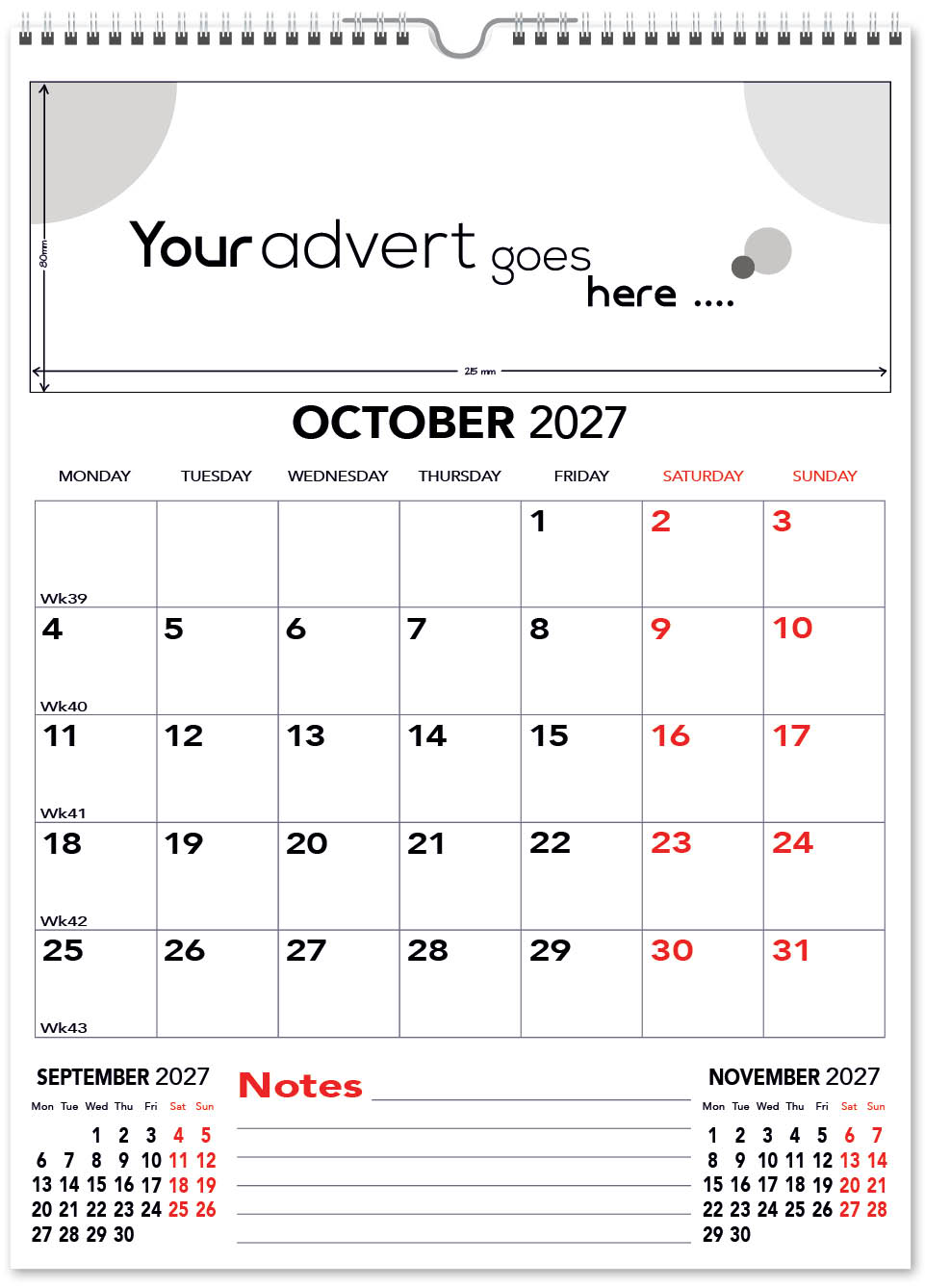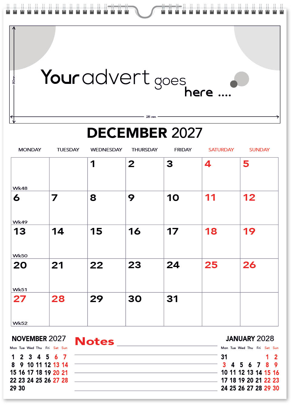 Each calendar comes with an advert section. It is this section that we replace with your personalised company advert that either we design for you, or you supply to us. This section can be seen on our range’s images titled “Your advert goes here”.