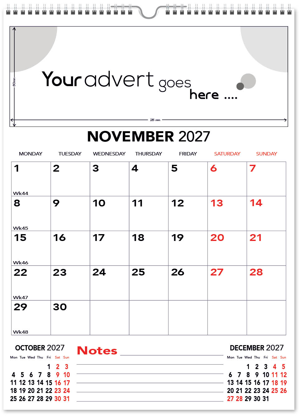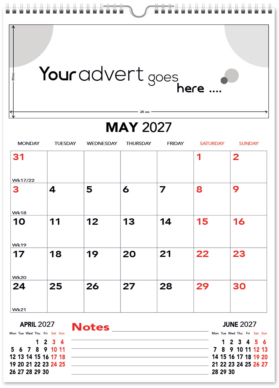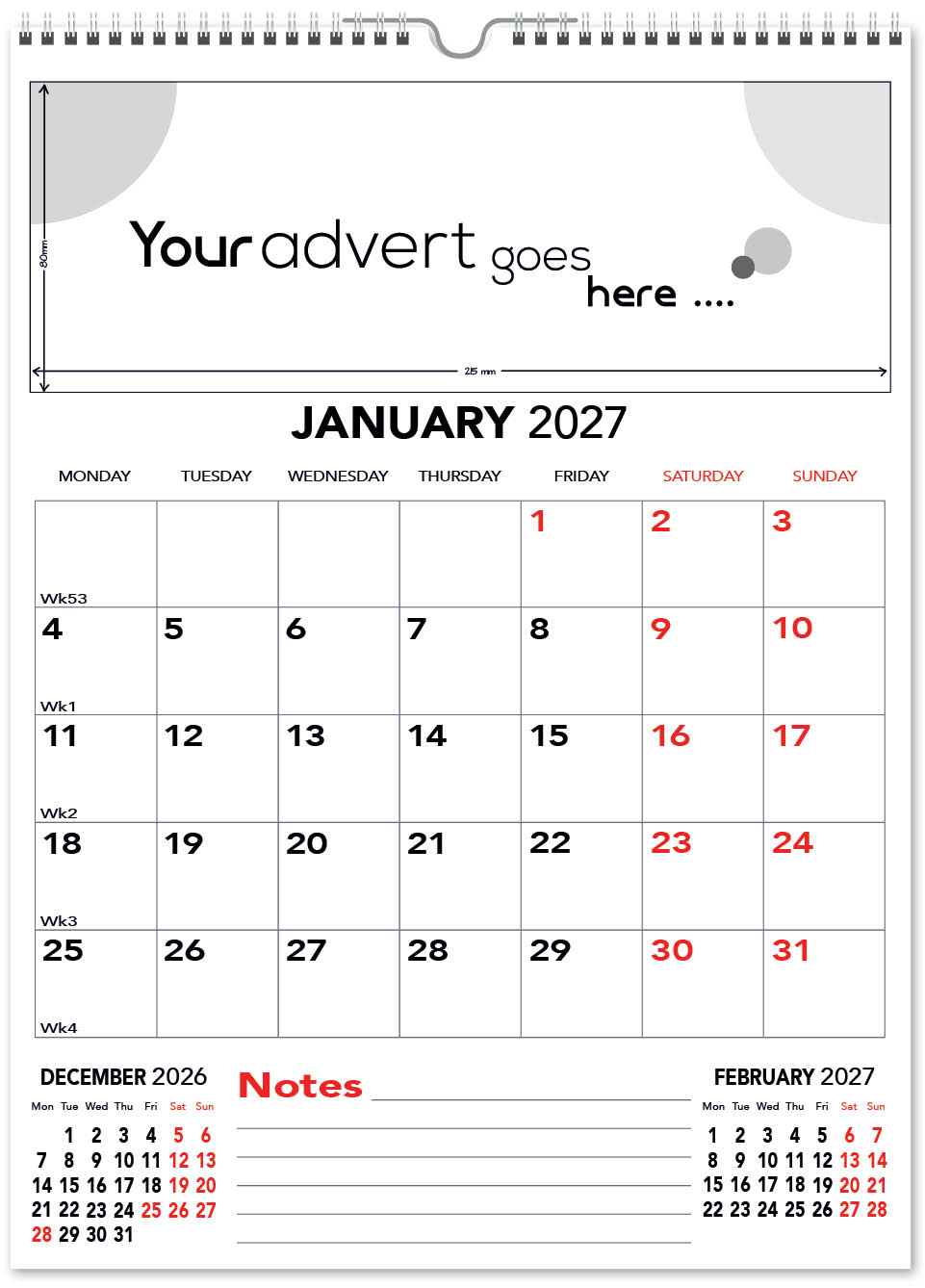 Each calendar comes with an advert section. It is this section that we replace with your personalised company advert that either we design for you, or you supply to us. This section can be seen on our range’s images titled “Your advert goes here”.