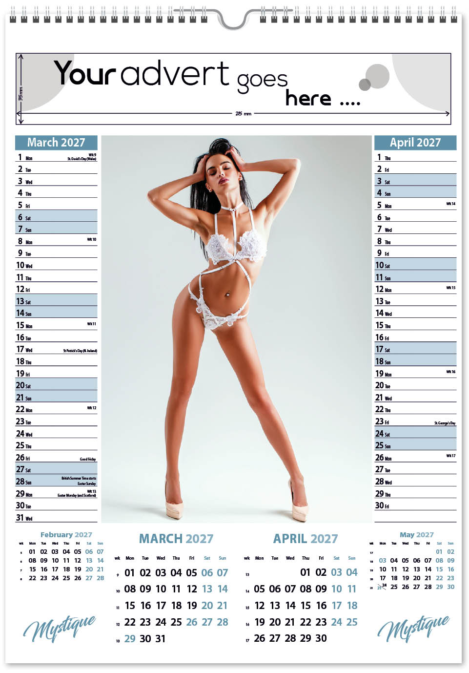 Each calendar comes with an advert section. It is this section that we replace with your personalised company advert that either we design for you, or you supply to us. This section can be seen on our range’s images titled “Your advert goes here”.