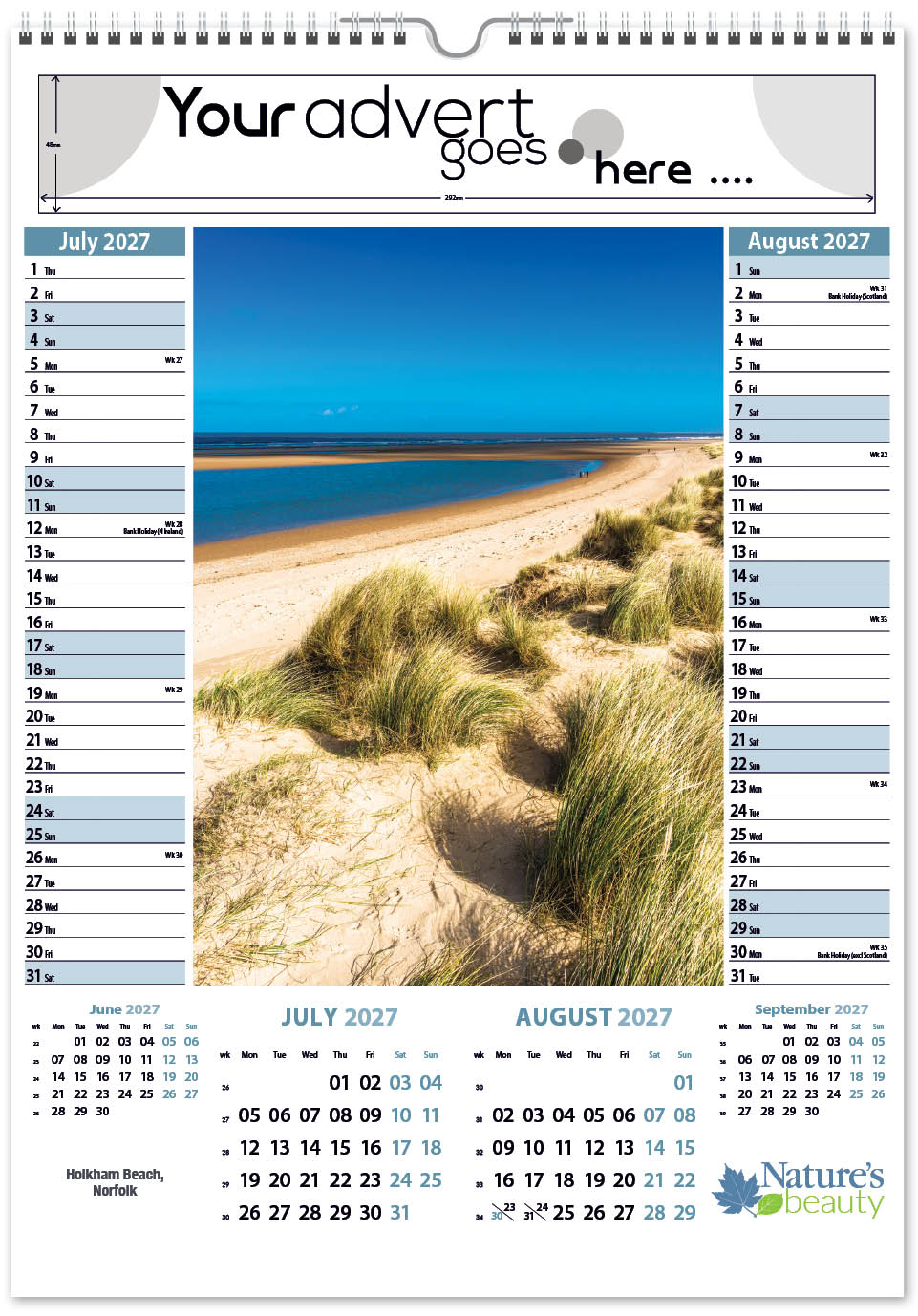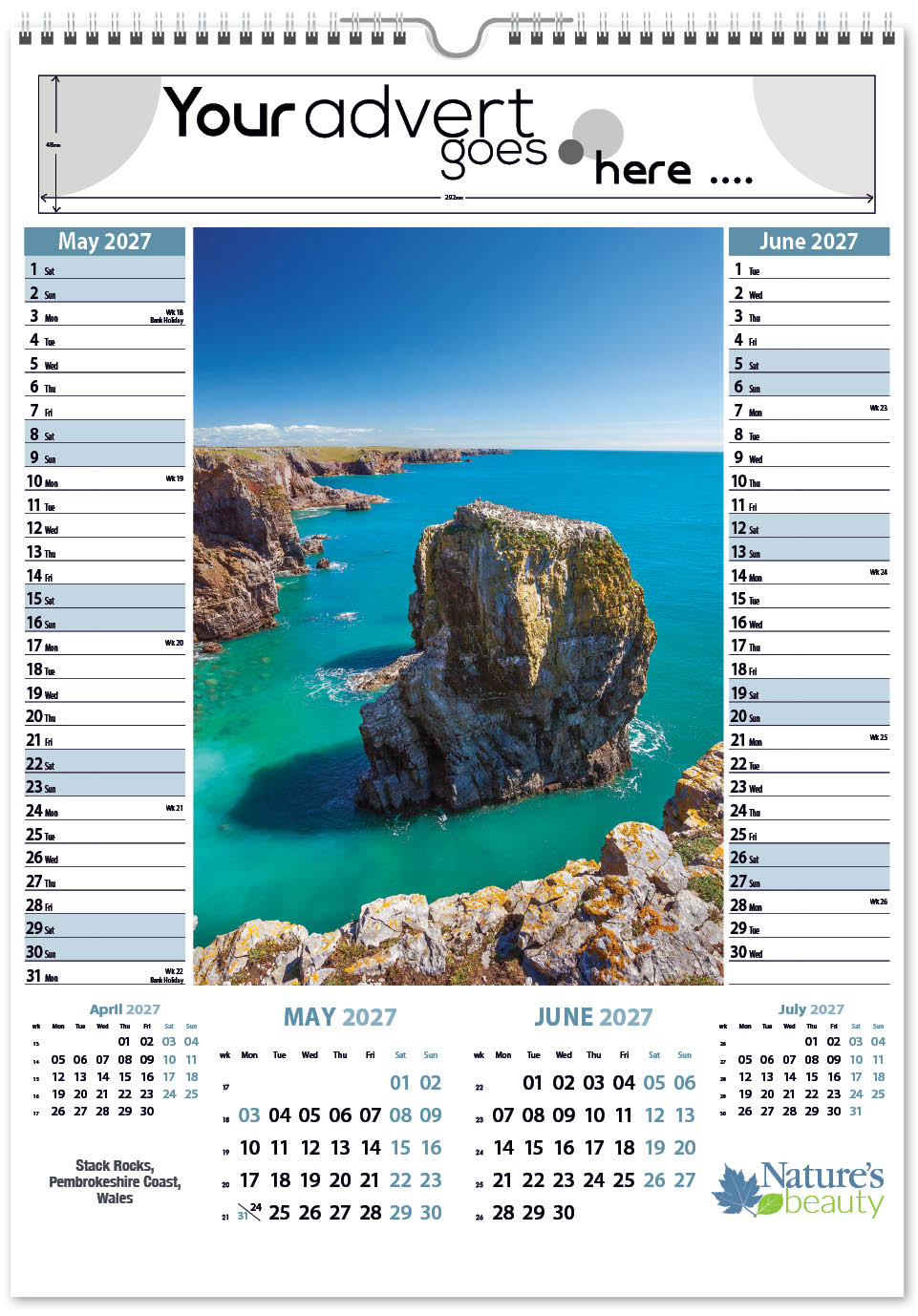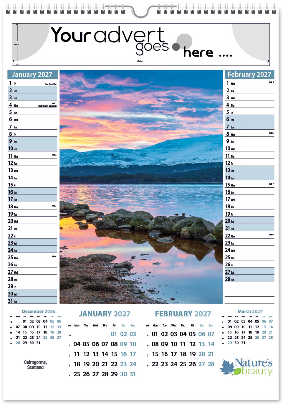 Each calendar comes with an advert section. It is this section that we replace with your personalised company advert that either we design for you, or you supply to us. This section can be seen on our range’s images titled “Your advert goes here”.