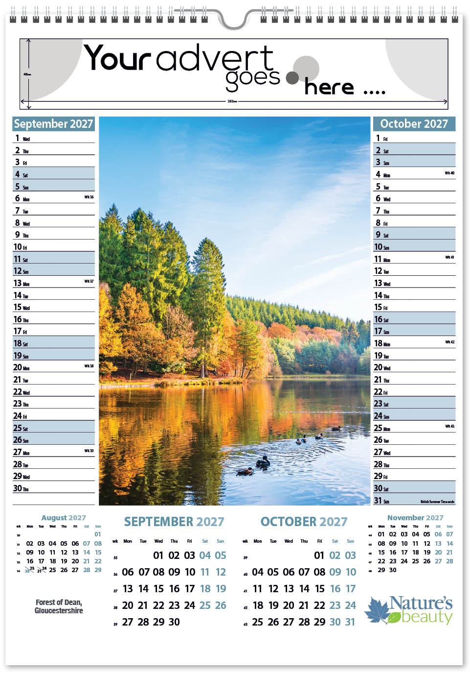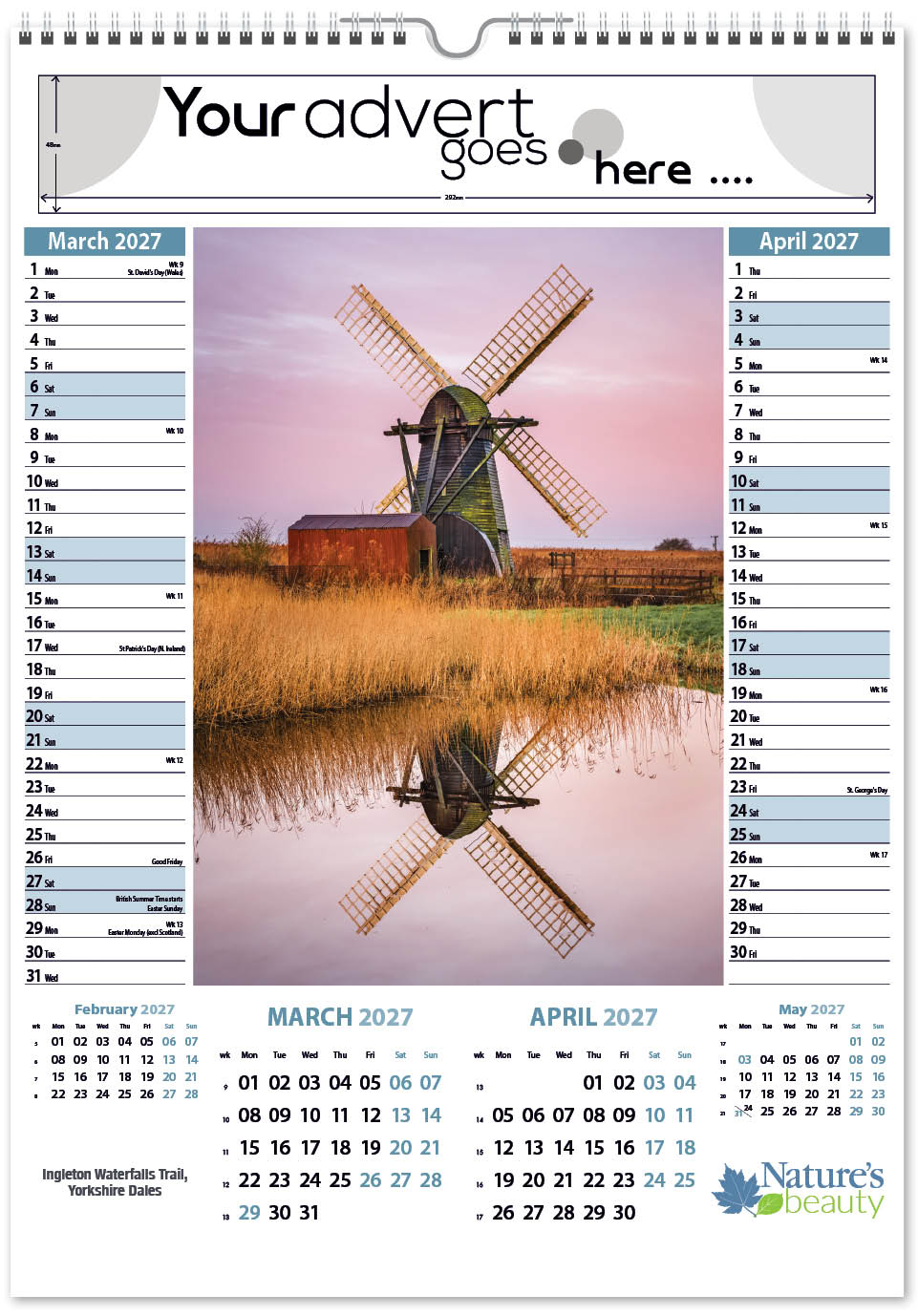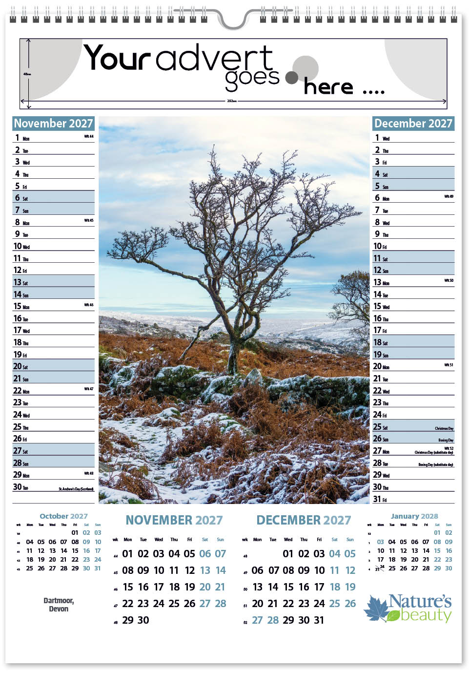 Each calendar comes with an advert section. It is this section that we replace with your personalised company advert that either we design for you, or you supply to us. This section can be seen on our range’s images titled “Your advert goes here”.