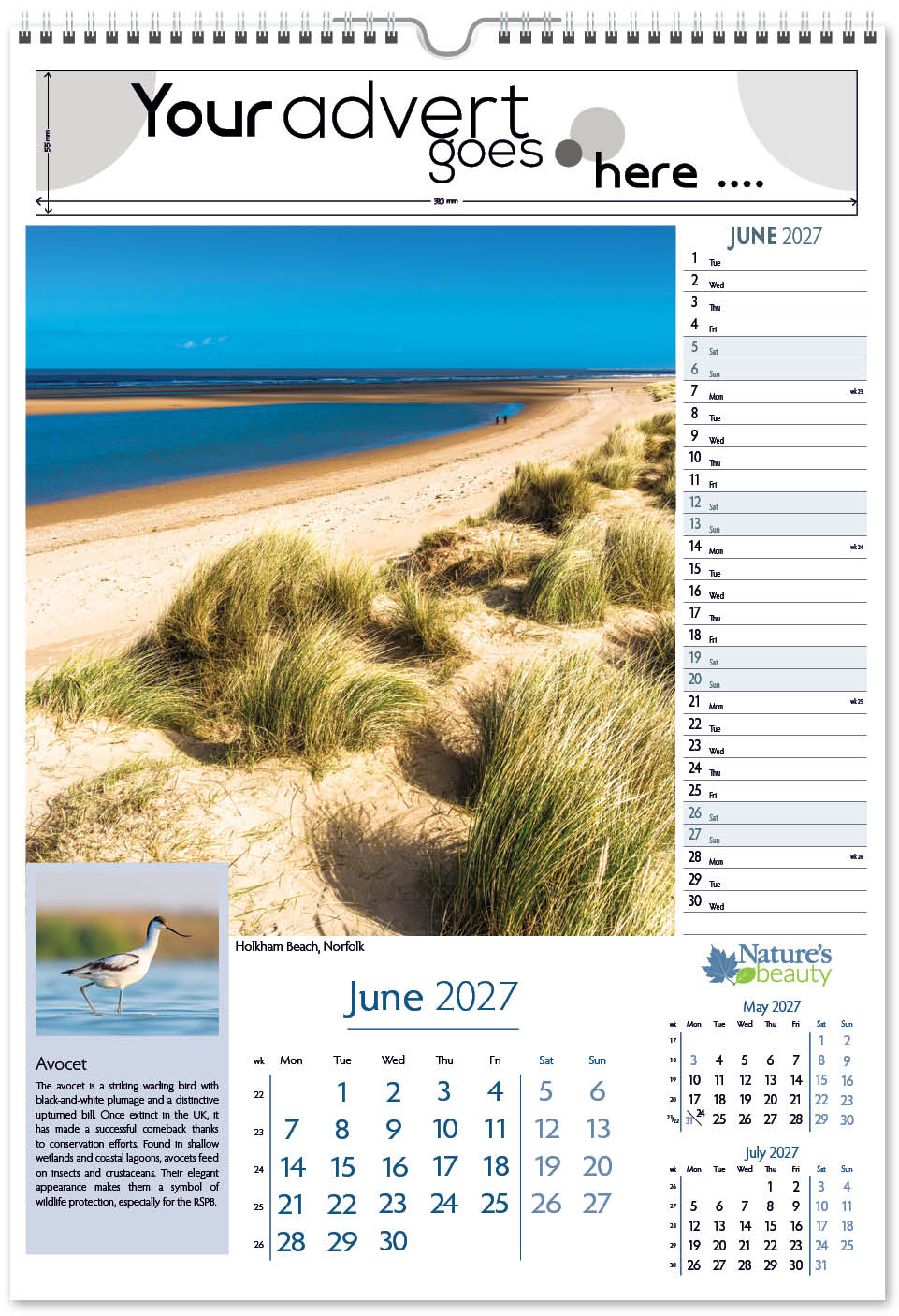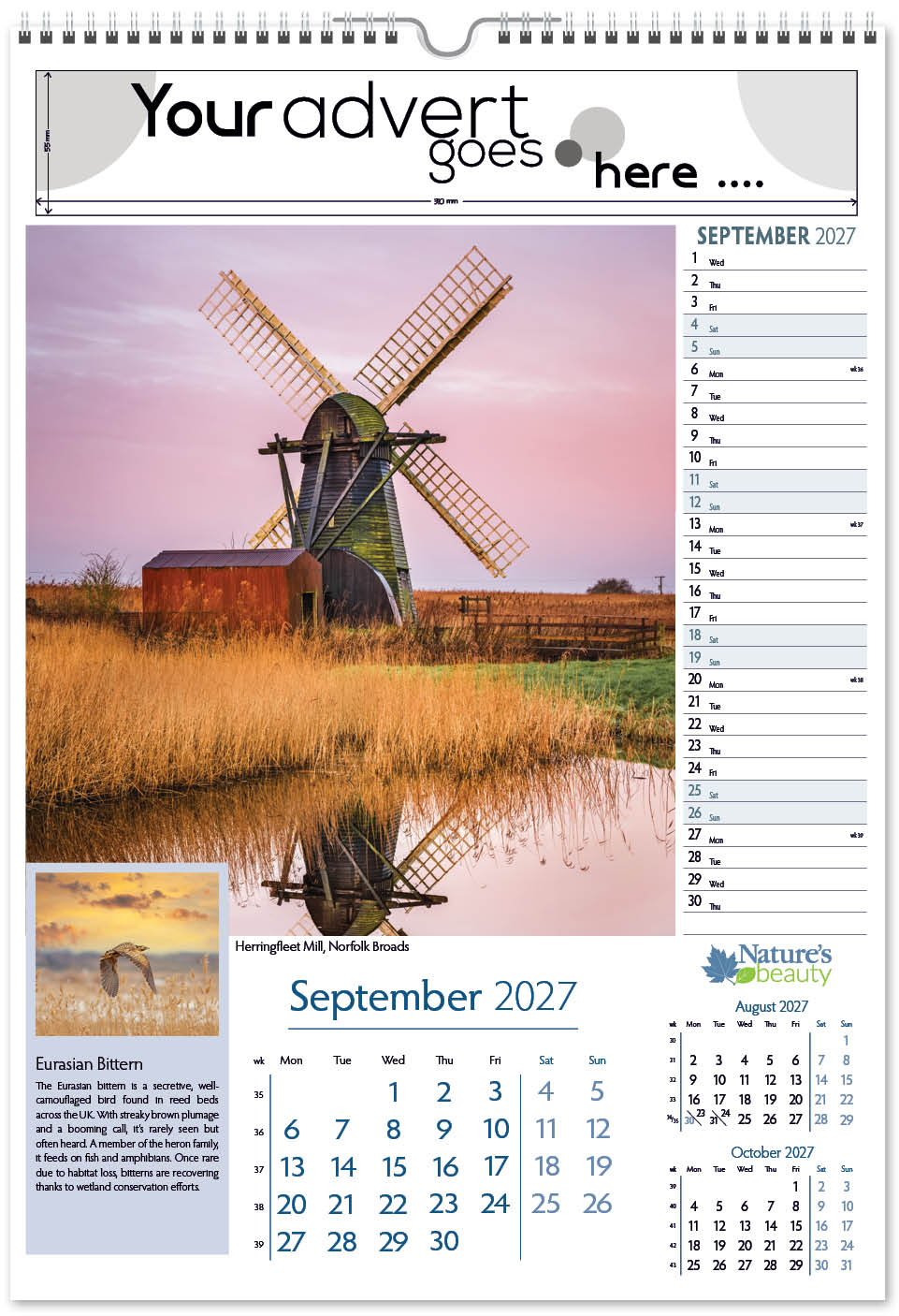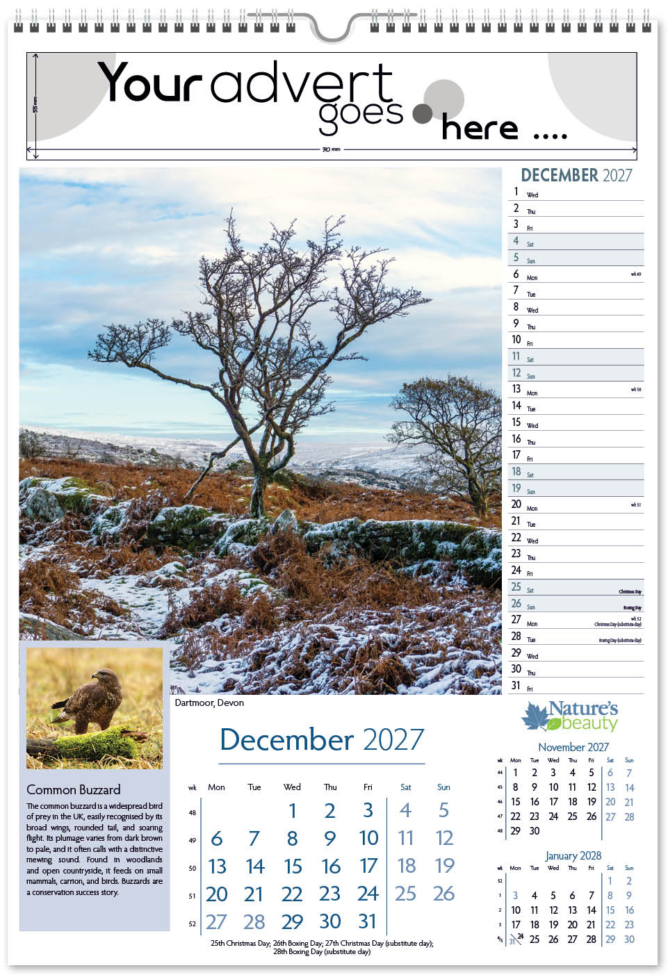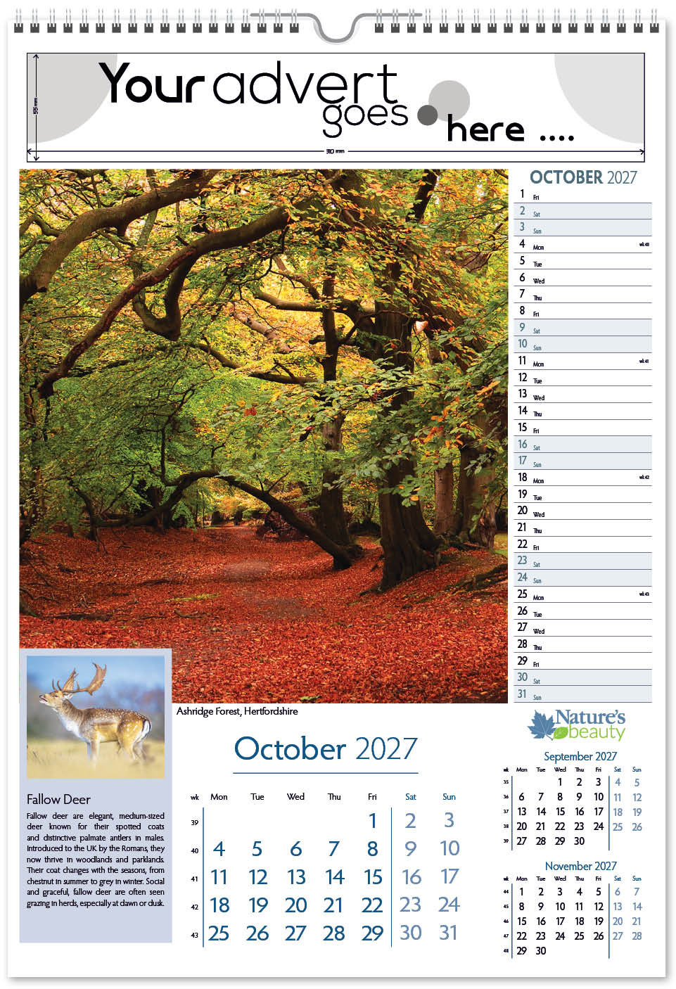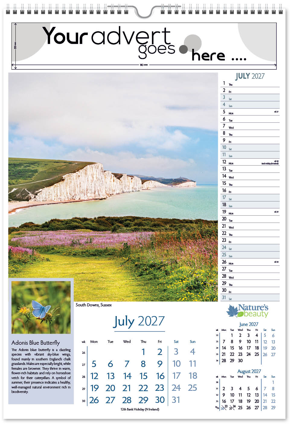 Each calendar comes with an advert section. It is this section that we replace with your personalised company advert that either we design for you, or you supply to us. This section can be seen on our range’s images titled “Your advert goes here”.