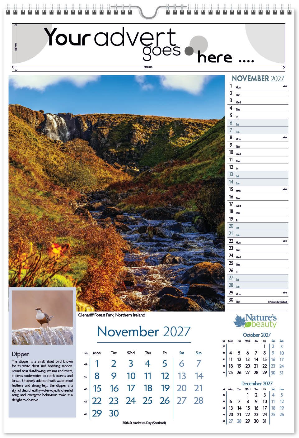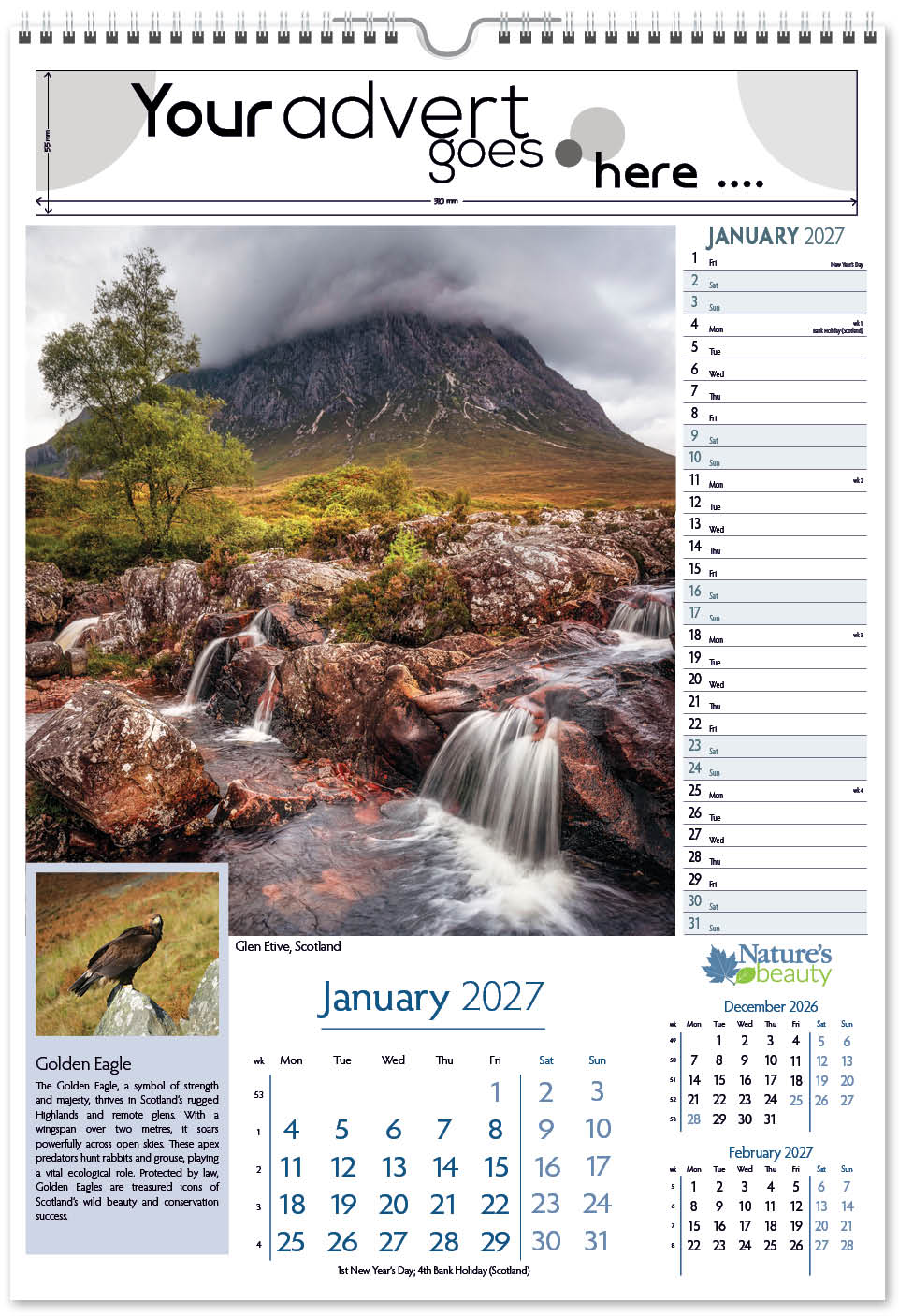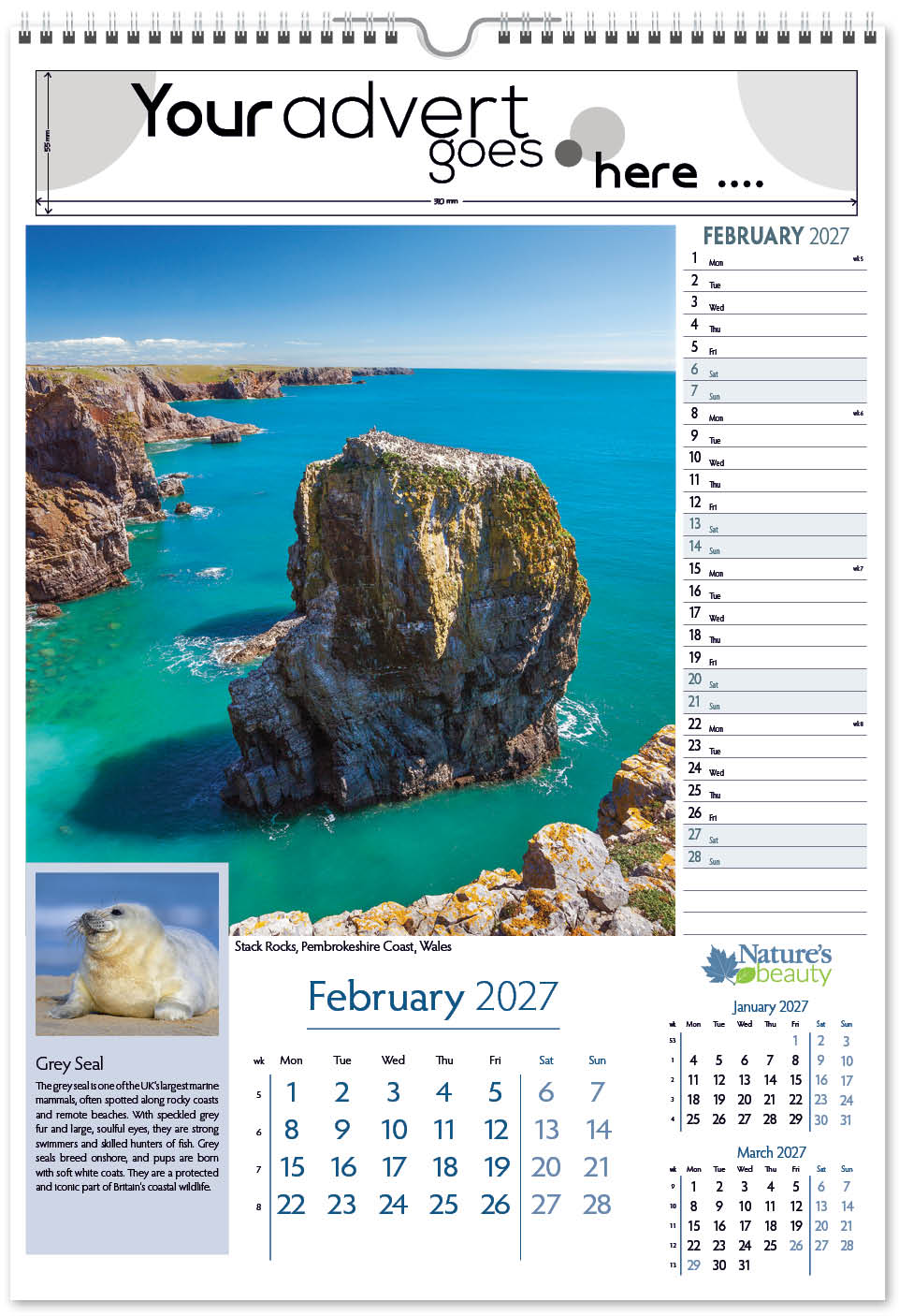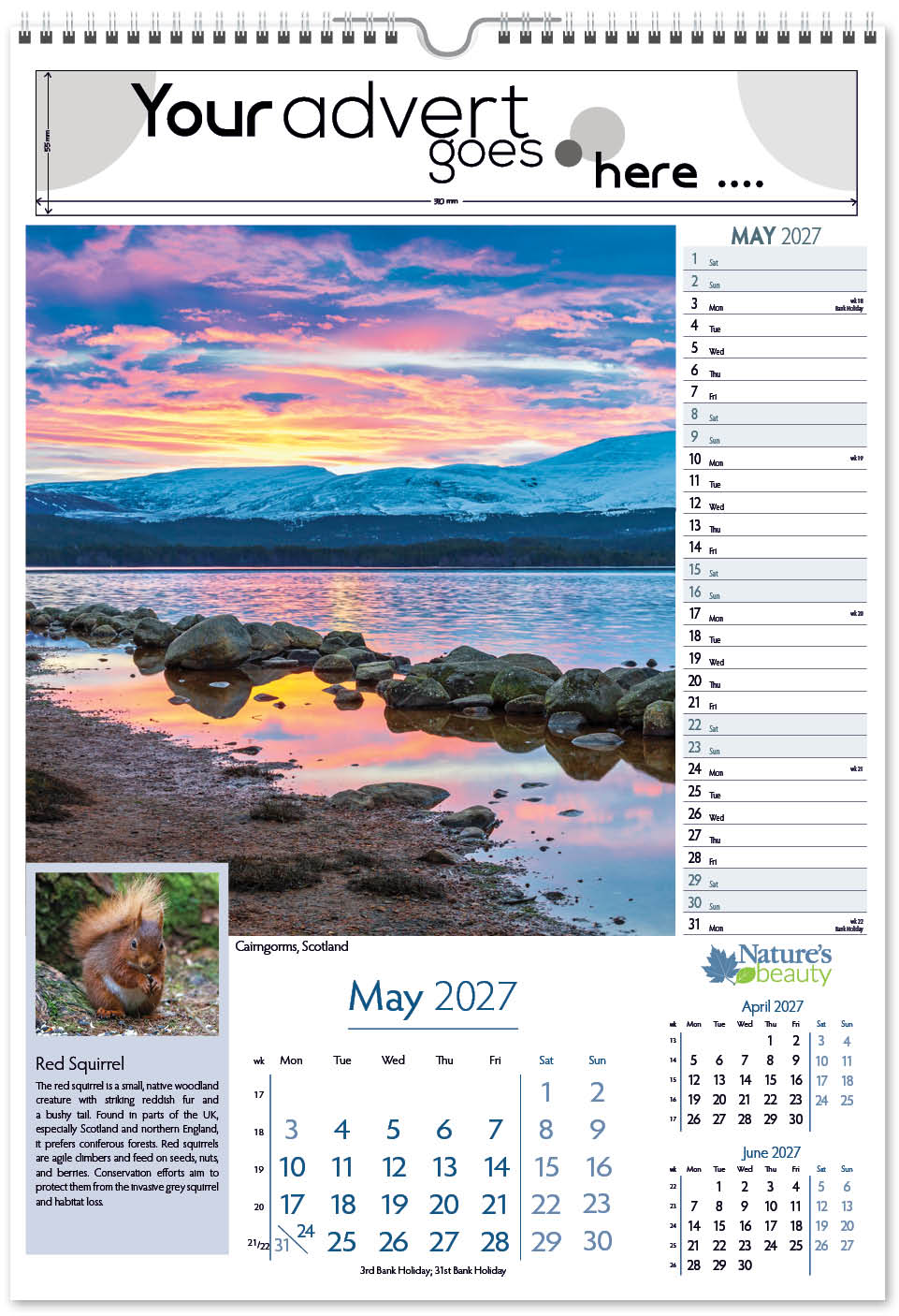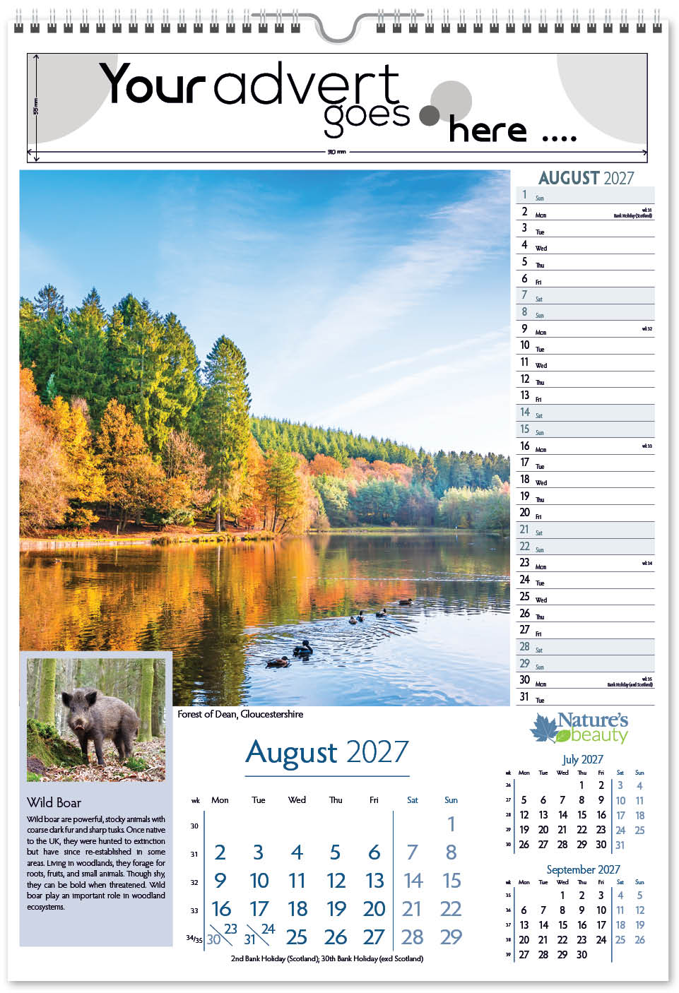 Each calendar comes with an advert section. It is this section that we replace with your personalised company advert that either we design for you, or you supply to us. This section can be seen on our range’s images titled “Your advert goes here”.