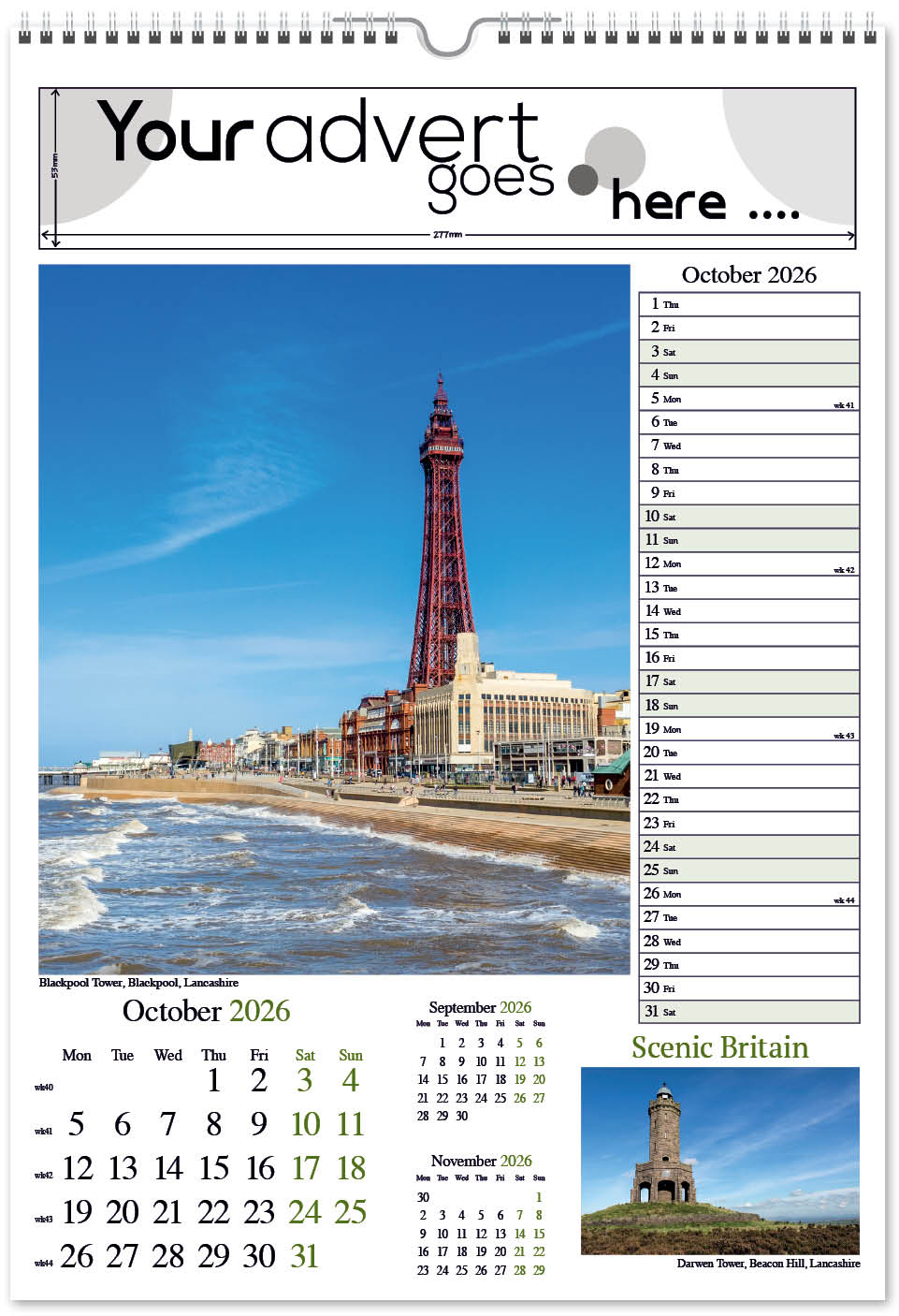 Each calendar comes with an advert section. It is this section that we replace with your personalised company advert that either we design for you, or you supply to us. This section can be seen on our range’s images titled “Your advert goes here”.