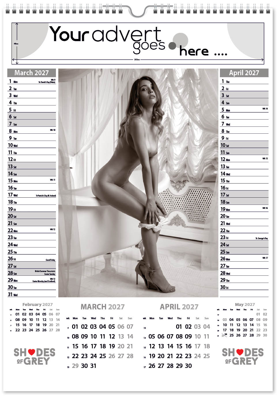 Each calendar comes with an advert section. It is this section that we replace with your personalised company advert that either we design for you, or you supply to us. This section can be seen on our range’s images titled “Your advert goes here”.