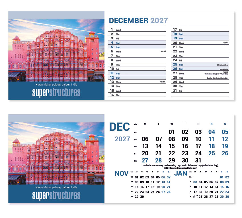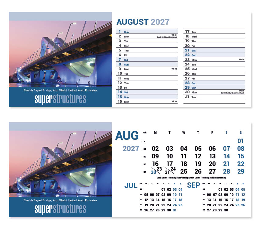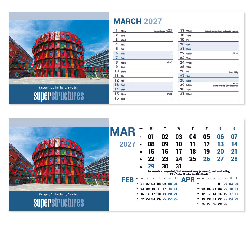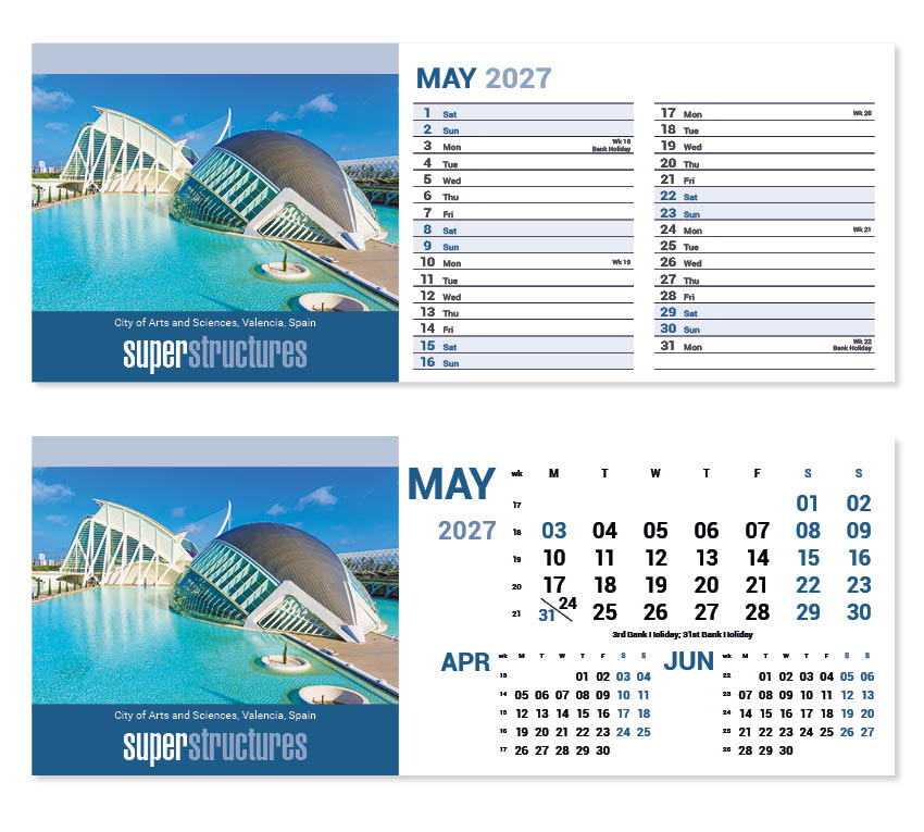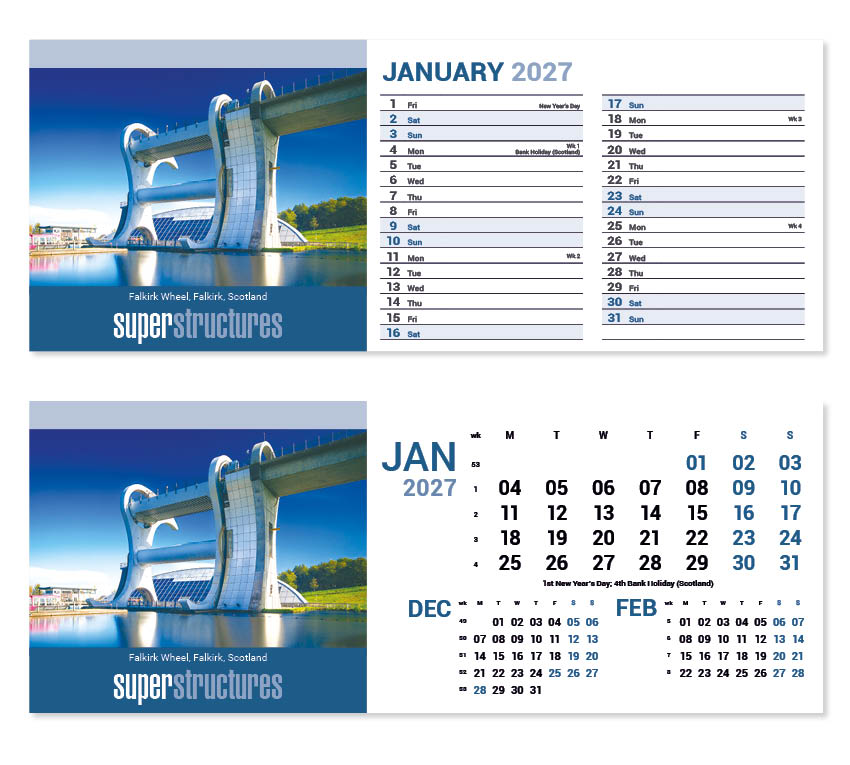 Our Super Structures Desk Calendar showcases stunning and awe-inspiring architecture from around the world. A corresponding wall calendar is also available. All our desk calendars are printed on both sides, each side in a different format – either a simple date pad with a larger image, or a space for notes and appointments with a slightly smaller image. Thicker premium 250gsm weight paper and varnished leaves and cover make desk calendars very appealing, and they save on postage – being Royal Mail ‘Large Letter’ size.