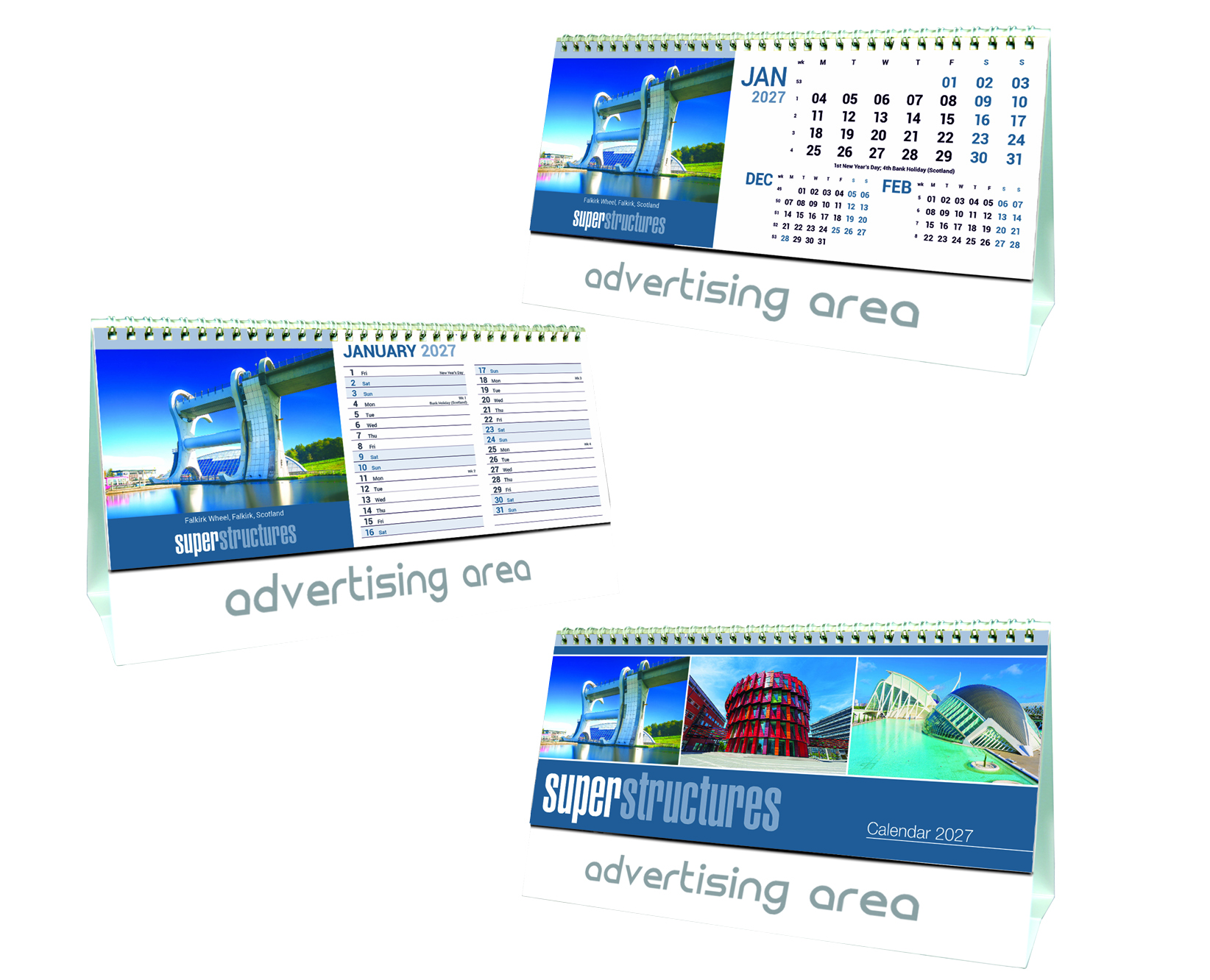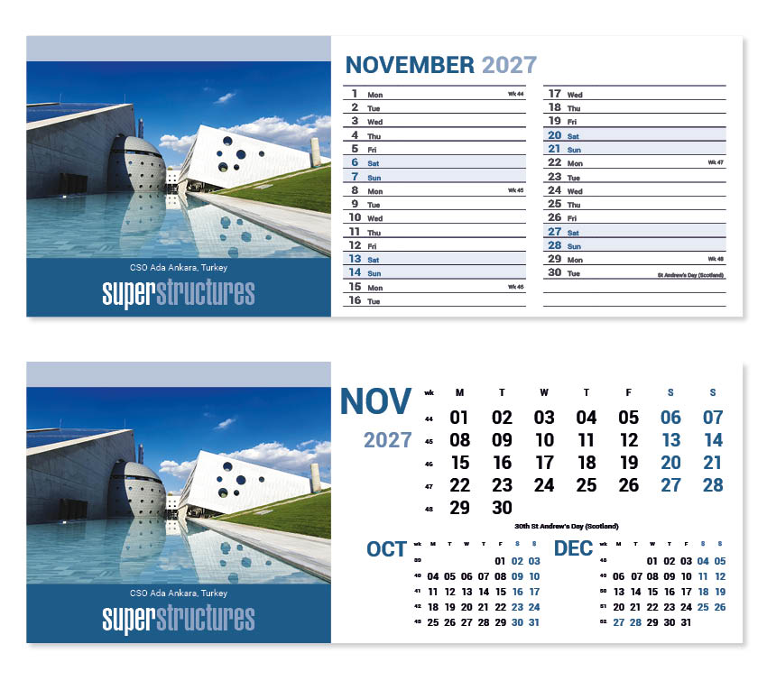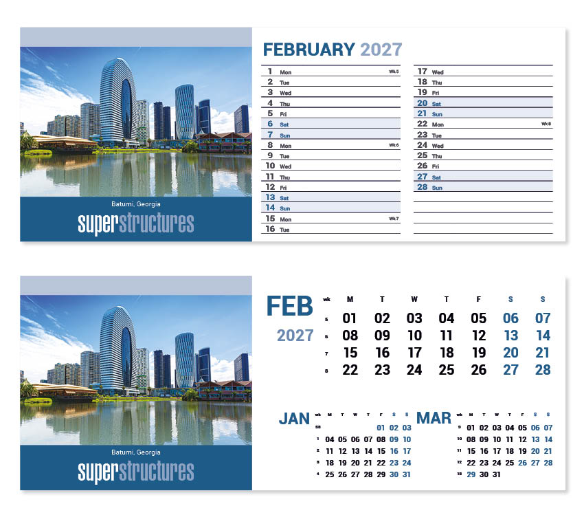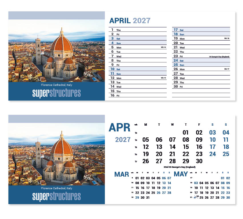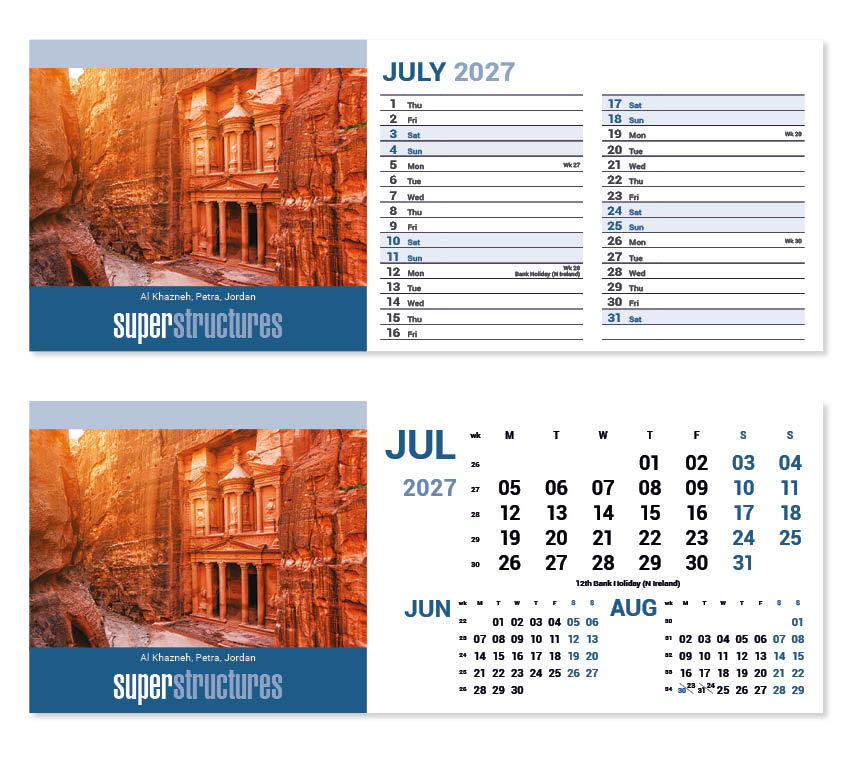 Our Super Structures Desk Calendar showcases stunning and awe-inspiring architecture from around the world. A corresponding wall calendar is also available. All our desk calendars are printed on both sides, each side in a different format – either a simple date pad with a larger image, or a space for notes and appointments with a slightly smaller image. Thicker premium 250gsm weight paper and varnished leaves and cover make desk calendars very appealing, and they save on postage – being Royal Mail ‘Large Letter’ size.