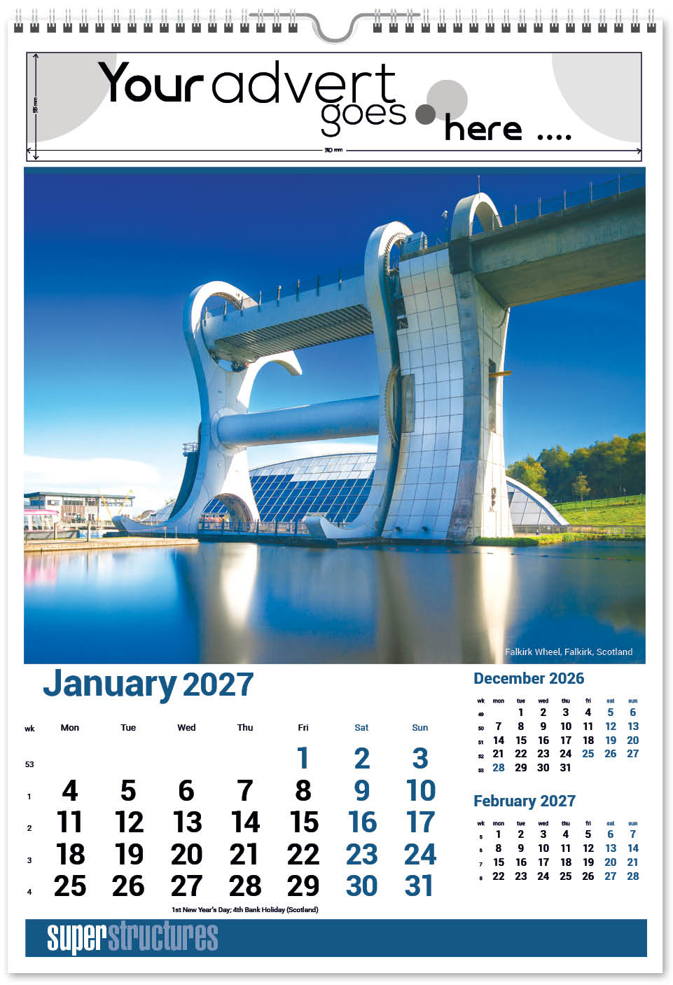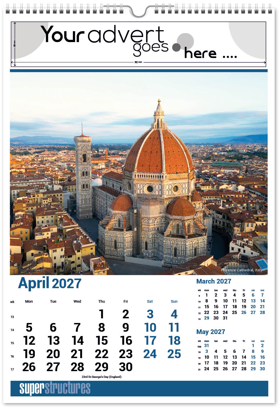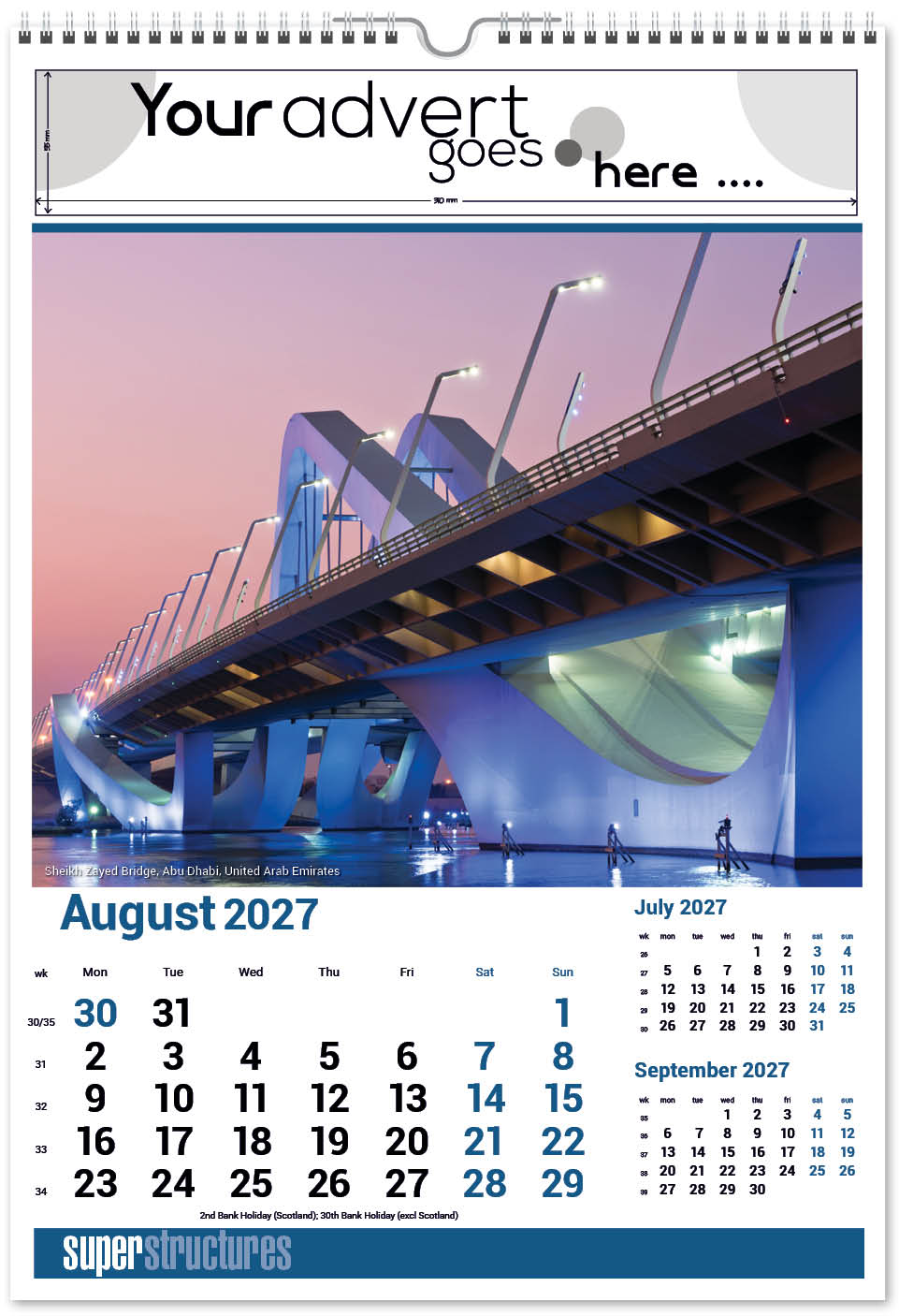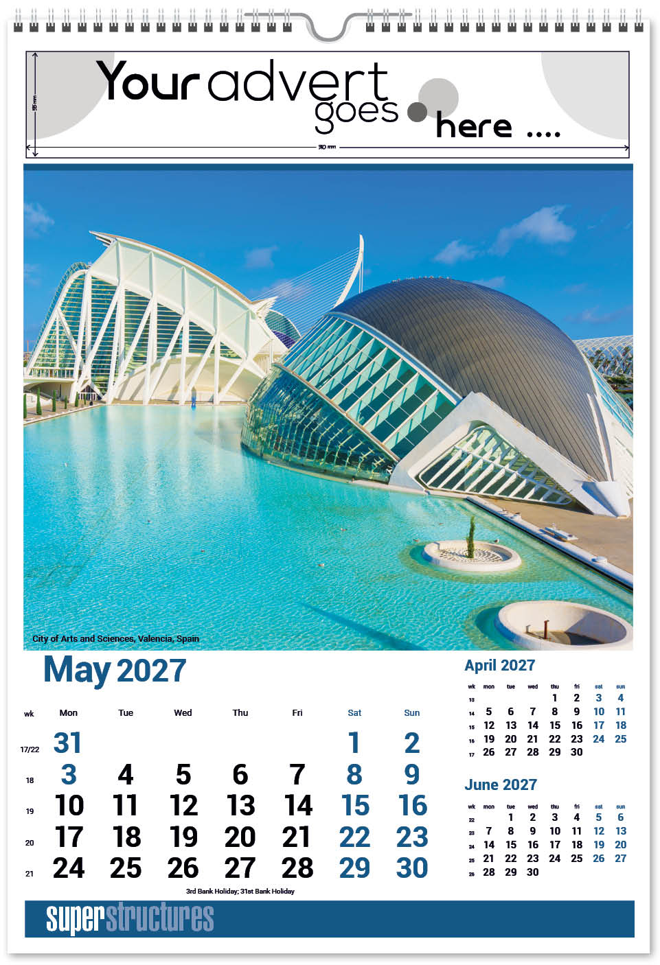 Our Super Structures Wall Calendar showcases stunning and awe-inspiring architecture from around the world. Each page also has a iconic inset image to complement the main image. The image area is large so your eye is drawn to the interesting image and then to your company advert above. A corresponding desk calendar is also available.