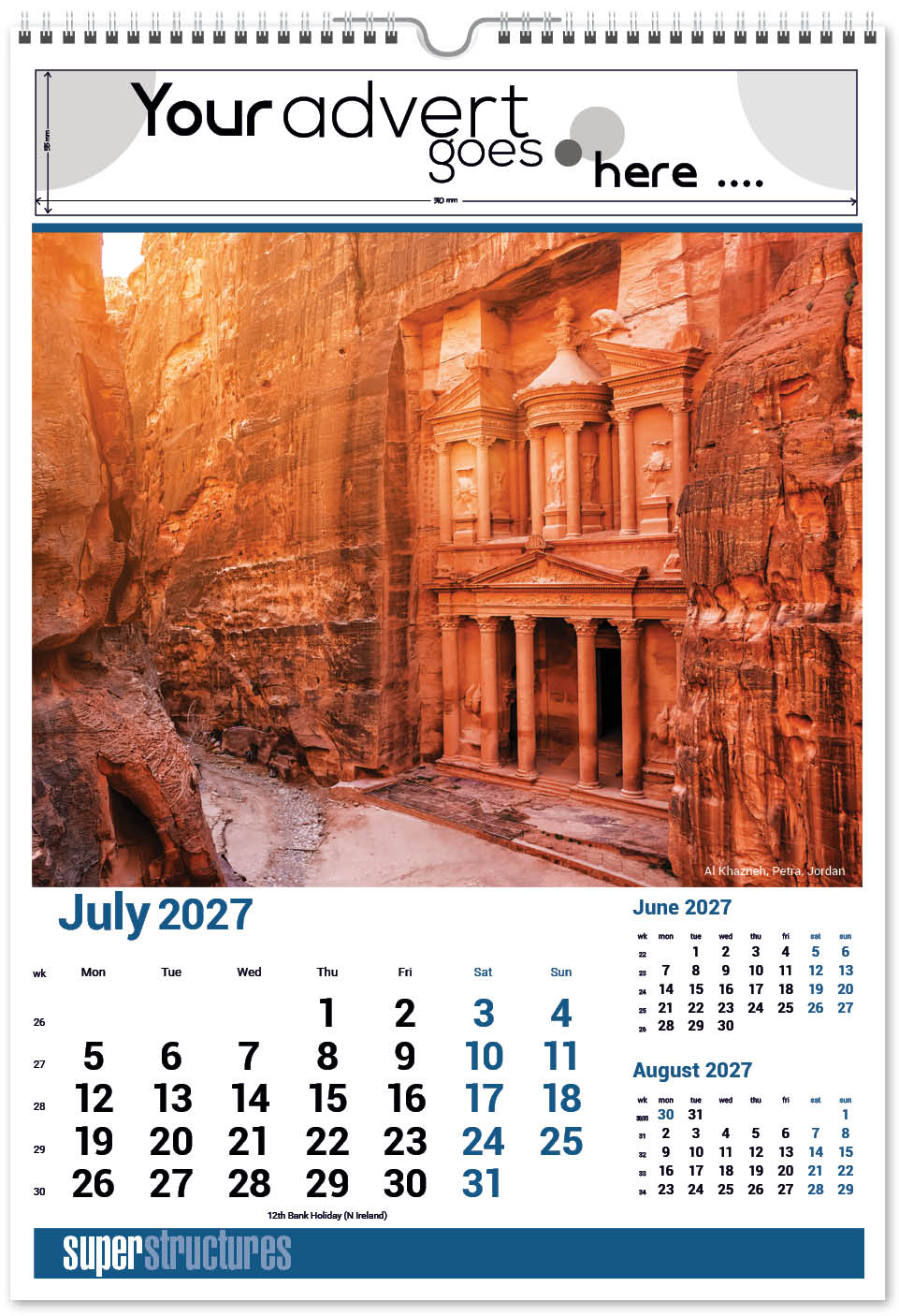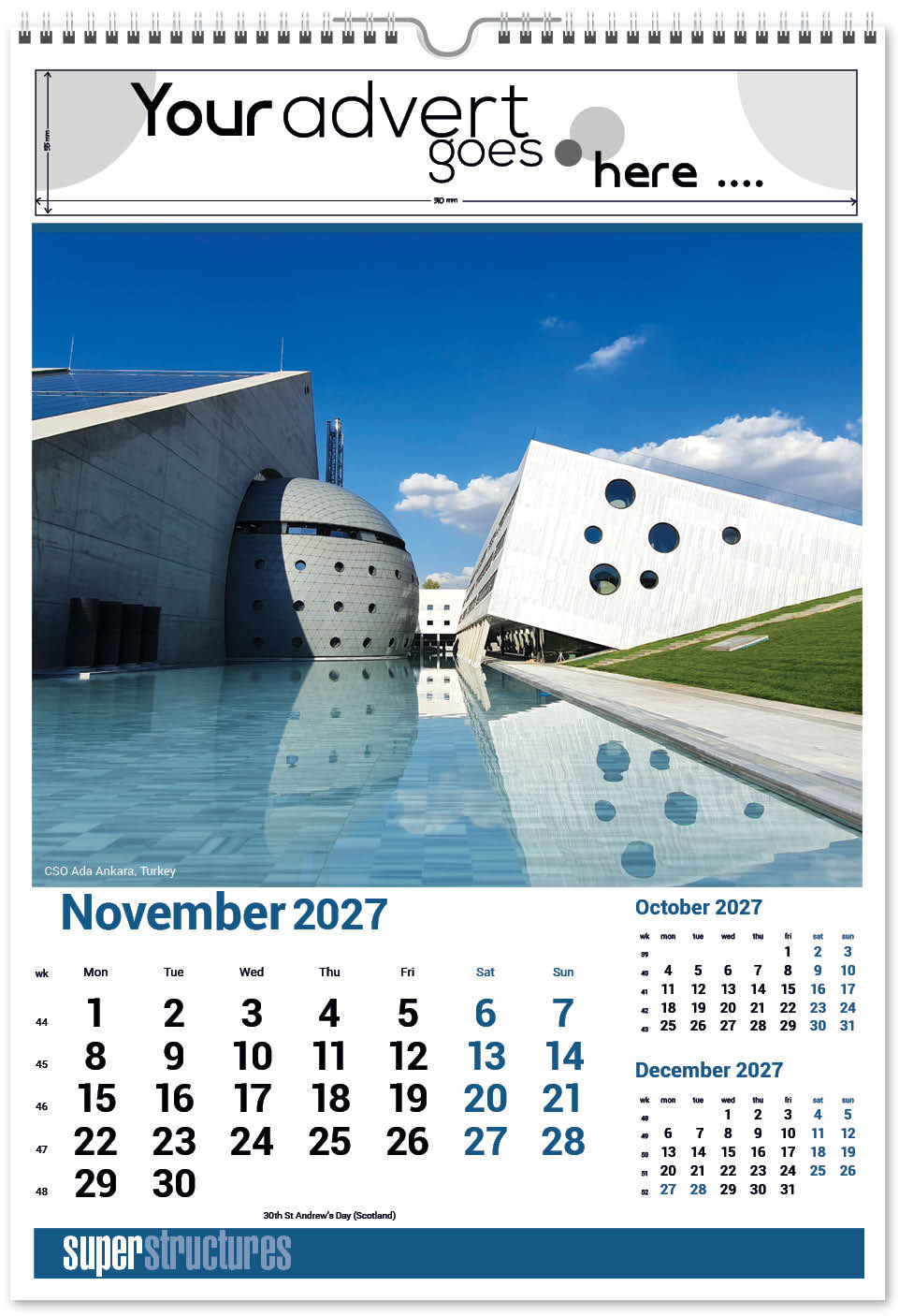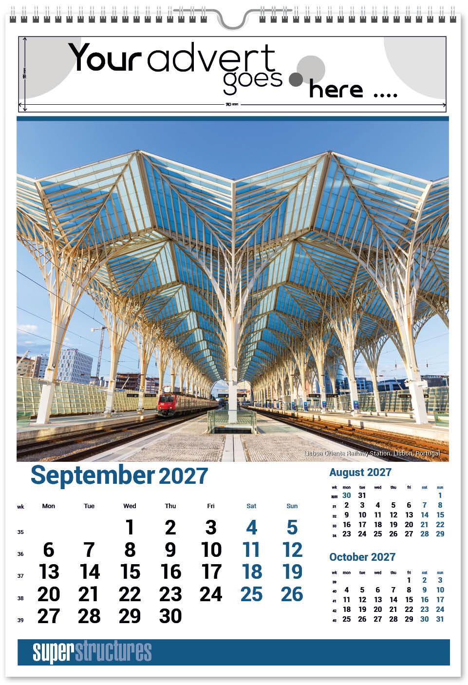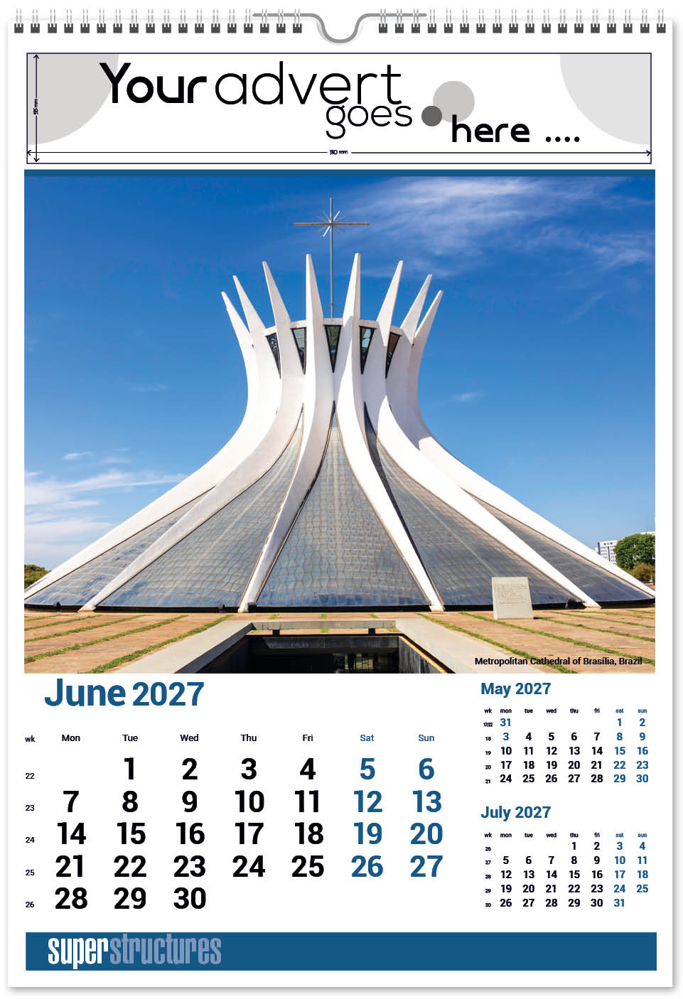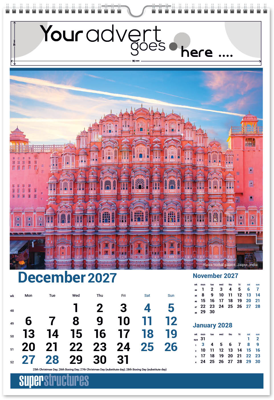 Our Super Structures Wall Calendar showcases stunning and awe-inspiring architecture from around the world. Each page also has a iconic inset image to complement the main image. The image area is large so your eye is drawn to the interesting image and then to your company advert above. A corresponding desk calendar is also available.