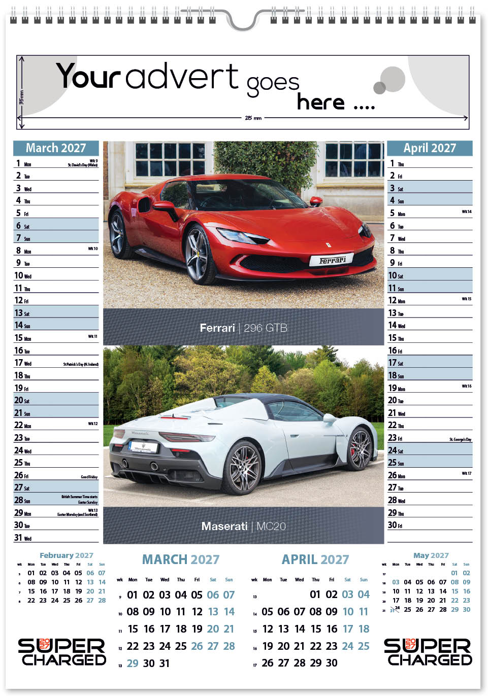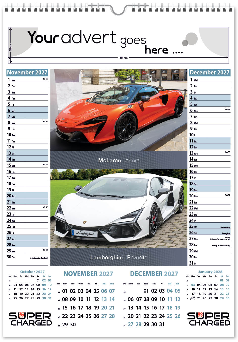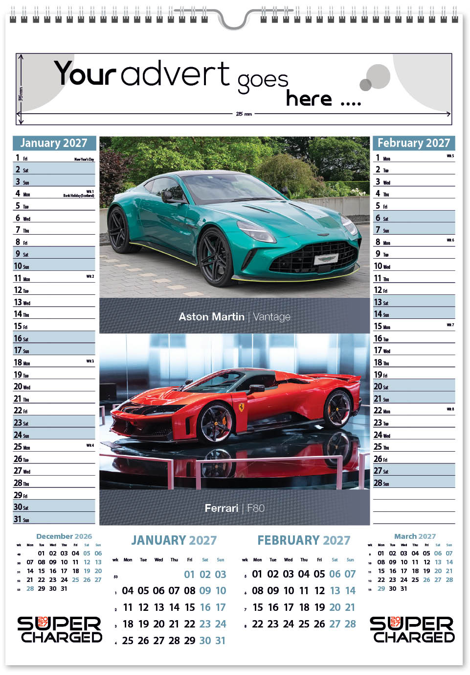 High performance Supercars feature in this 6 leaf mini memo calendar. Two stunning cars are featured per page with facts on their performance, design and speed.  All in an economical Royal Mail ‘Large Letter’ size.