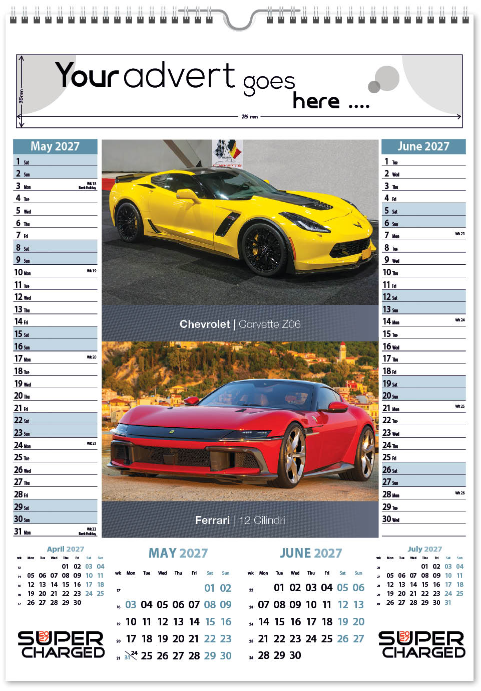 Each calendar comes with an advert section. It is this section that we replace with your personalised company advert that either we design for you, or you supply to us. This section can be seen on our range’s images titled “Your advert goes here”.