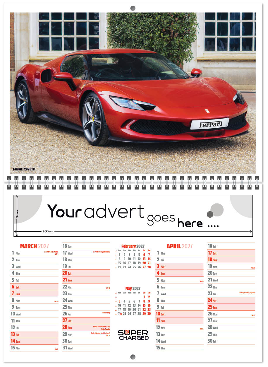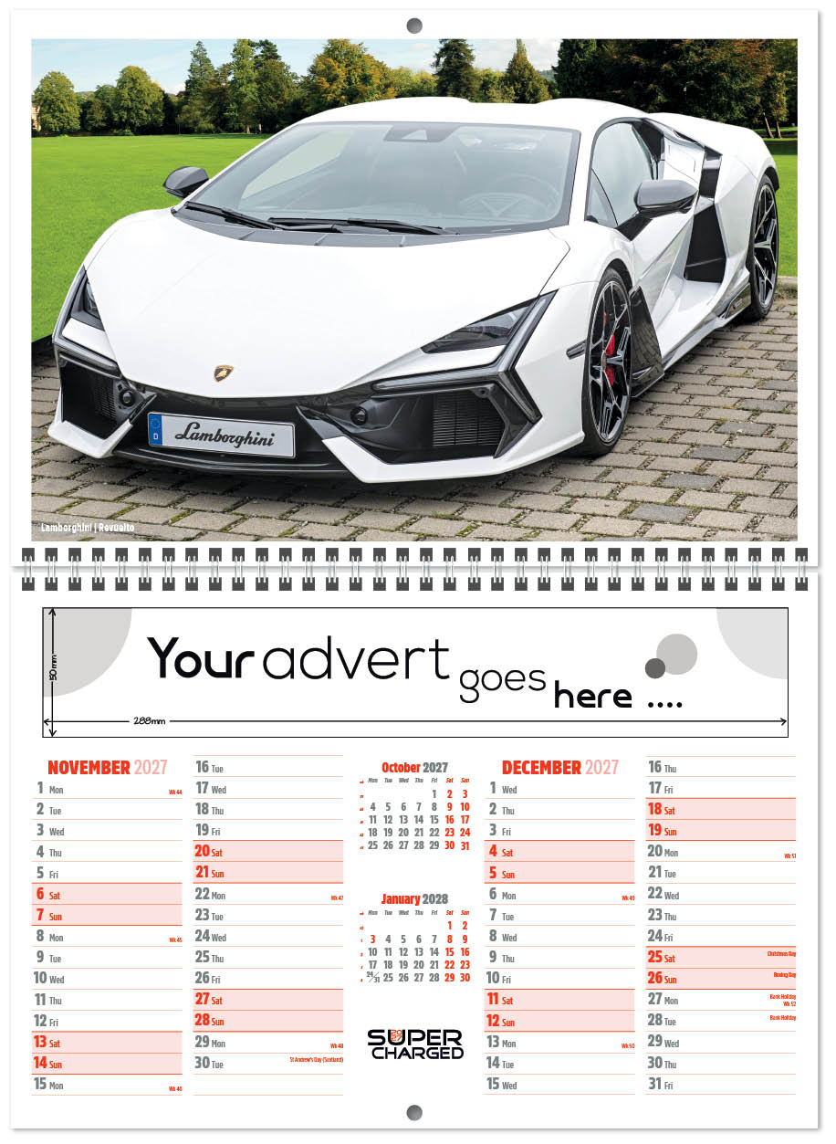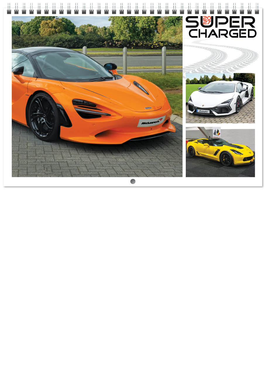 Dynamic images of exclusive Supercars, selected for power, speed and performance, are showcased in the Supercharged Central Wiro Wall Calendar.   All in an economical Royal Mail ‘Large Letter’ size to save on postage, but opens to a full size calendar.