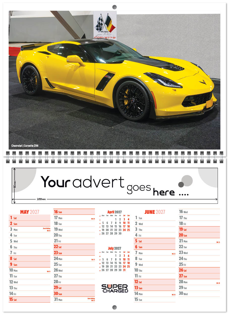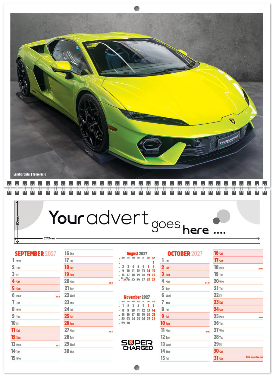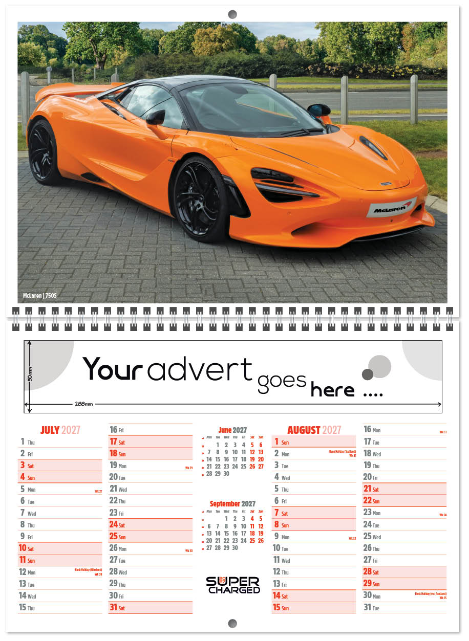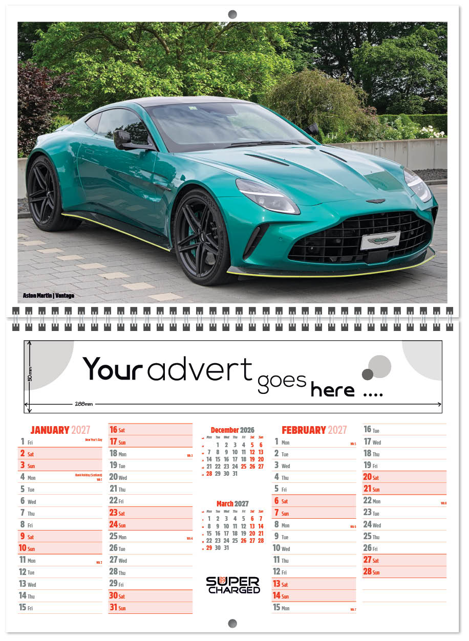 Dynamic images of exclusive Supercars, selected for power, speed and performance, are showcased in the Supercharged Central Wiro Wall Calendar.   All in an economical Royal Mail ‘Large Letter’ size to save on postage, but opens to a full size calendar.