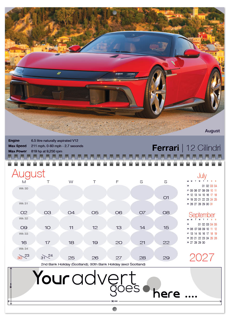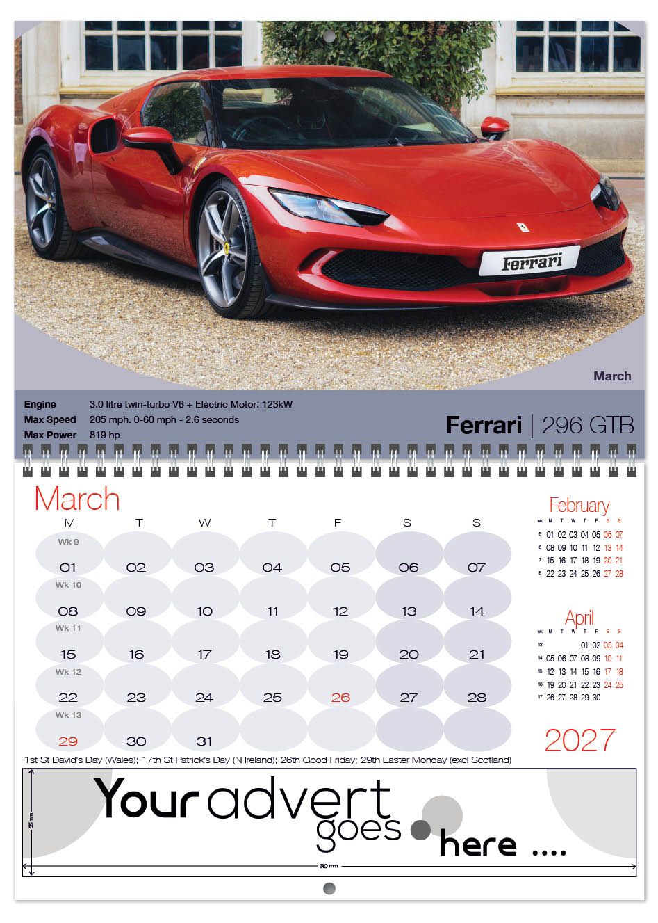 Each calendar comes with an advert section. It is this section that we replace with your personalised company advert that either we design for you, or you supply to us. This section can be seen on our range’s images titled “Your advert goes here”.
