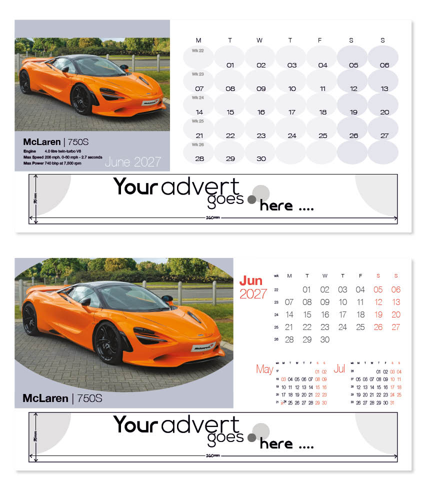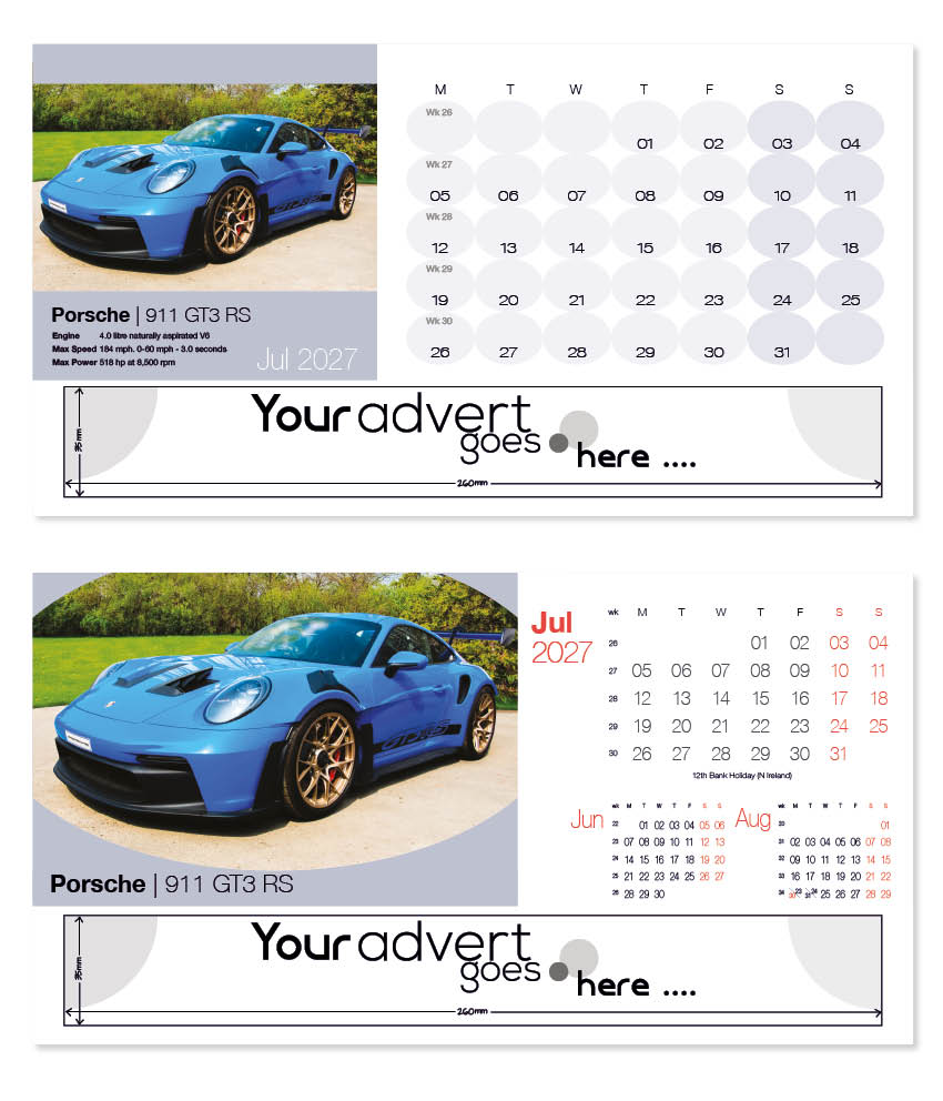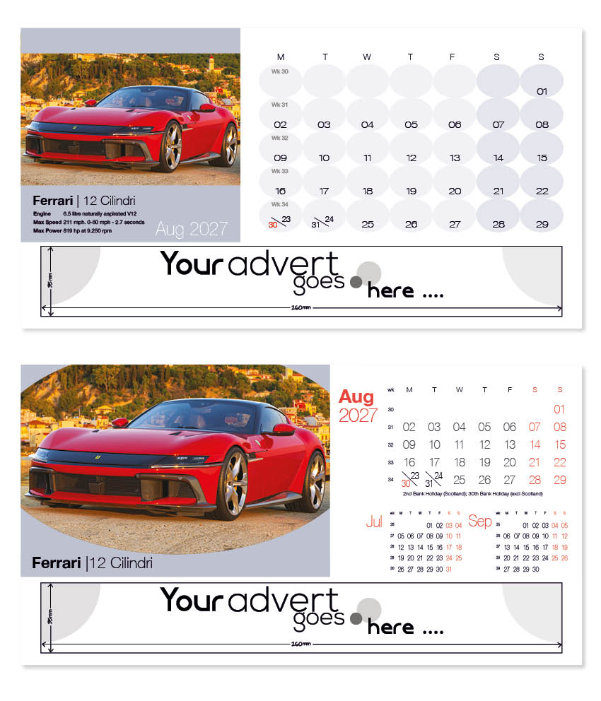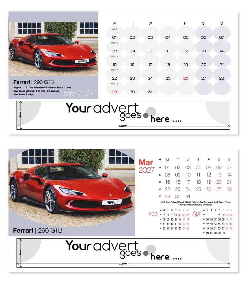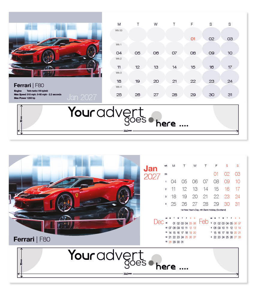 Each calendar comes with an advert section. It is this section that we replace with your personalised company advert that either we design for you, or you supply to us. This section can be seen on our range’s images titled “Your advert goes here”.